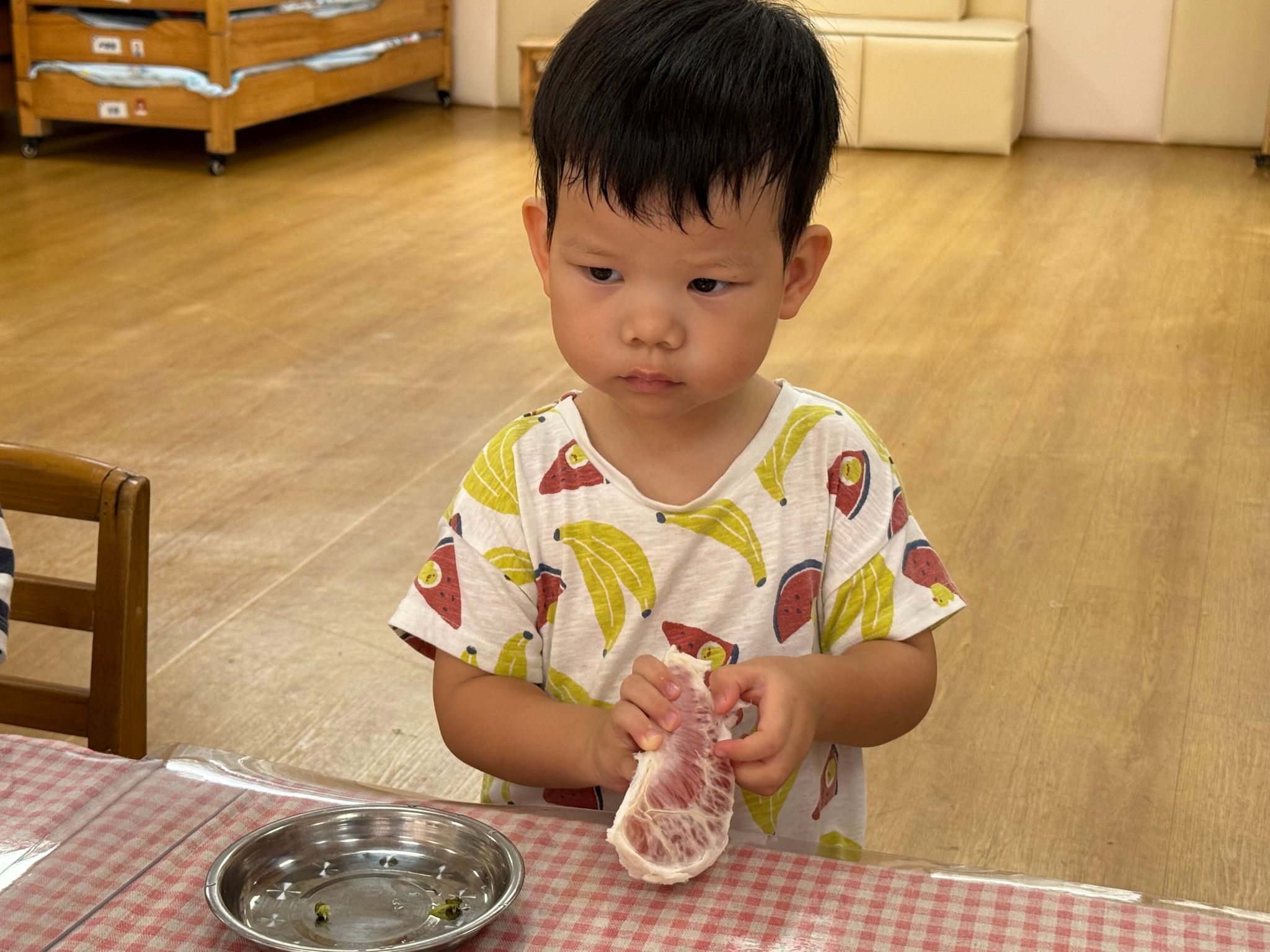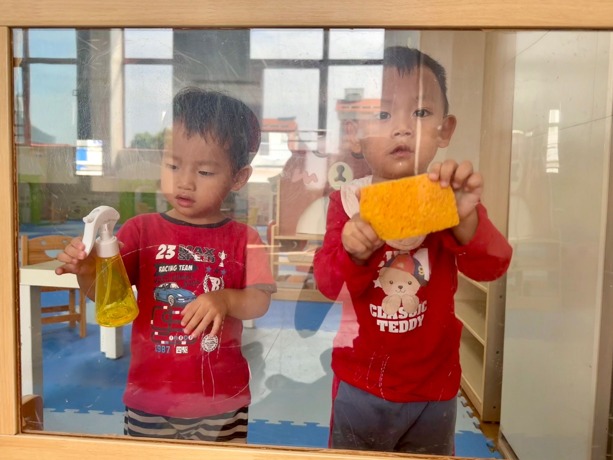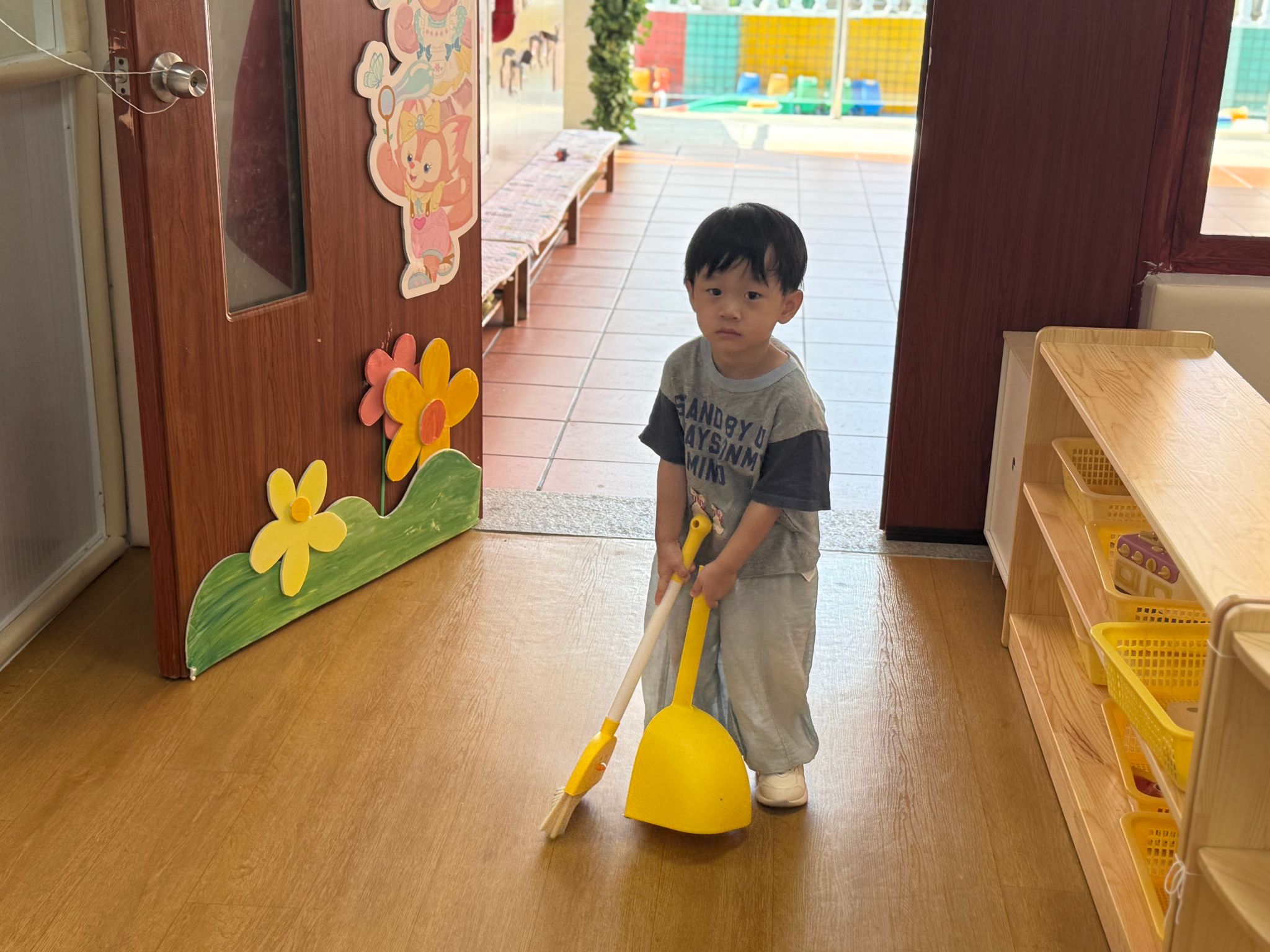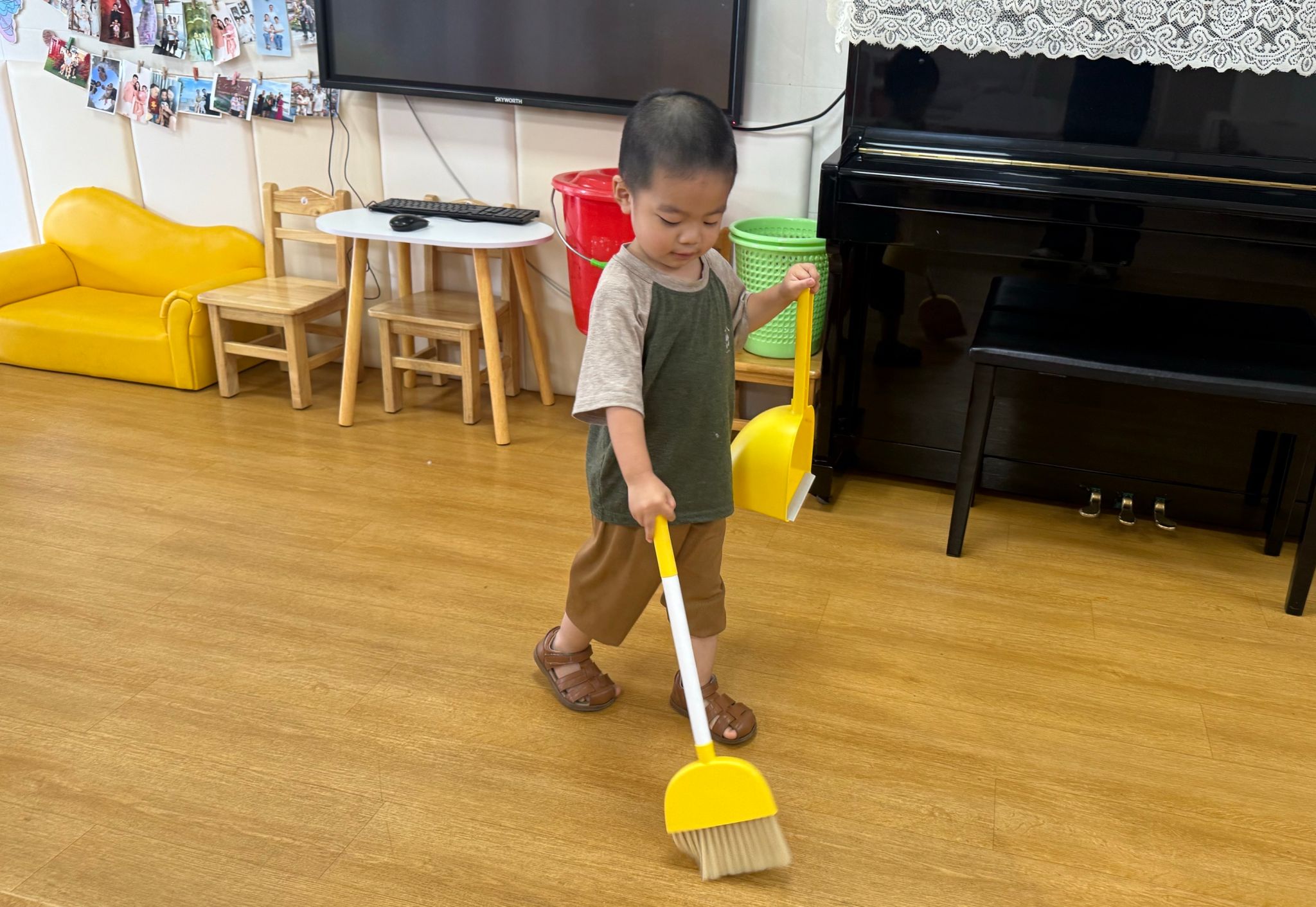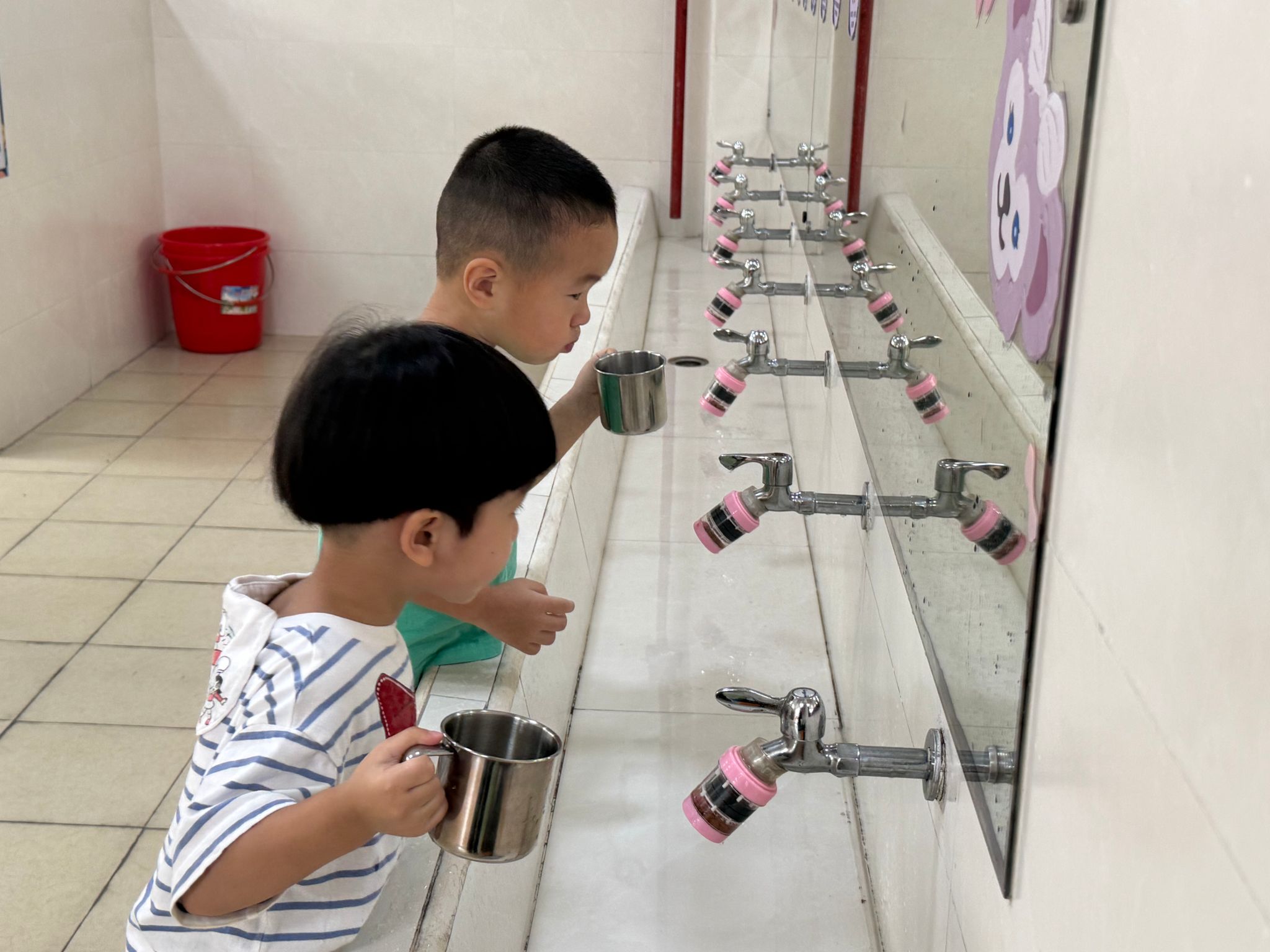 “我的小手真有用!”——早餐后的整理变得更有挑战性。瞧,他们排着队伍,尝试着自己夹起早餐,成就感满满;学习叠放小碗,叮叮当当的声音是劳动的交响乐;漱口时,会拿着杯子,鼓起小嘴弯下腰,下午吃水果时也开始动起小手自己剥水果皮啦!户外游戏后大家都争先恐后想要收玩具。个人卫生习惯在趣味中悄然养成。