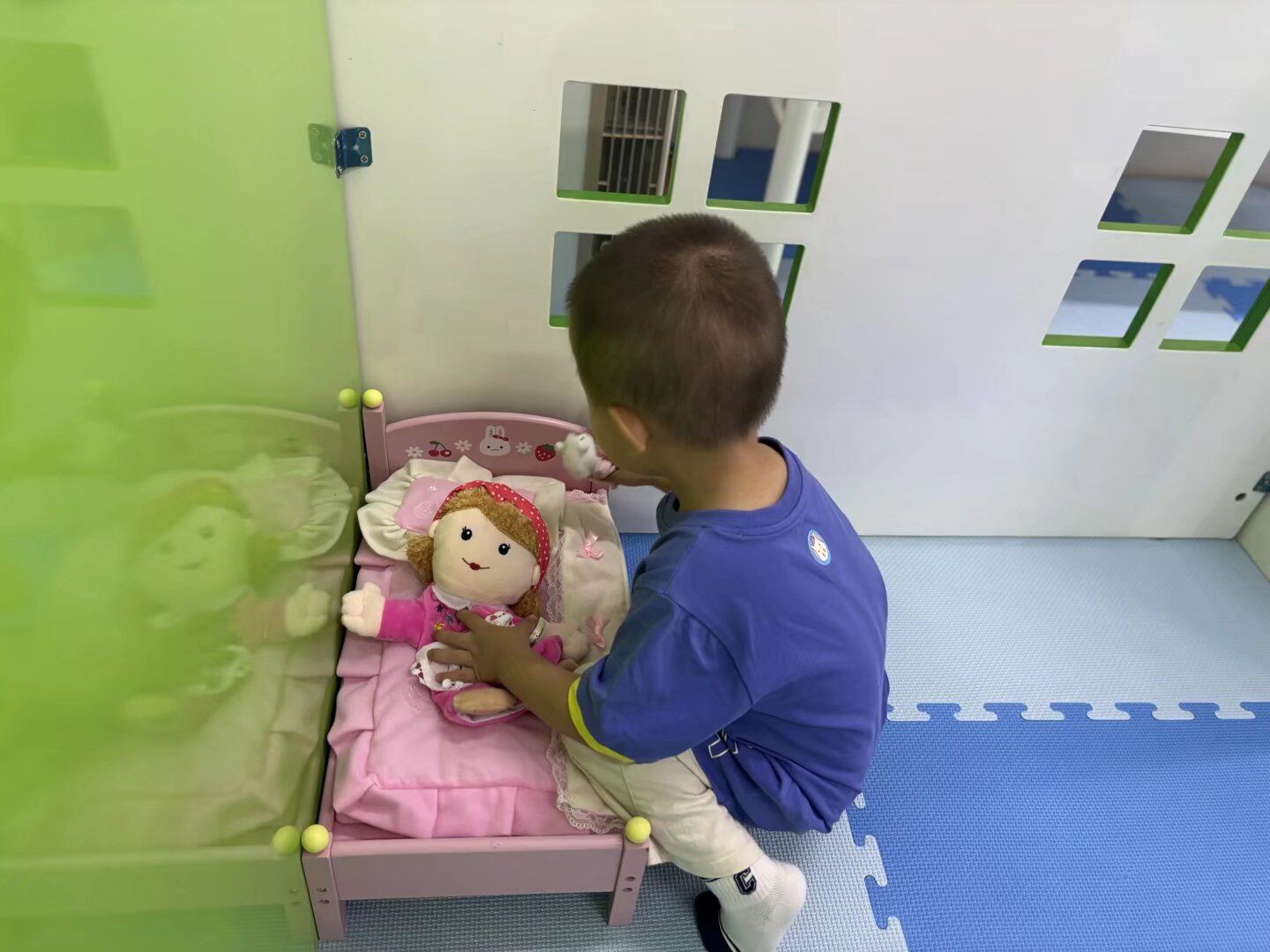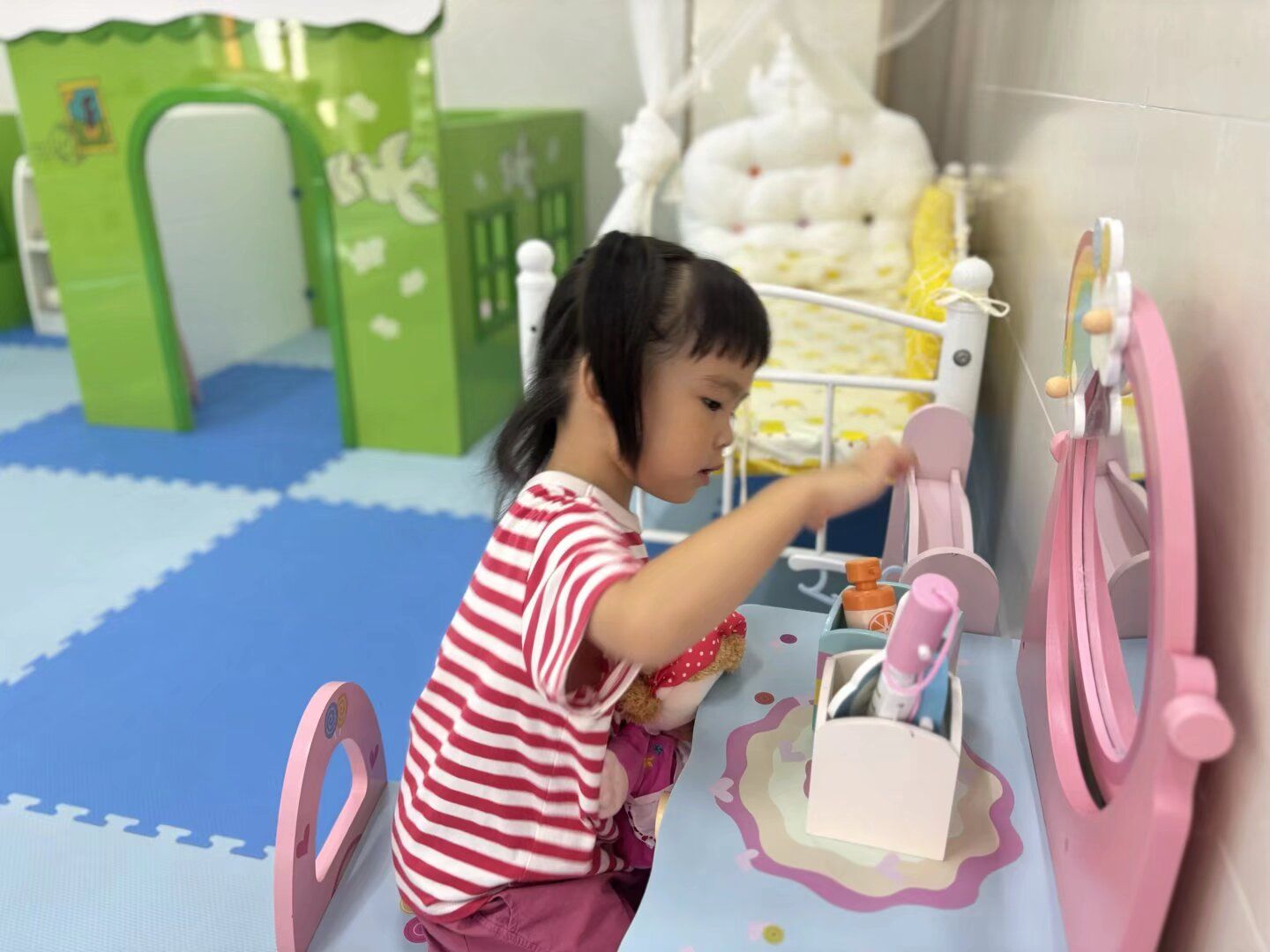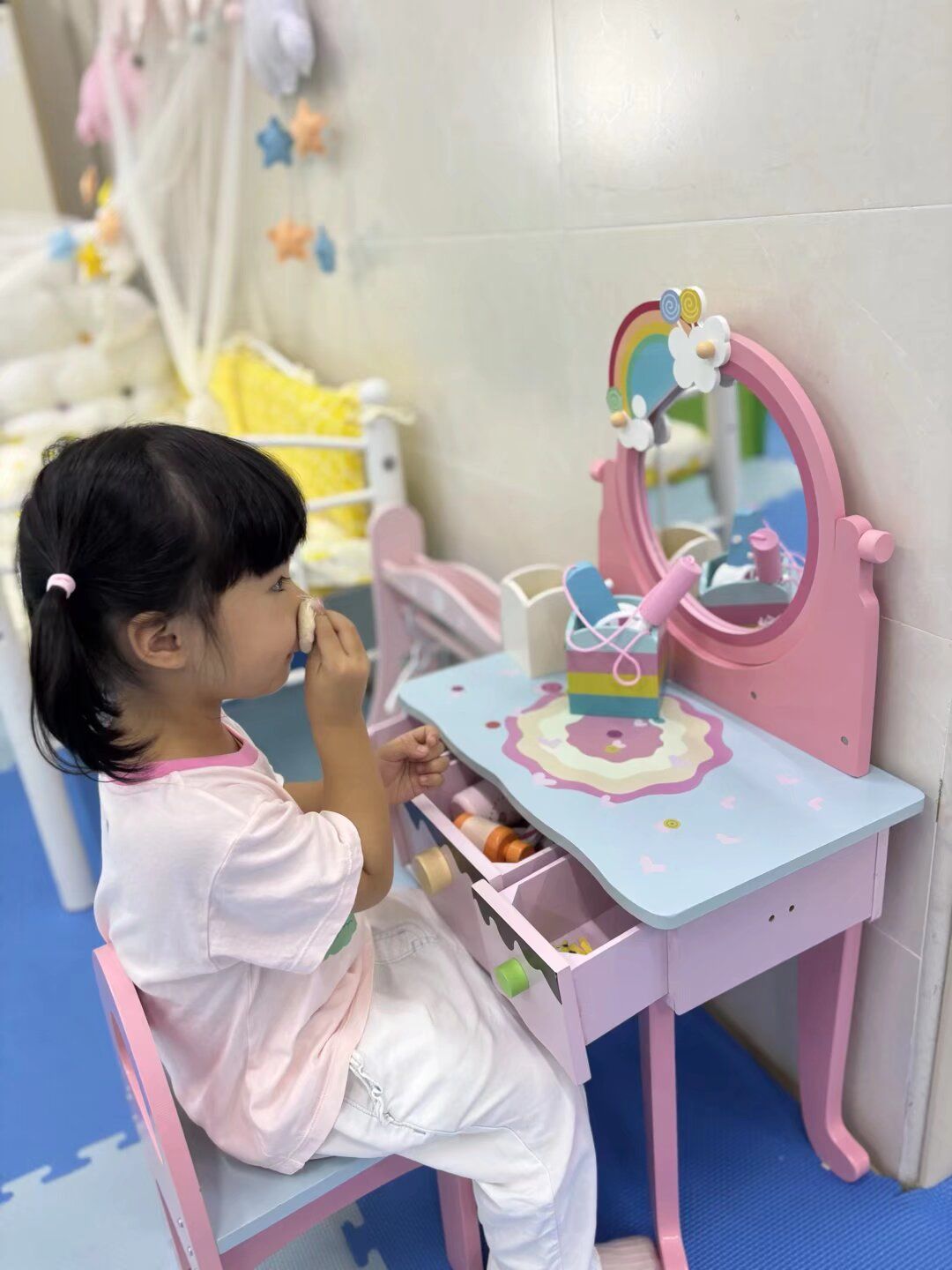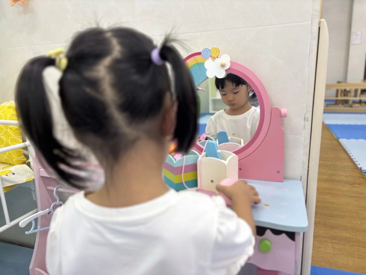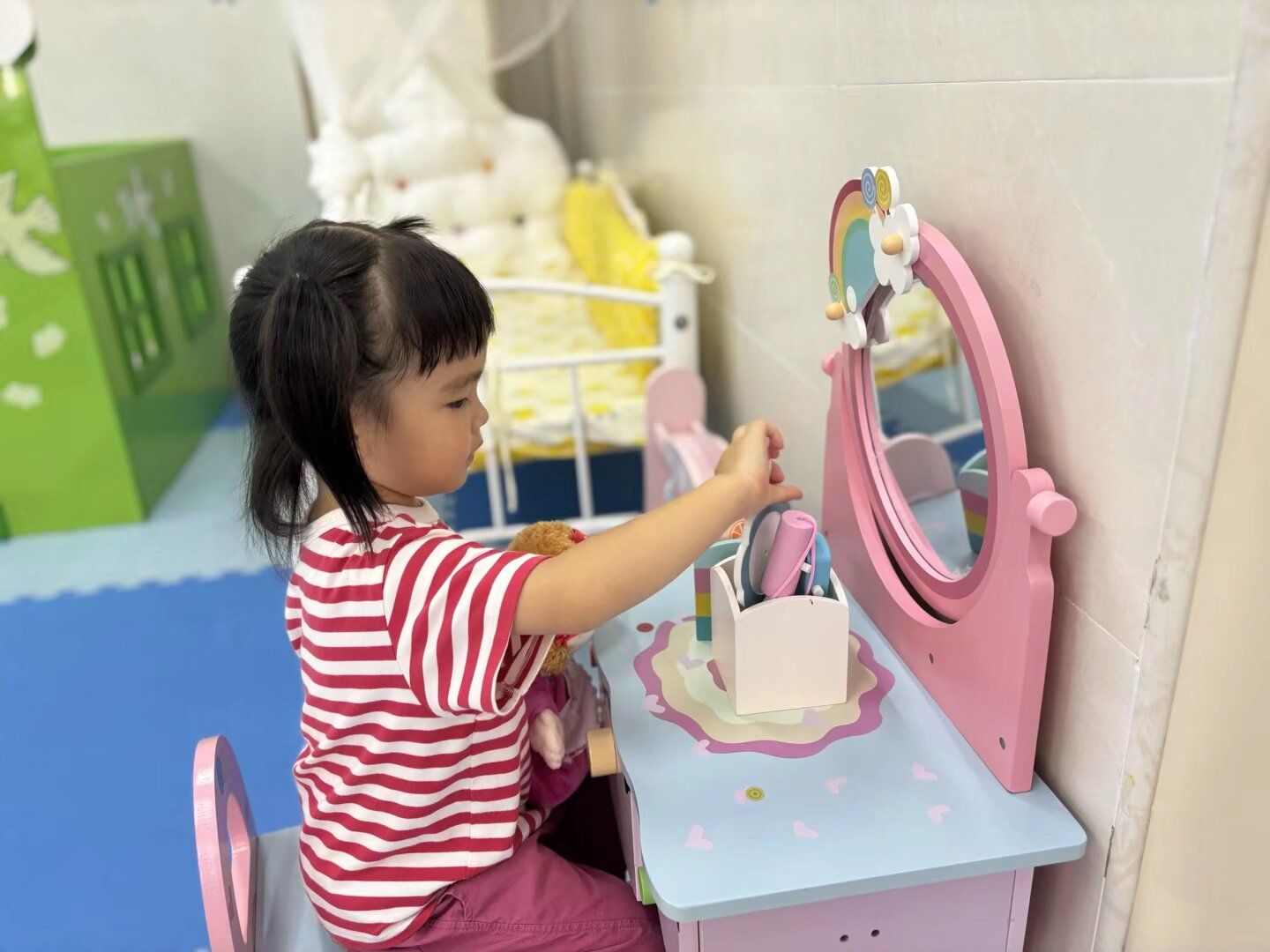 照顾宝宝睡觉环节更是暖意融融。萌娃们将娃娃轻轻放在小床上,学着妈妈的样子盖好小被子,轻轻拍着娃娃的后背,哼唱着不成调的摇篮曲,还会贴心地拉上窗帘,生怕“宝宝”被阳光吵醒。旁边的“美妆区”也不甘示弱,小女孩们拿着玩具口红、梳子,对着小镜子模仿妈妈化妆,你帮我梳头发,我帮你“涂口红”,脸上洋溢着满足的笑容。