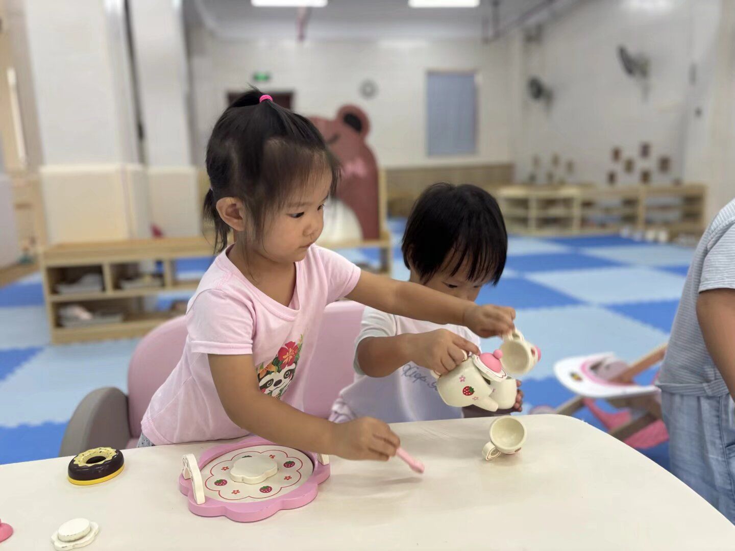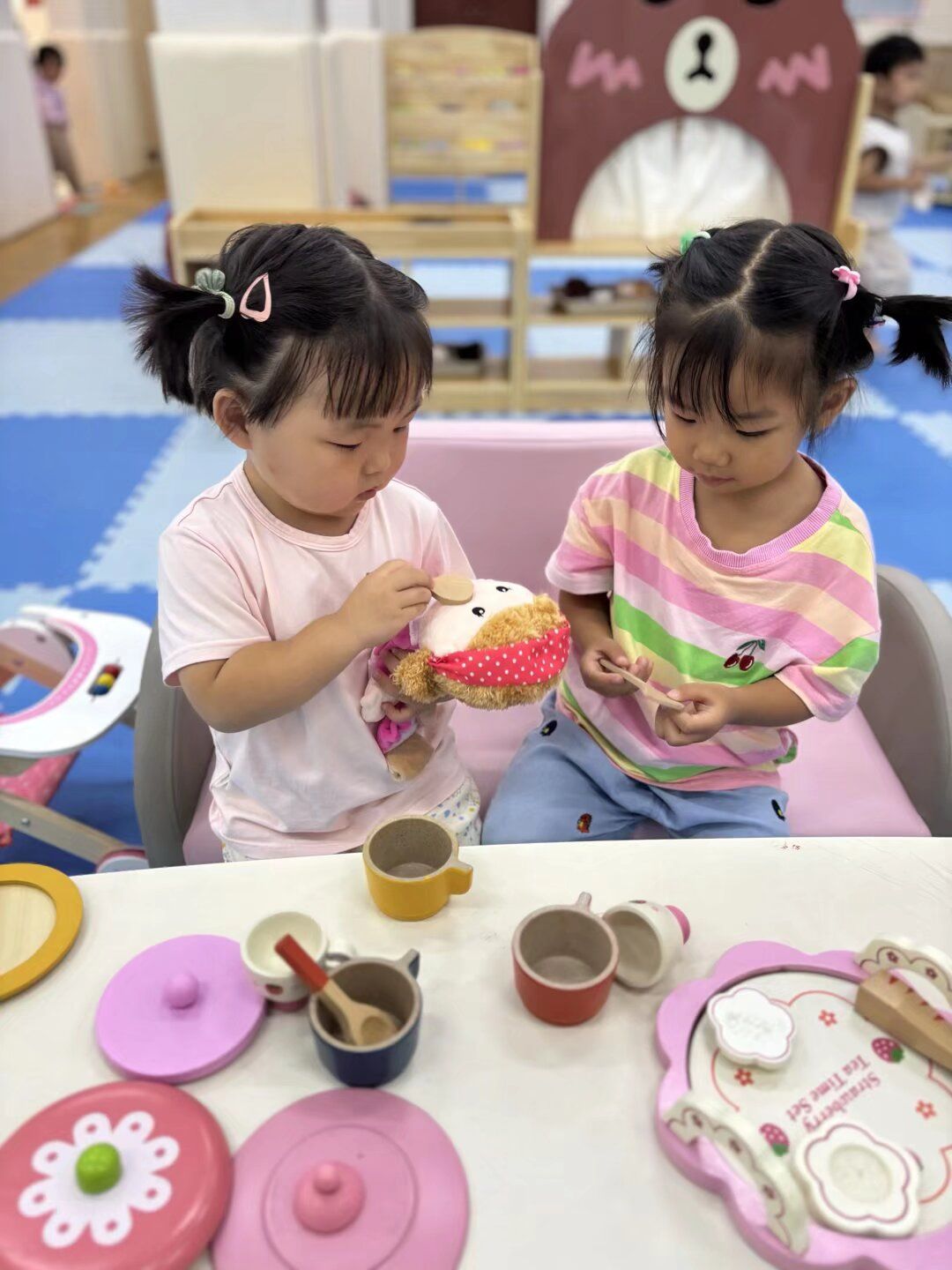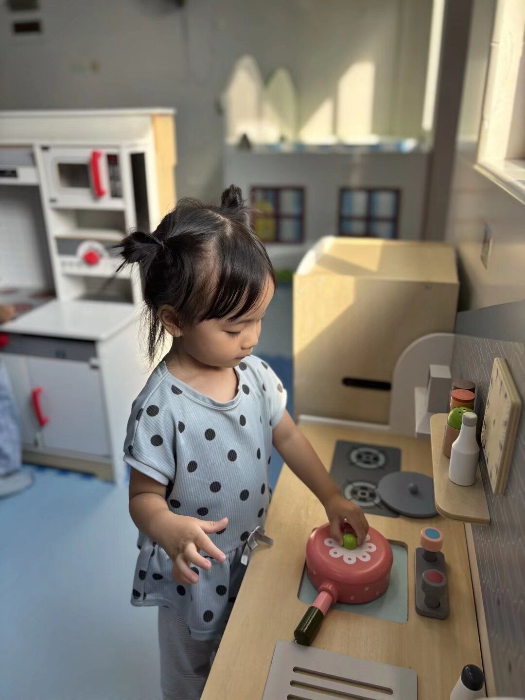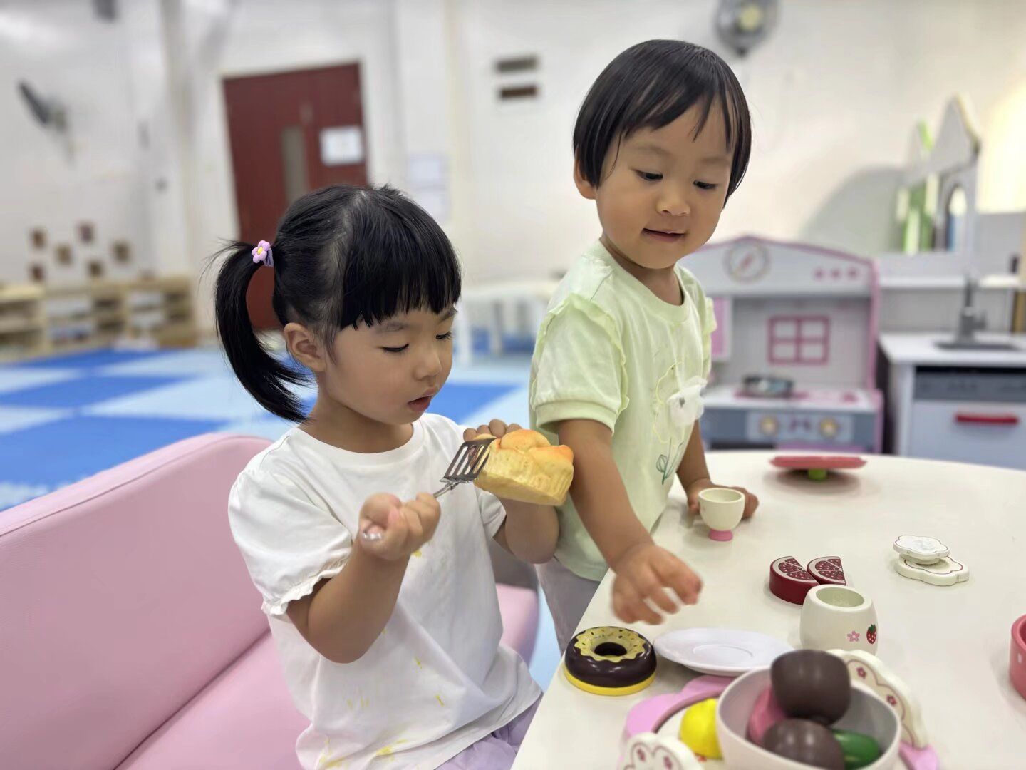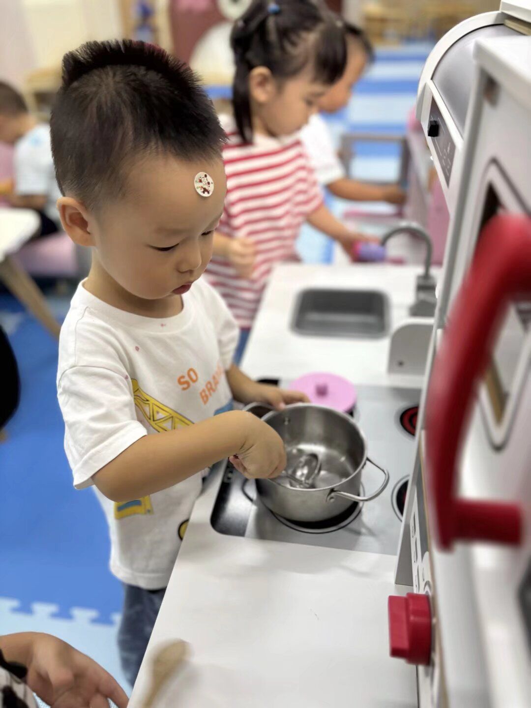 秋日的阳光温柔洒进托班早教室,娃娃家区域里一派热闹景象。小围裙、迷你厨具、柔软娃娃、精致茶具整齐摆放,星星班的萌娃们化身“小大人”,在角色扮演中体验生活乐趣,解锁了一场充满爱与创意的秋日家园之旅。