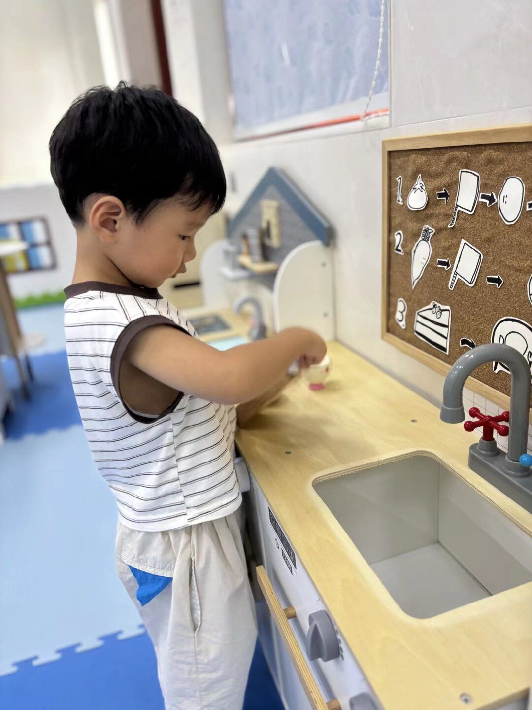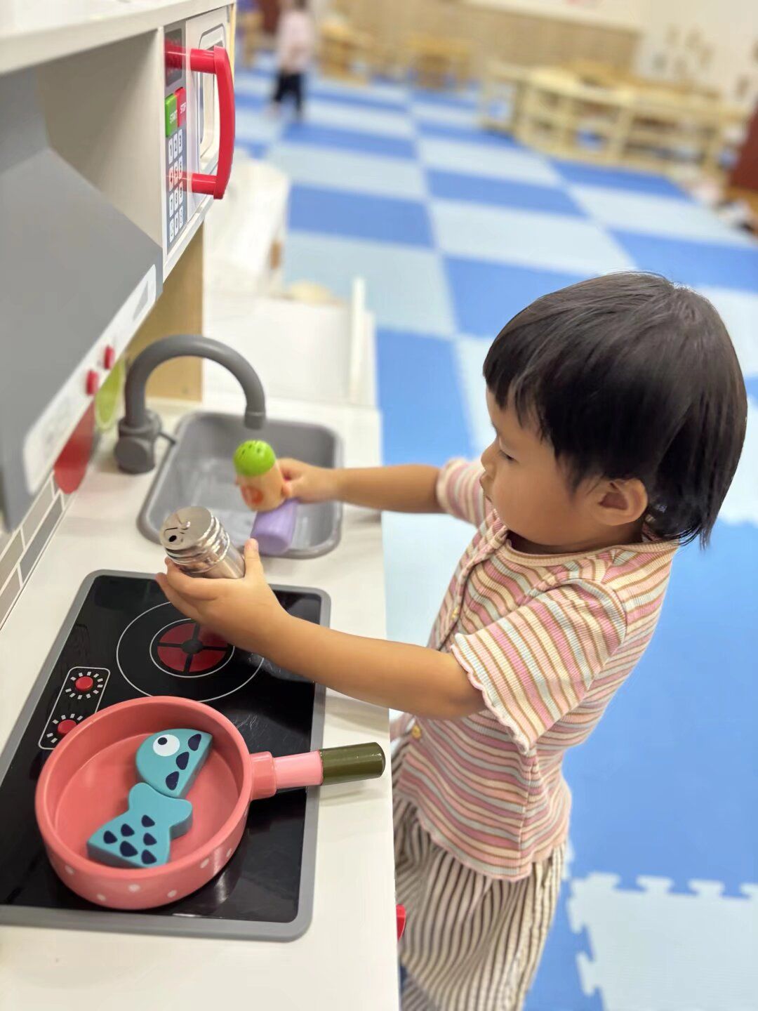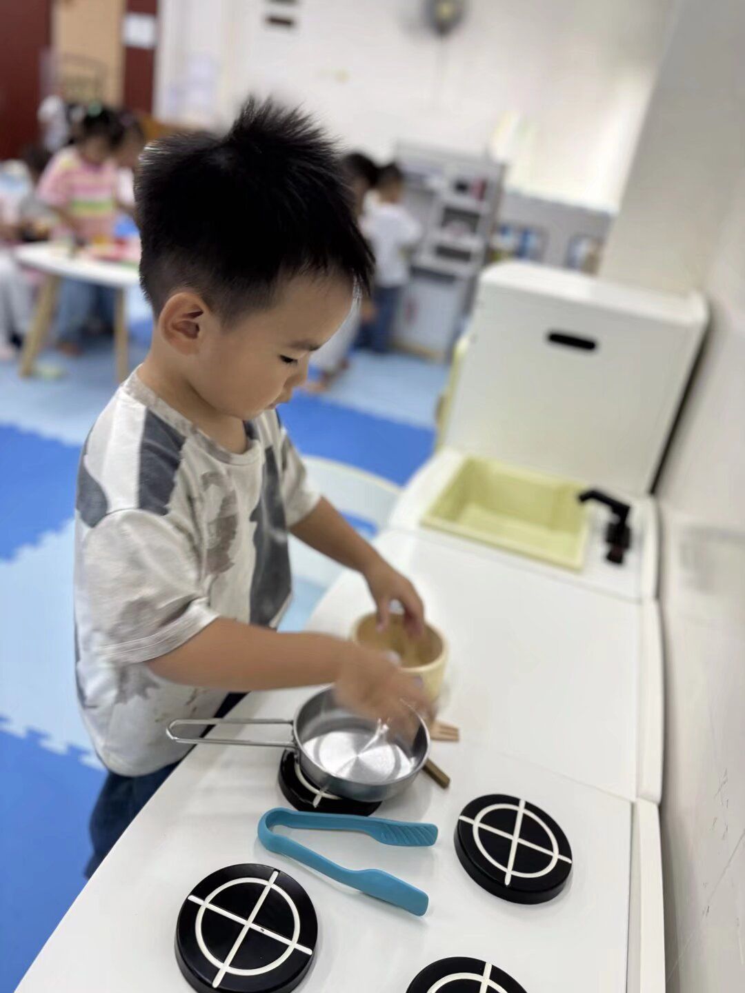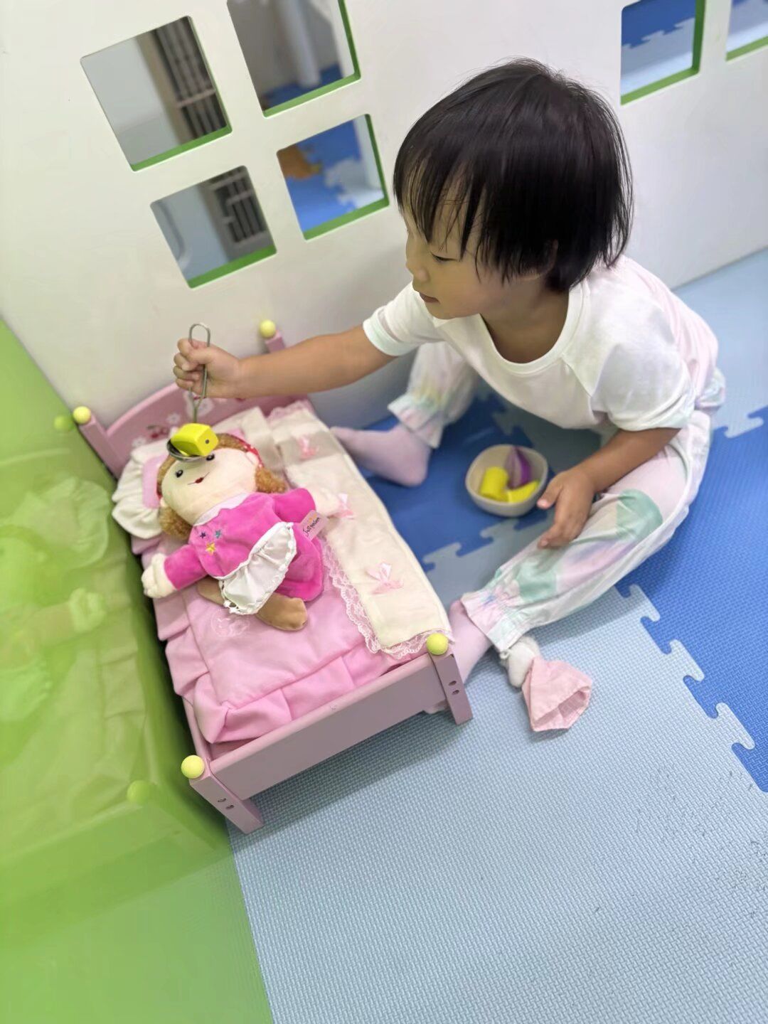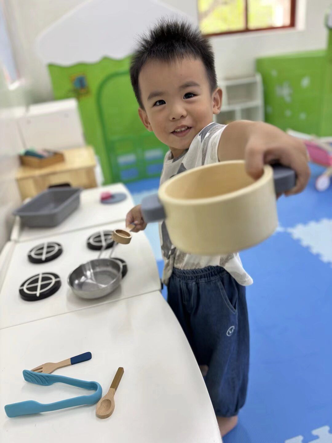 秋日的阳光温柔洒进托班早教室,娃娃家区域里一派热闹景象。小围裙、迷你厨具、柔软娃娃、精致茶具整齐摆放,星星班的萌娃们化身“小大人”,在角色扮演中体验生活乐趣,解锁了一场充满爱与创意的秋日家园之旅。