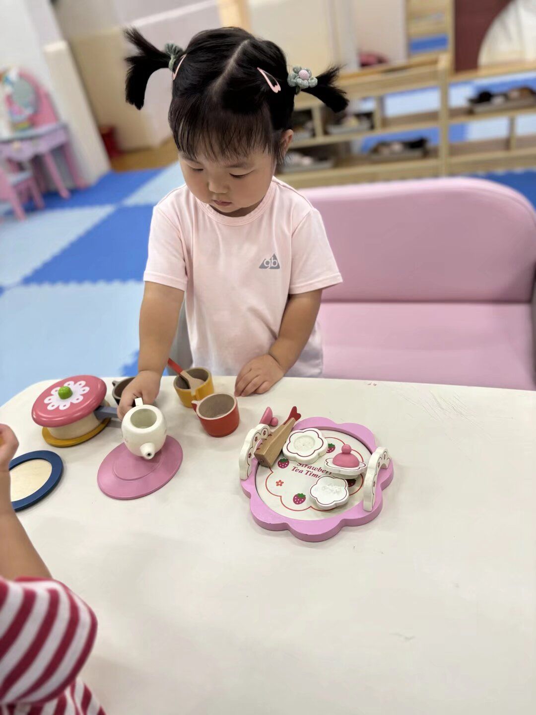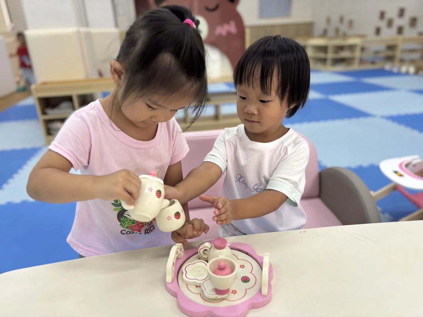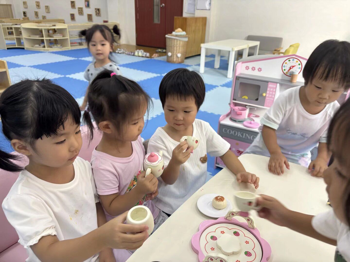 客厅区域的“泡茶请客”游戏格外热闹。“小主人”们熟练地拿起茶壶,往茶杯里倒入清水,端到“客人”面前,礼貌地说:“请喝茶,这是我泡的菊花茶”。客人们双手接过茶杯,轻轻抿一口,连声说“真好喝,谢谢你”,在一来一往中学会了礼貌交往。