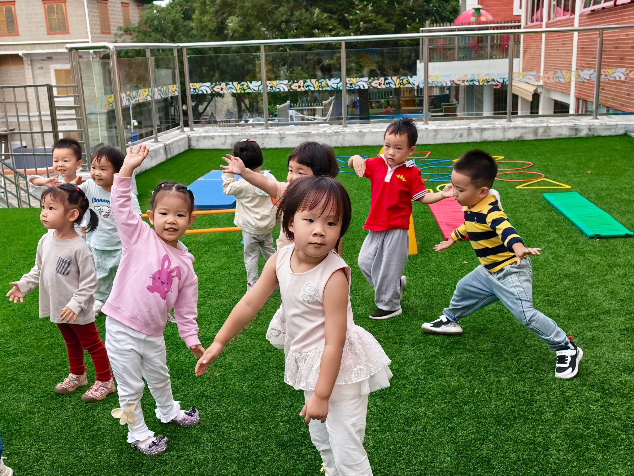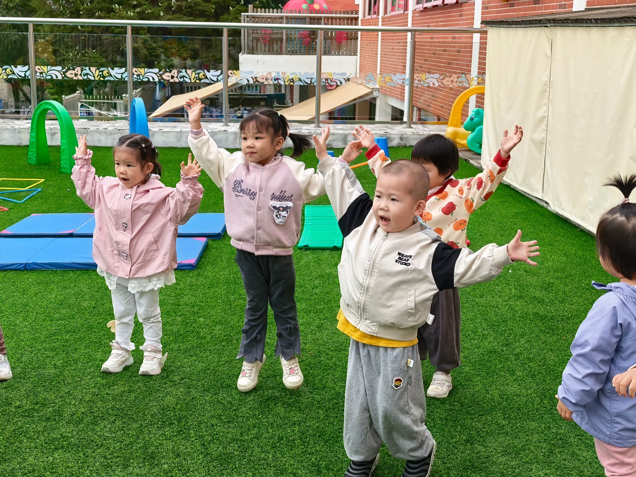 伴随着欢快的音乐,小宝贝们排着小队伍,跟着老师做起了早操。他们伸伸小胳膊、踢踢小短腿,有的模仿小鸟扇动翅膀,有的跟着节奏点头晃脑,虽然动作稚嫩又可爱,却满是认真的模样,用满满的活力开启了美好的一天。