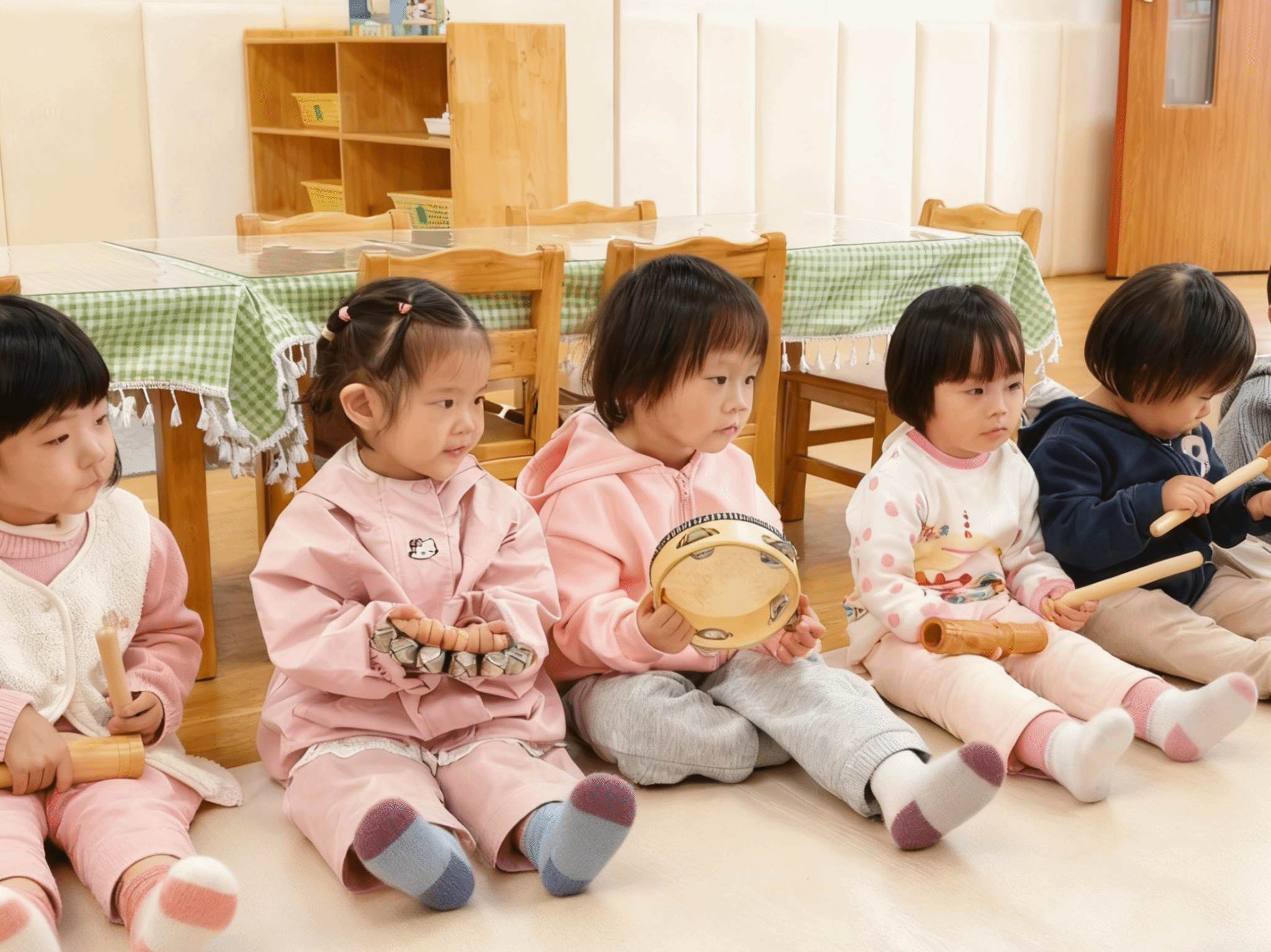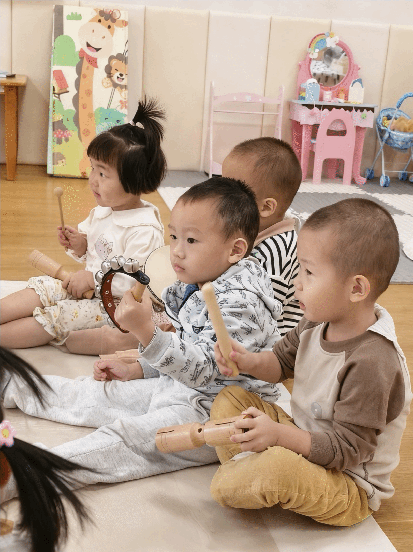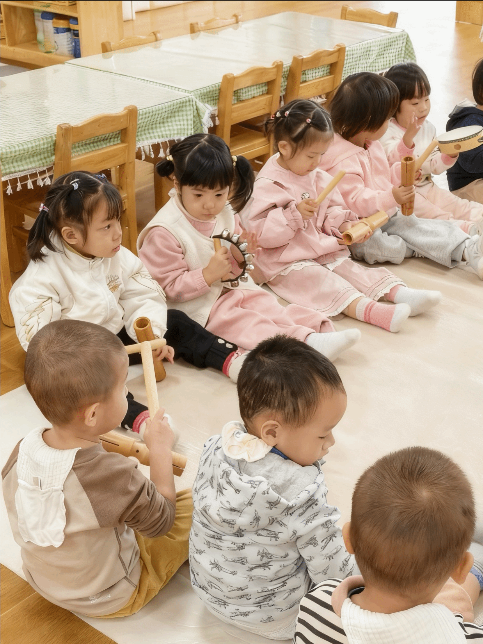 教室里传来了清脆的声响,原来是宝贝们在和“乐器宝宝”做游戏!他们握着铃鼓轻轻摇晃,“哗啦啦”的声音真动听;拿起手摇铃用力晃动,节奏明快又响亮;敲一敲木筒,“咚咚咚”的声音像小鼓在唱歌。