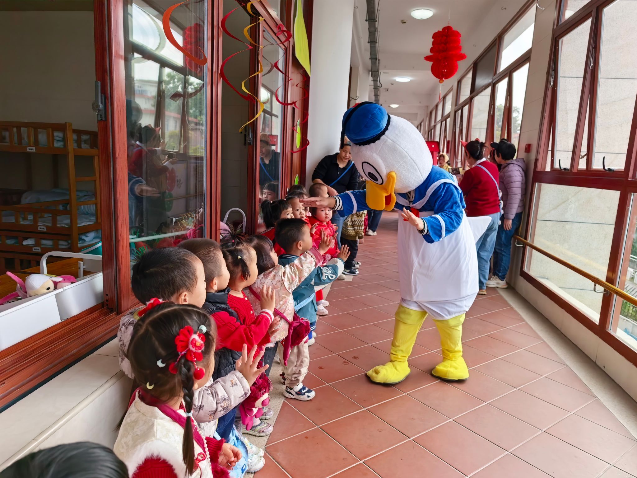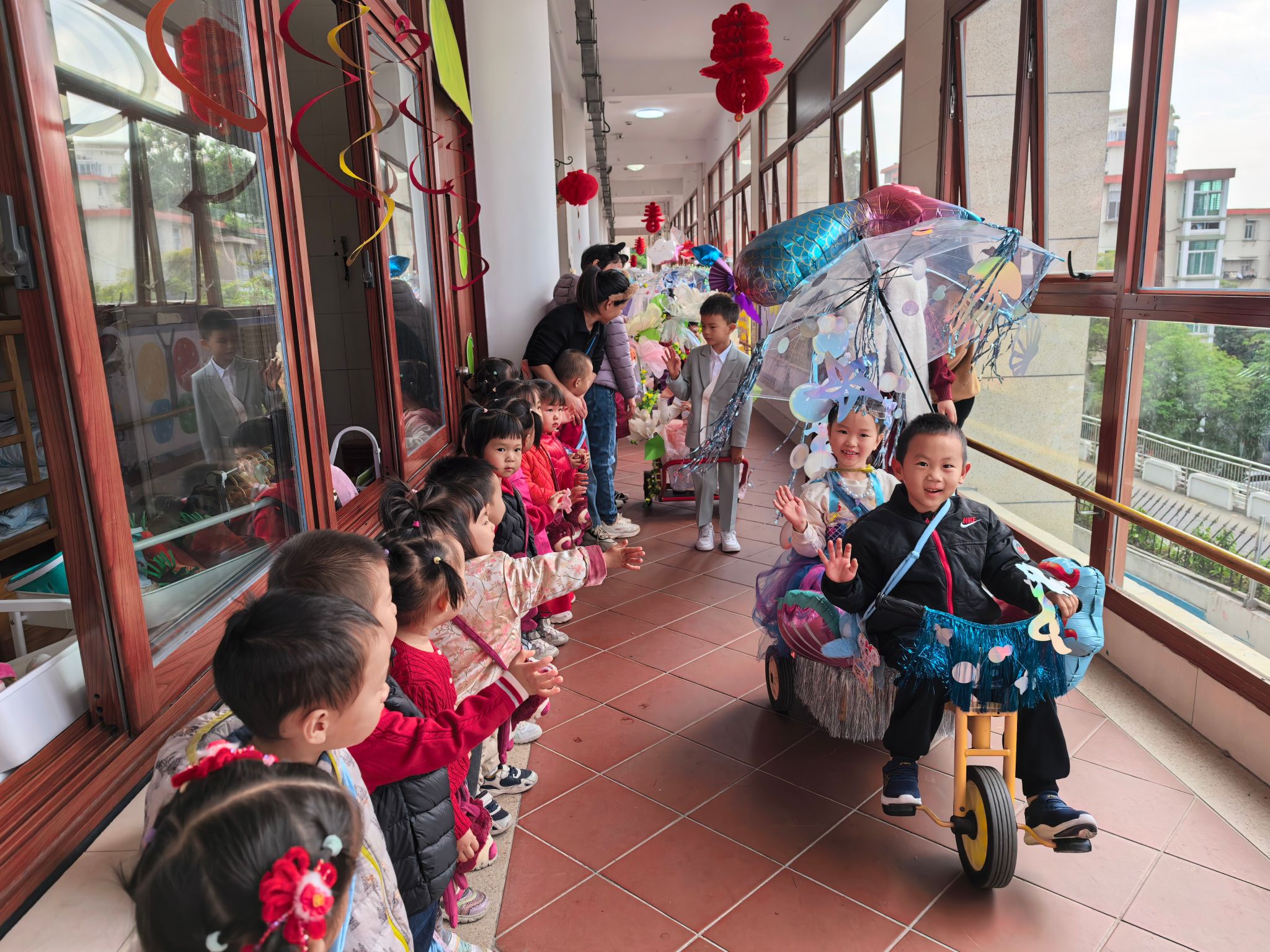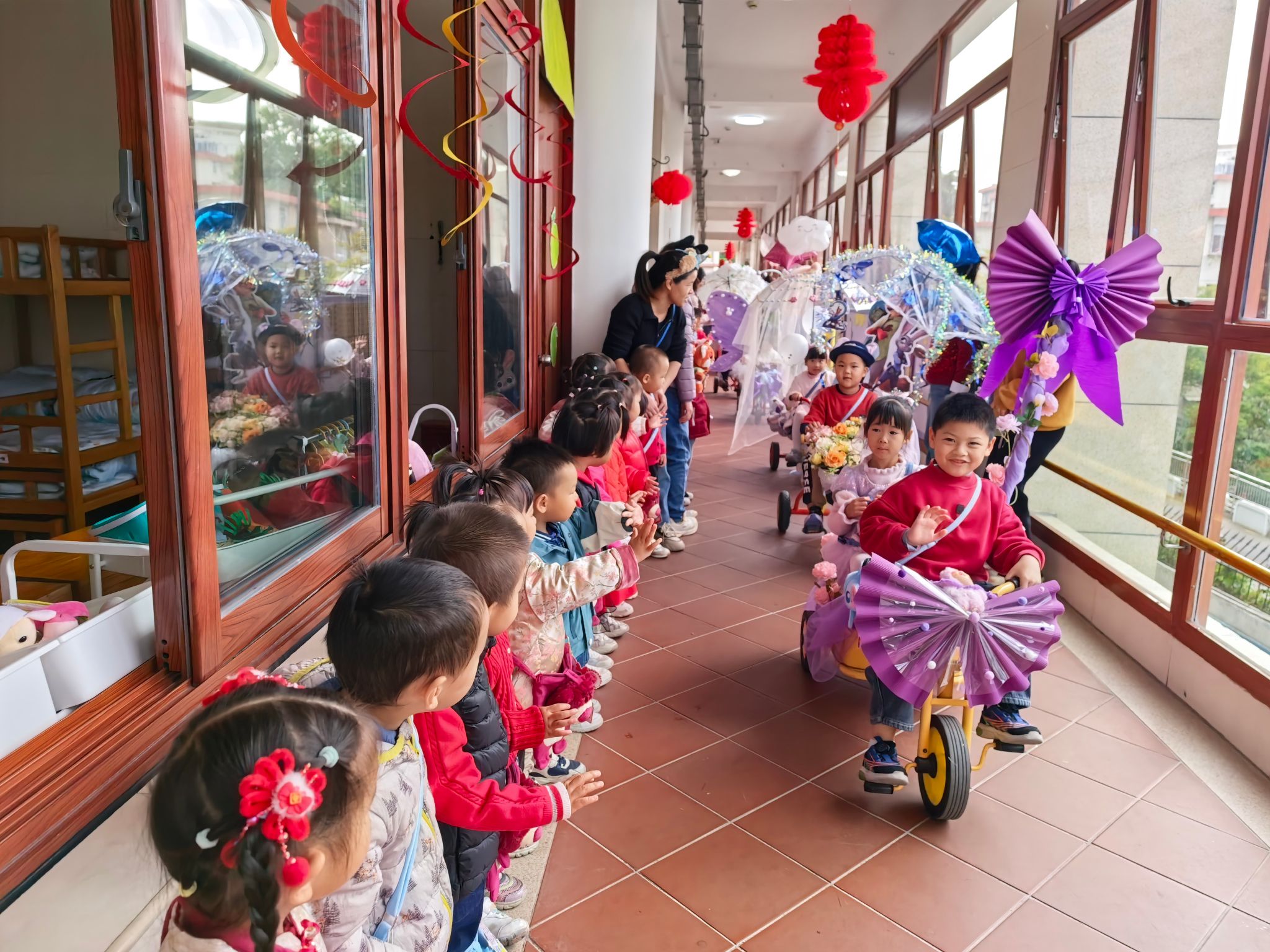 迎新年游园活开始啦!大班的哥哥姐姐们带着精心制作的花车来游行啦!哥哥姐姐们穿着漂亮的衣服向托班的小弟弟小妹妹们挥手问好。宝贝们踮着脚尖,目不转睛地看着花车队伍缓缓走过,小嘴巴里不停地念叨着:“好漂亮呀!”
