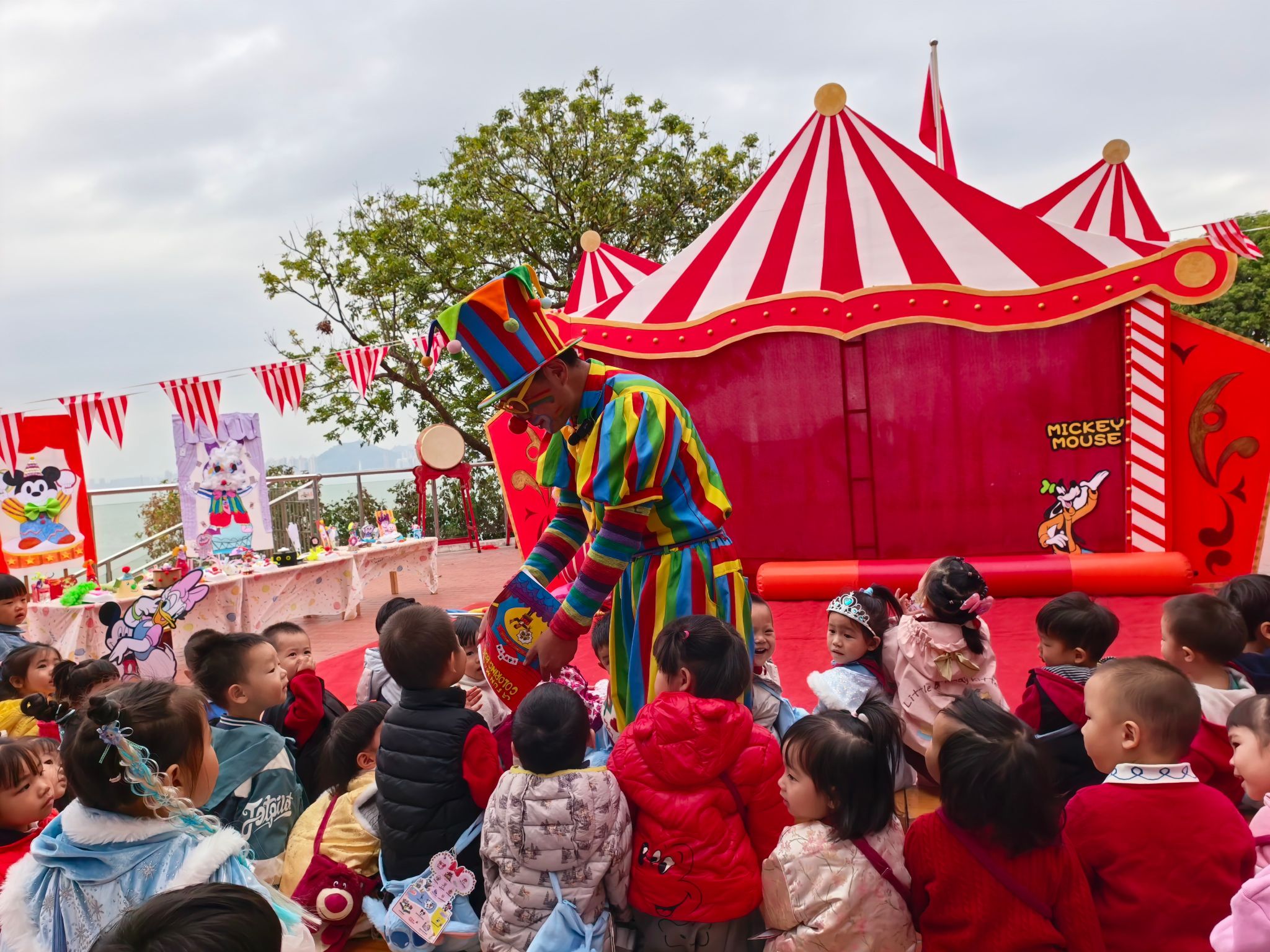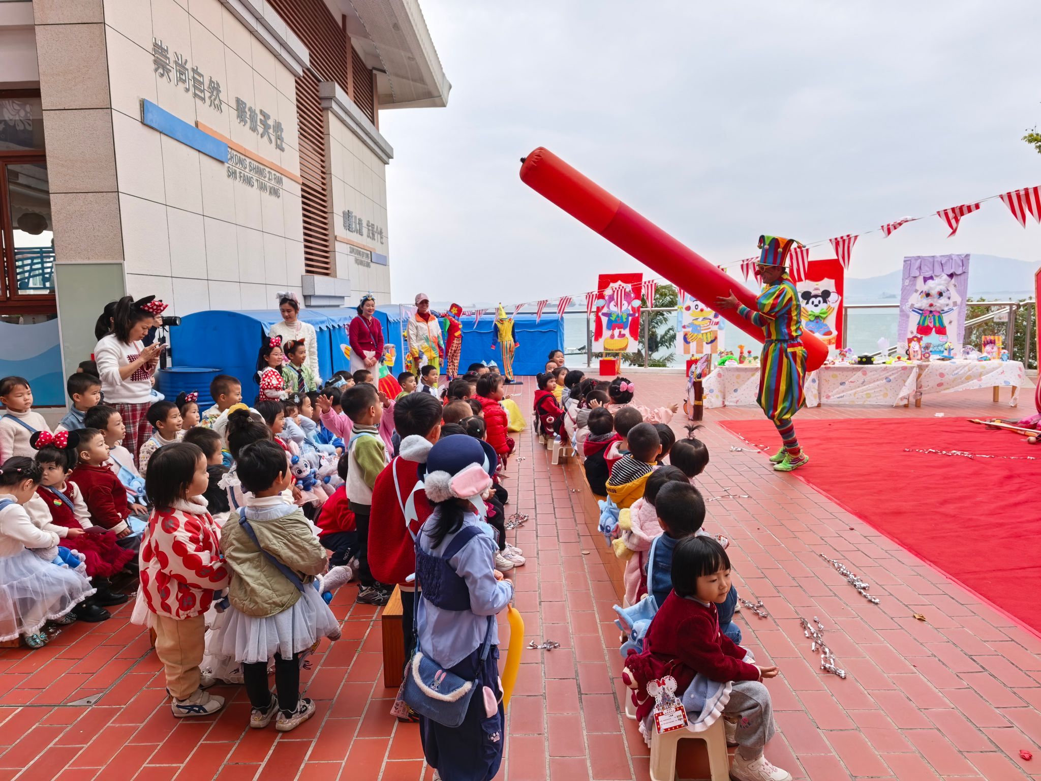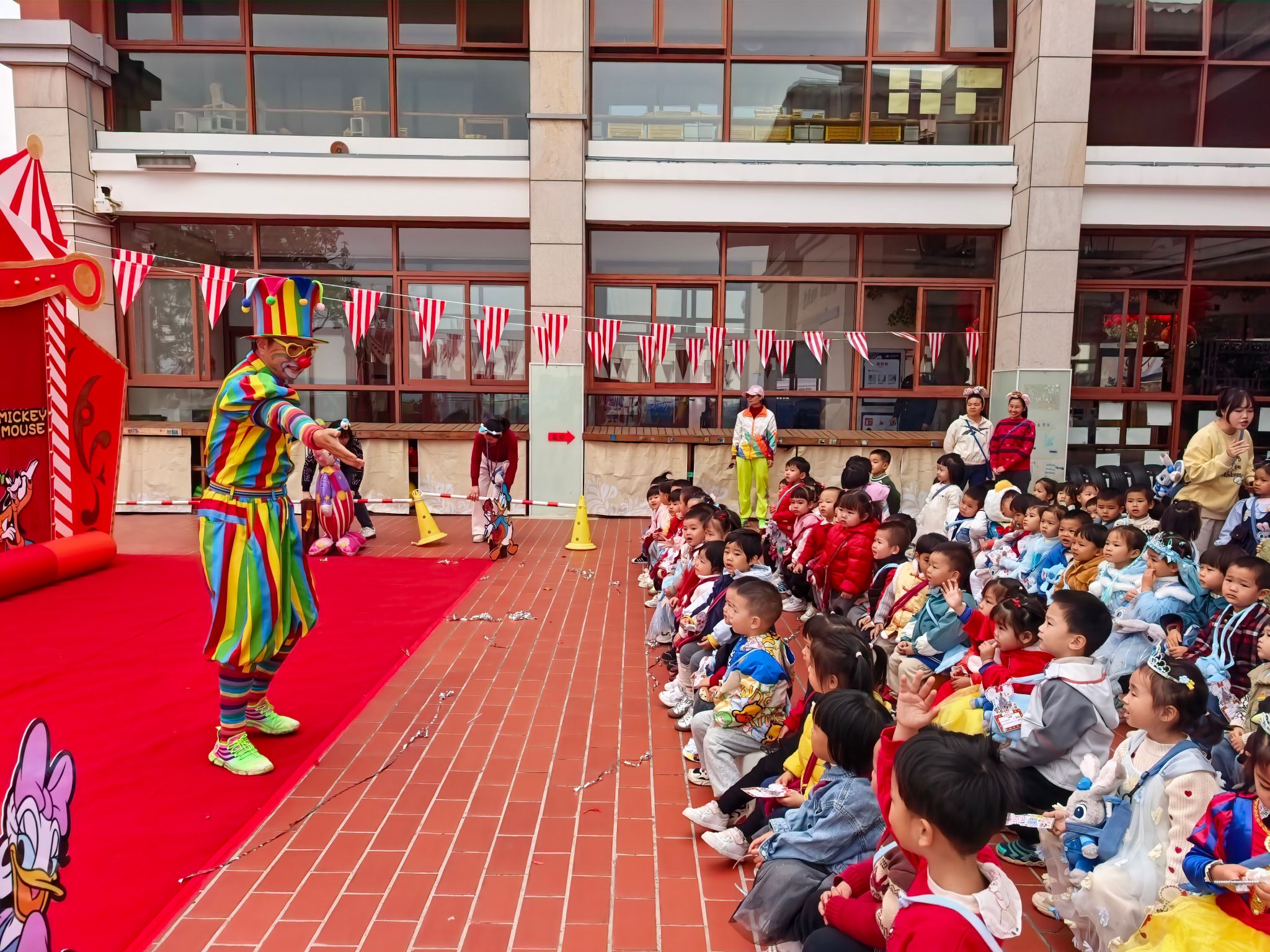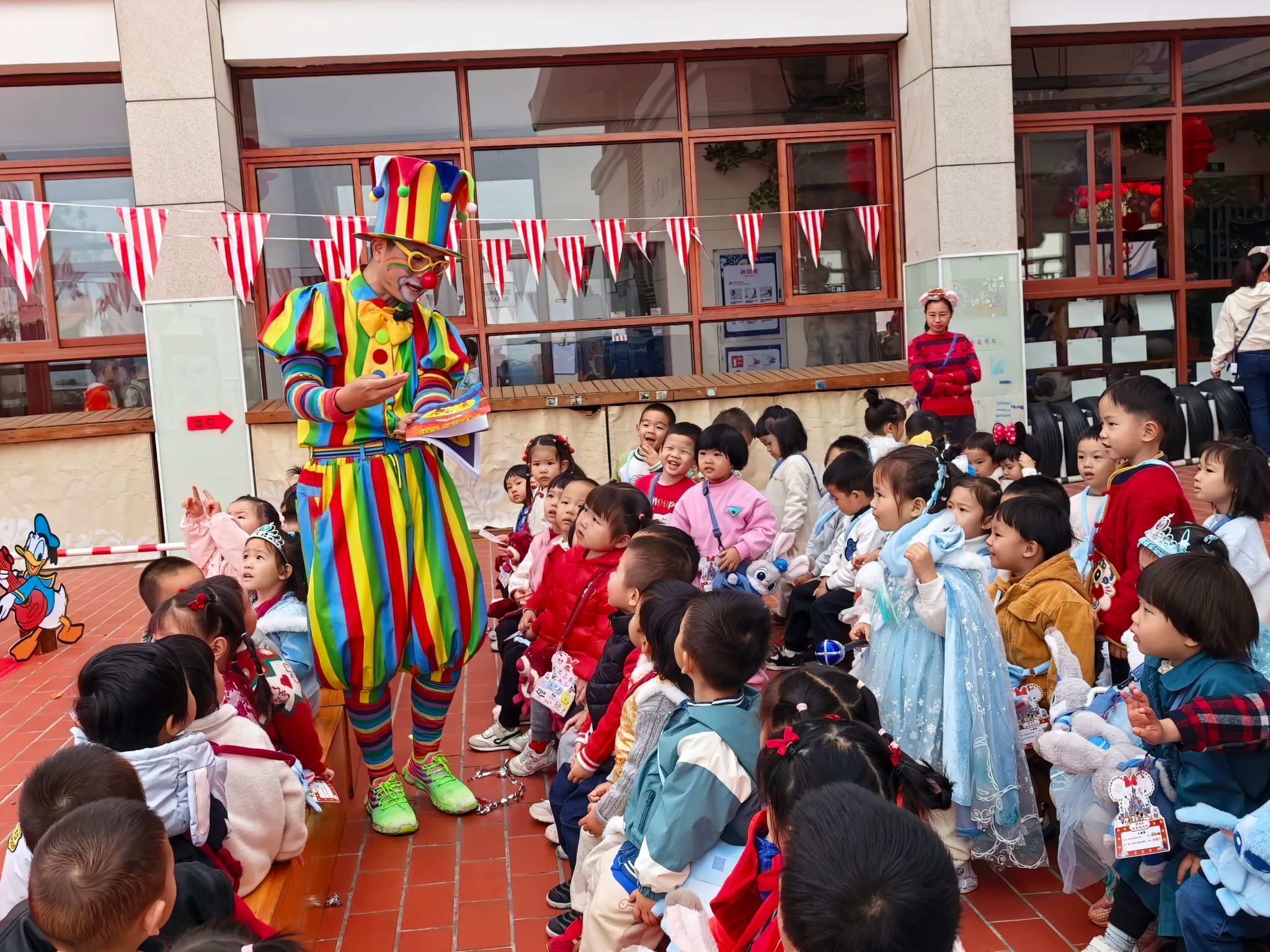 “快看!小丑来啦!”伴随着欢快的音乐,一个穿着彩色条纹衣服、顶着夸张红鼻子的小丑踩着轻快的脚步来到了孩子们中间带来了精彩表演,宝贝们拍手叫好。