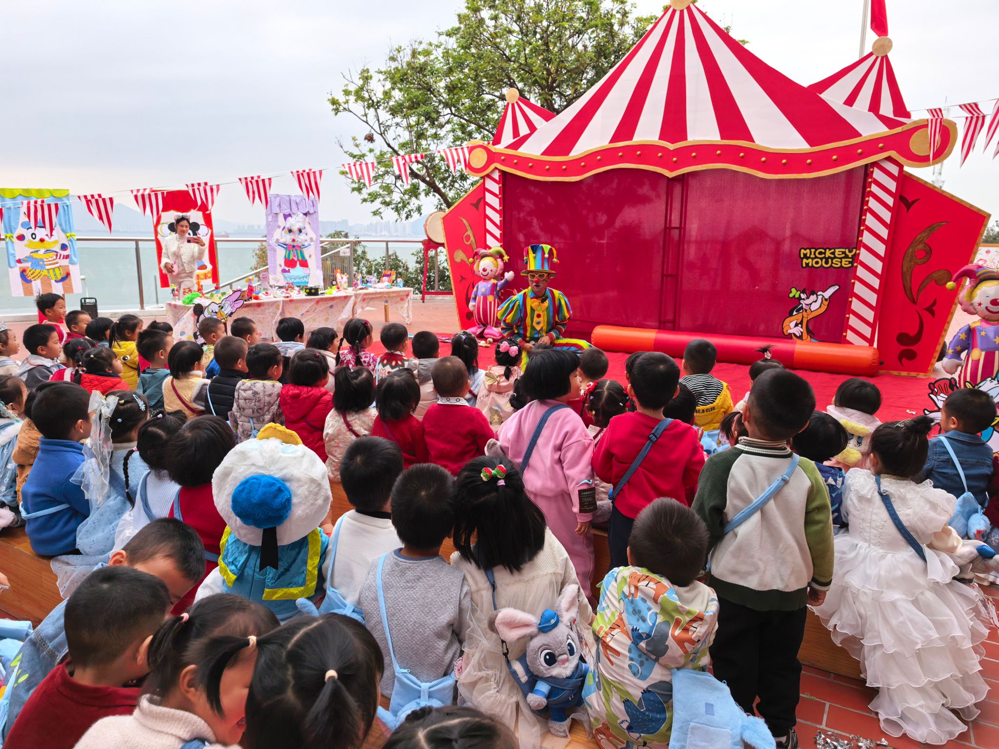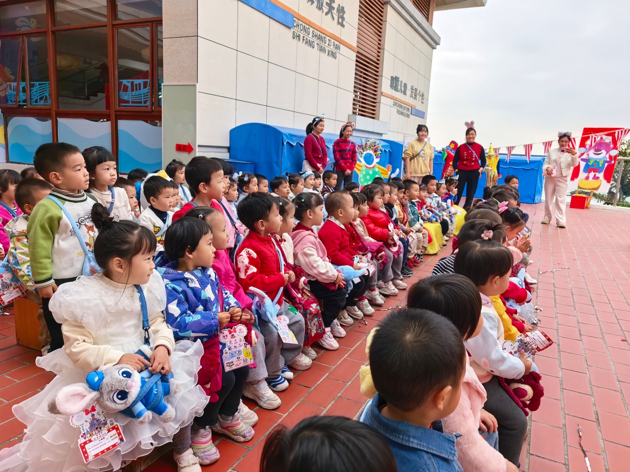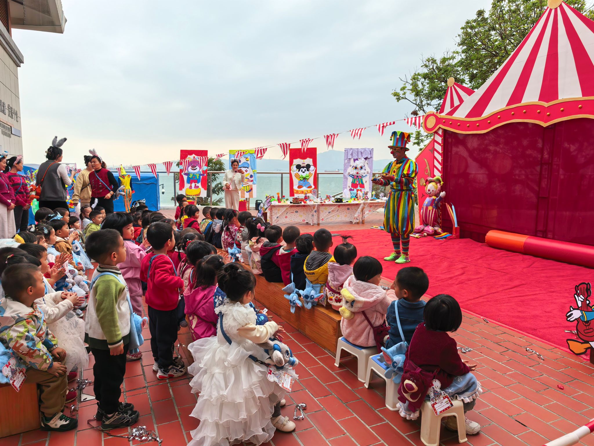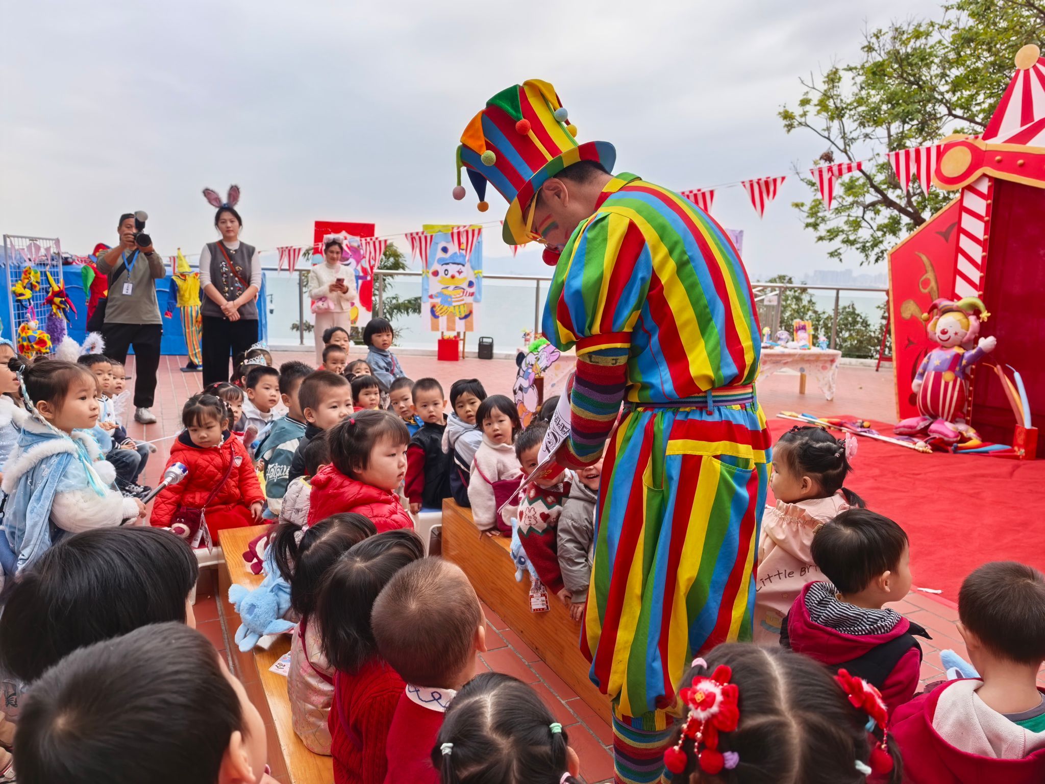 “快看!小丑来啦!”伴随着欢快的音乐,一个穿着彩色条纹衣服、顶着夸张红鼻子的小丑踩着轻快的脚步来到了孩子们中间带来了精彩表演,宝贝们拍手叫好。