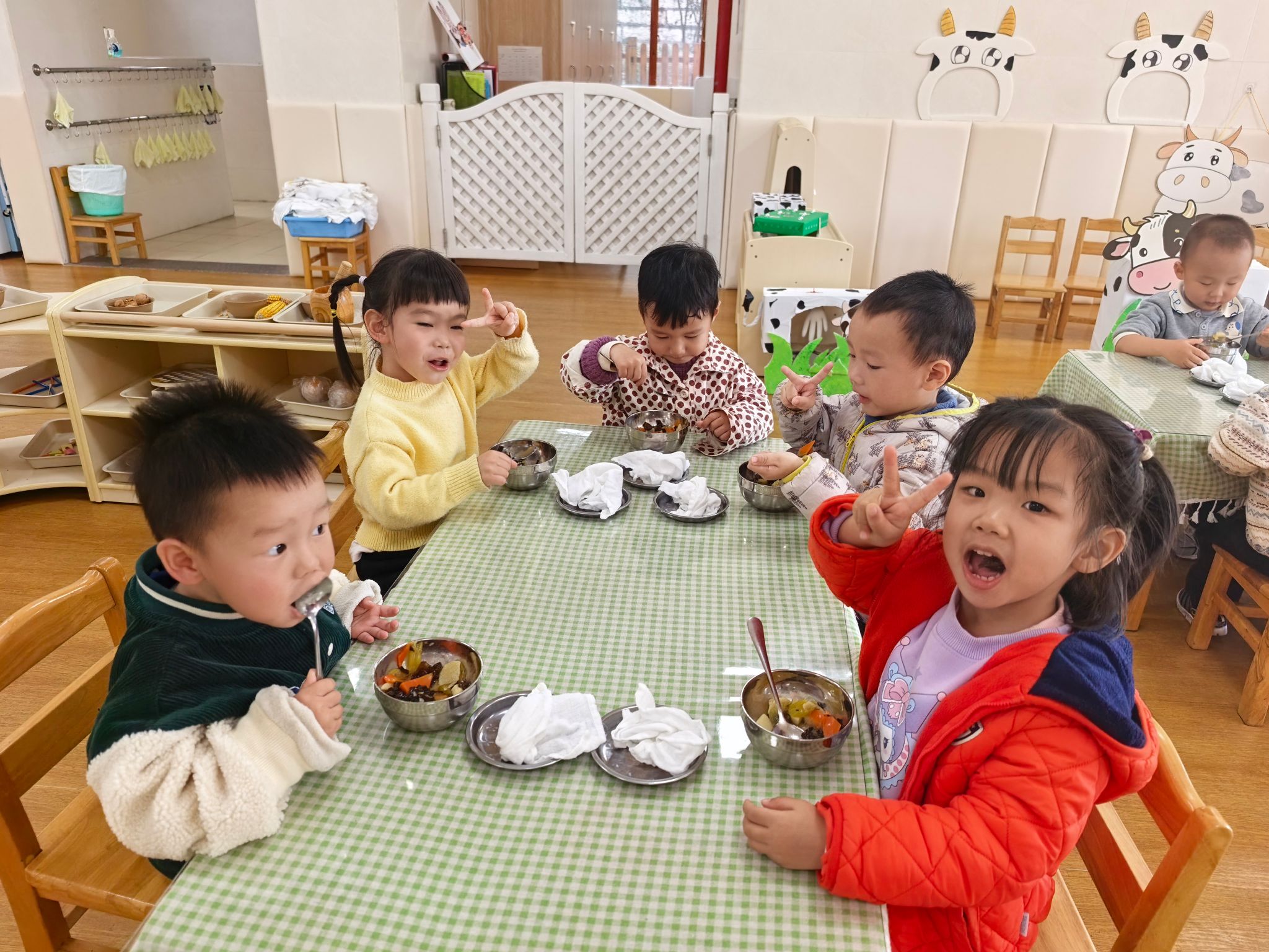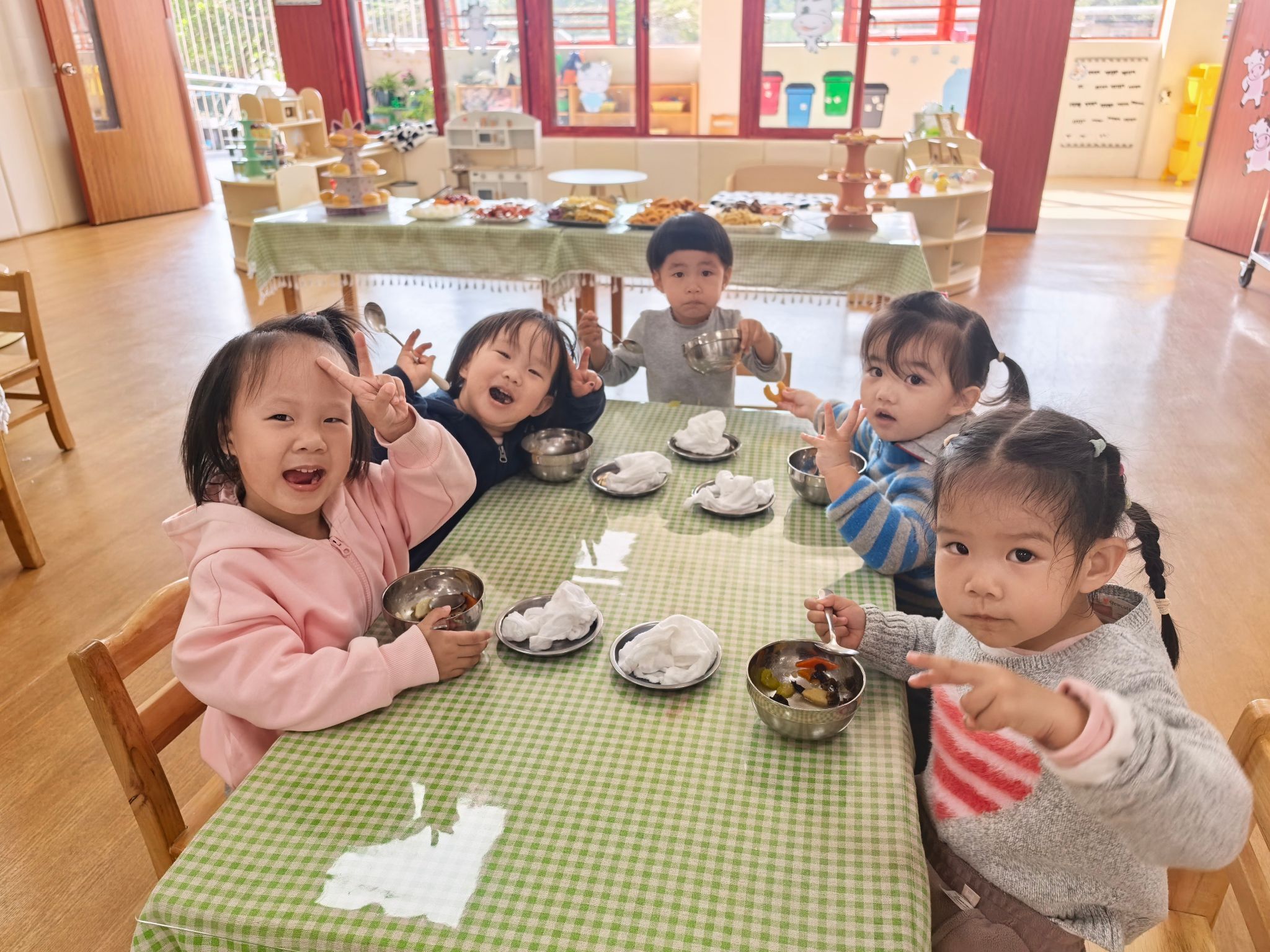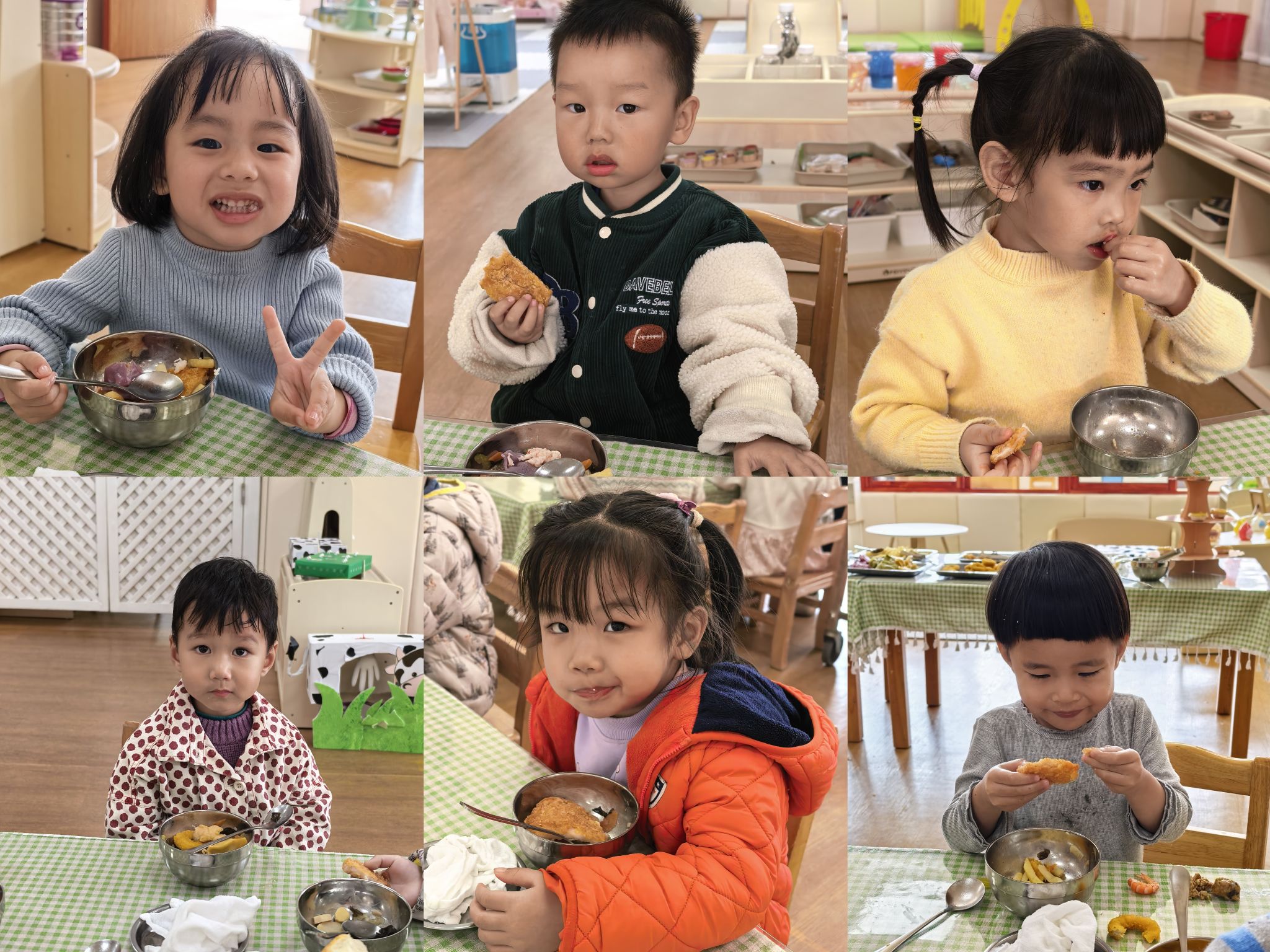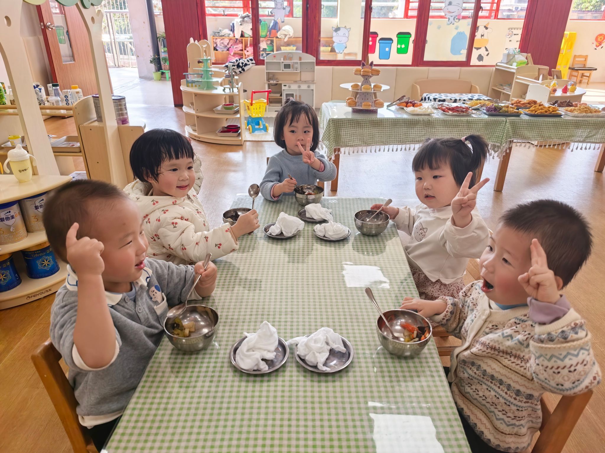 宝贝们排着小小的队伍,在老师的引导下,拿着自己的小餐盘,认真地挑选着喜欢的食物。宝贝们围坐在一起,大口大口地品尝着美味,小脸上满是满足与幸福。