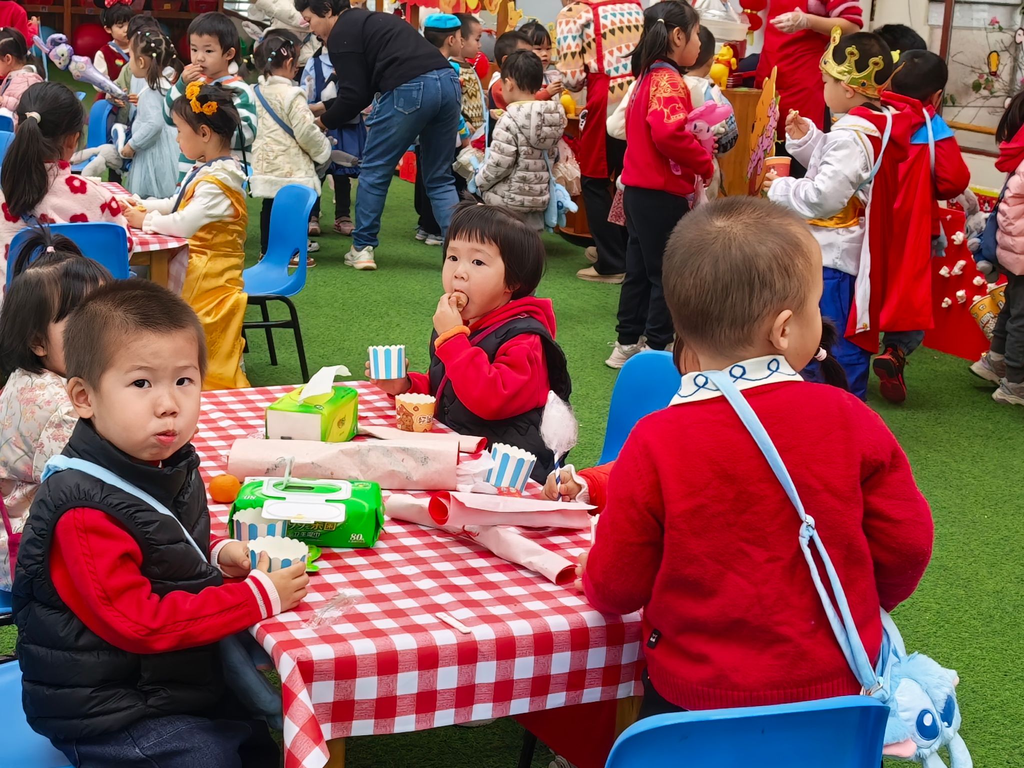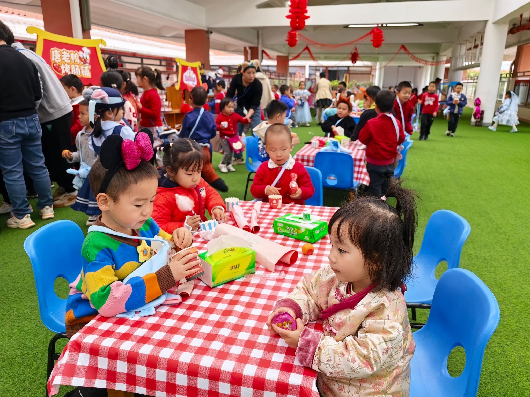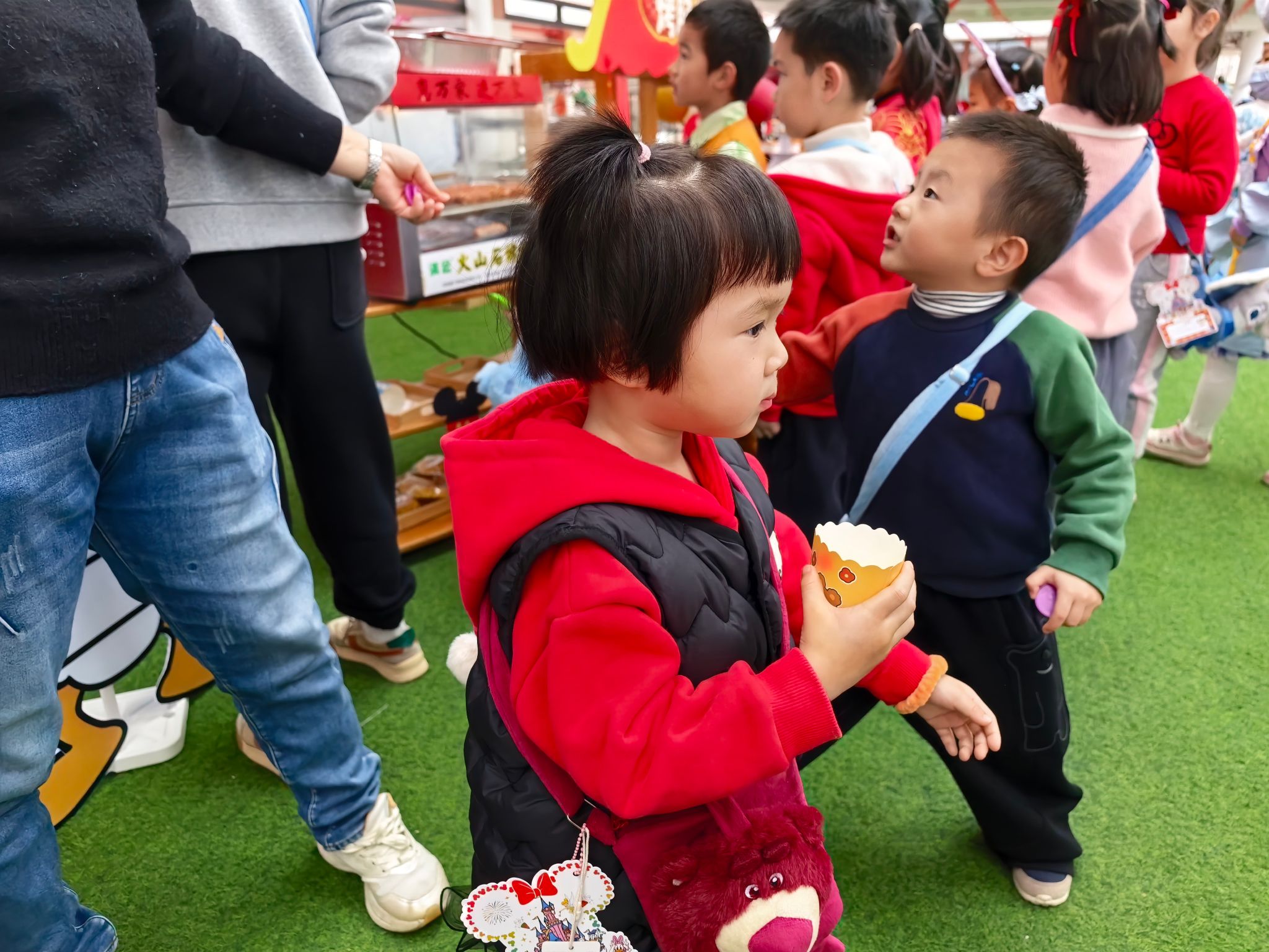 游园会的压轴环节,当属人气爆棚的童趣美食街。美食街里,糖葫芦、棉花糖、爆米花、烤香肠等经典小吃一应俱全,香气四溢,让人垂涎欲滴。宝贝们有的举着糖葫芦开心地炫耀,有的捧着棉花糖小心翼翼地品尝,有的和小伙伴分享着爆米花,一张张笑脸在美食的映衬下,显得格外灿烂。