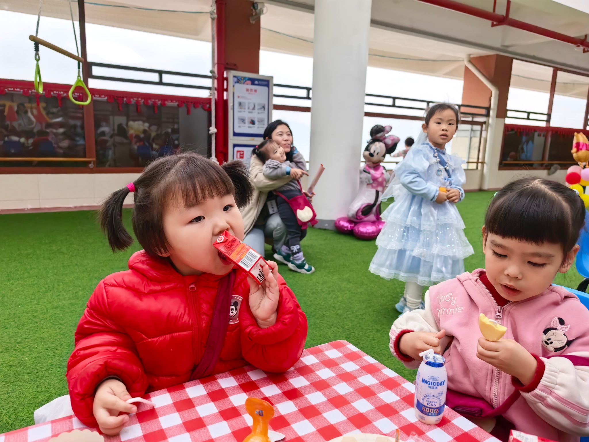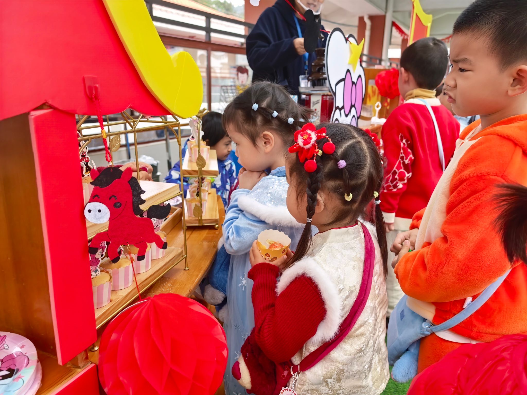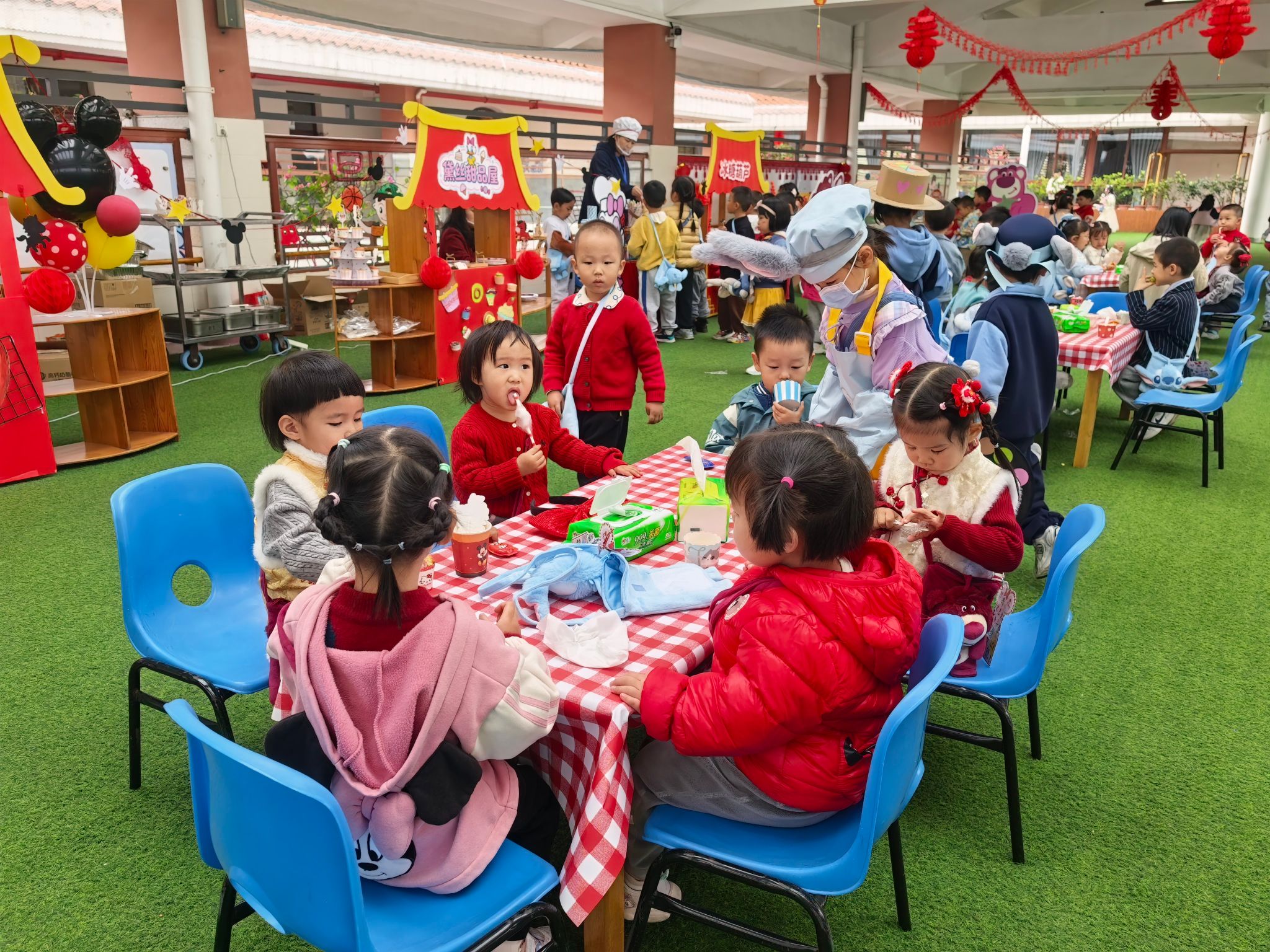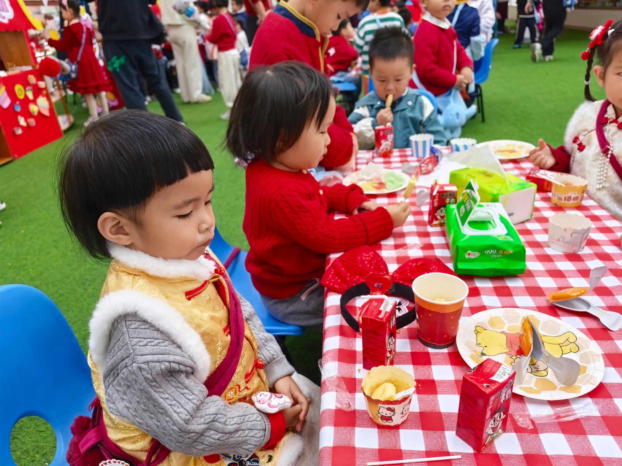 游园会的压轴环节,当属人气爆棚的童趣美食街。美食街里,糖葫芦、棉花糖、爆米花、烤香肠等经典小吃一应俱全,香气四溢,让人垂涎欲滴。宝贝们有的举着糖葫芦开心地炫耀,有的捧着棉花糖小心翼翼地品尝,有的和小伙伴分享着爆米花,一张张笑脸在美食的映衬下,显得格外灿烂。