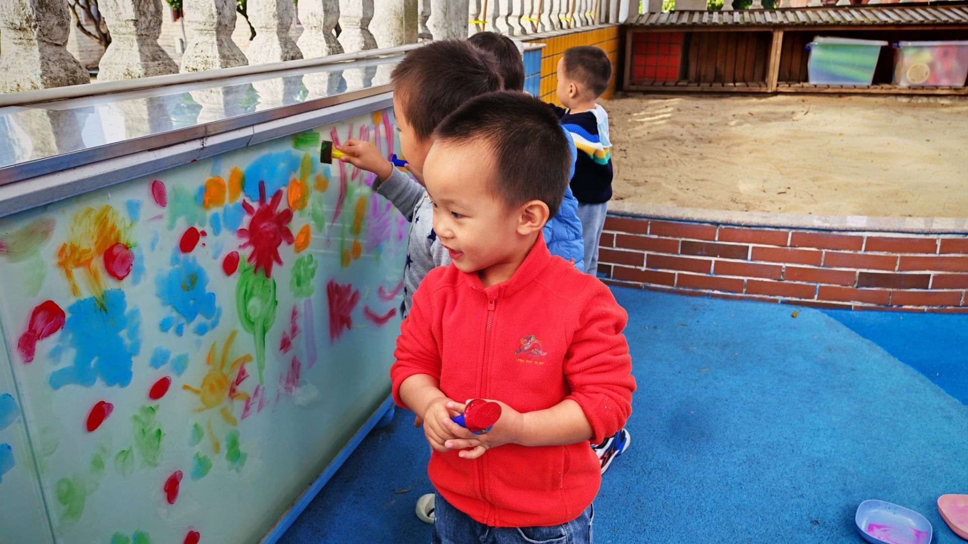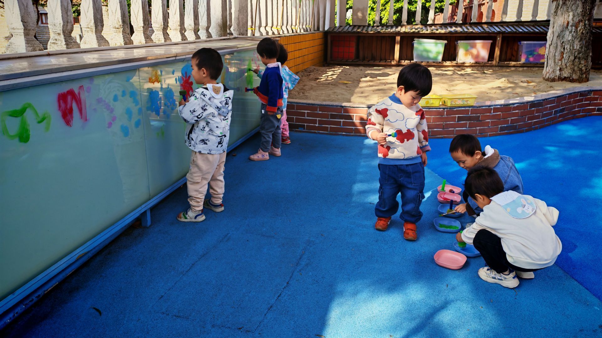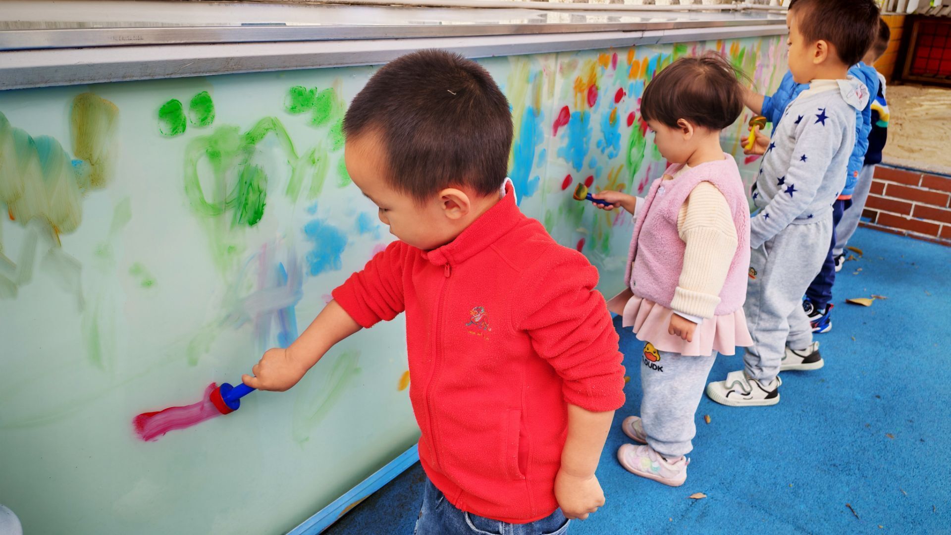 阳光洒在涂鸦墙的玻璃上,小朋友们的欢笑声飘满了小院子。蓝红的地面上摆着彩色颜料盘,穿蓝色外套的小家伙正弯腰蘸取颜料,其他小伙伴有的举着画笔在墙上涂抹,有的踮着脚构思图案。斑斓的色彩在墙上蔓延,每一抹都是孩子们无拘无束的快乐,这是专属于他们的创意乐园呀。