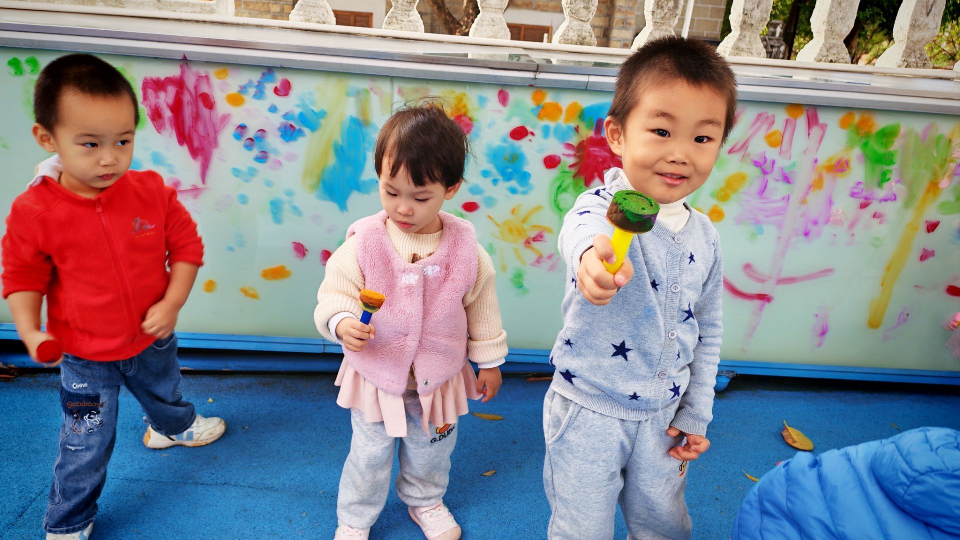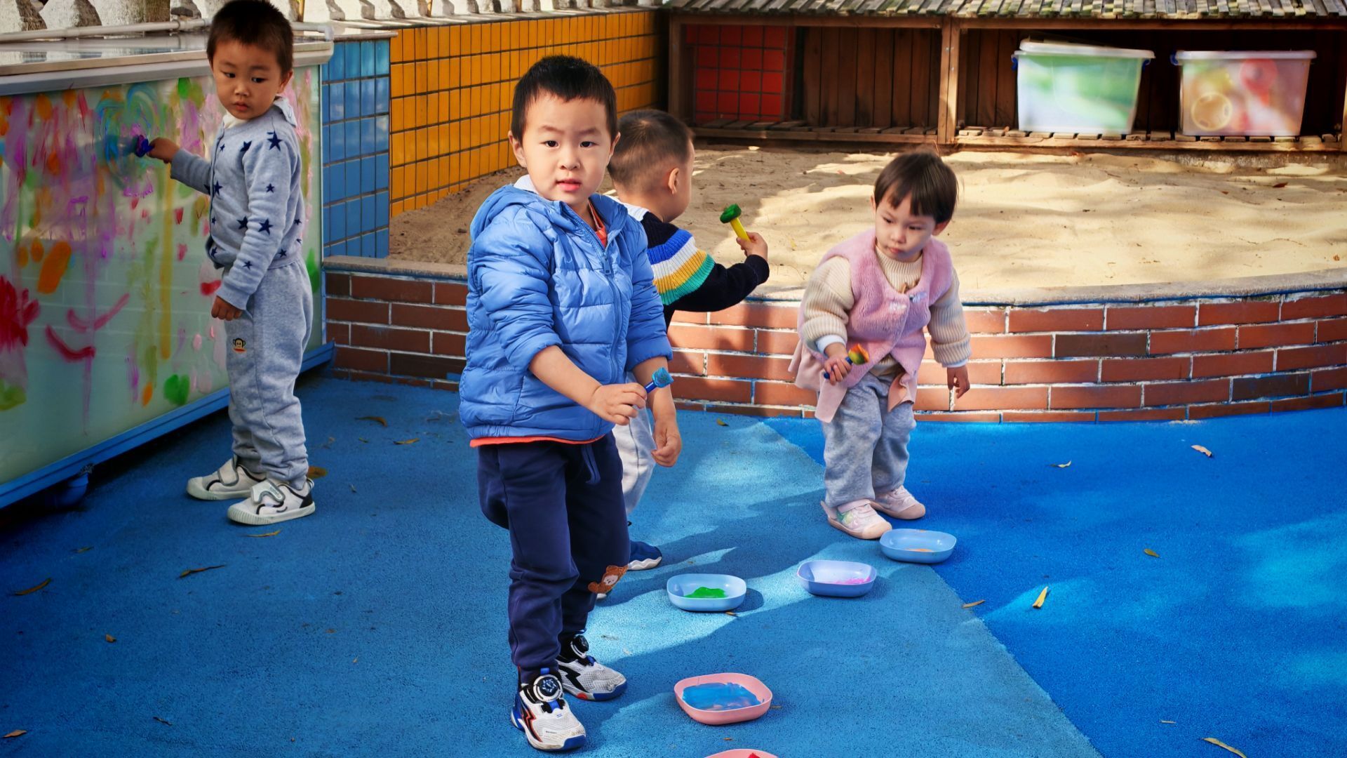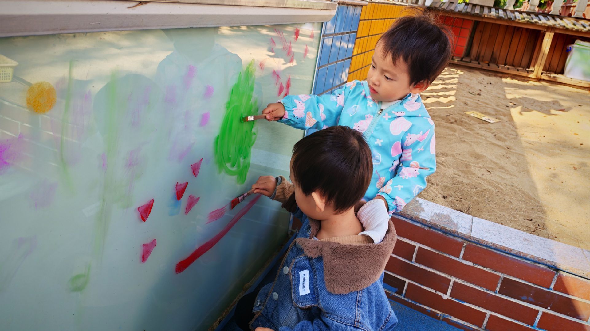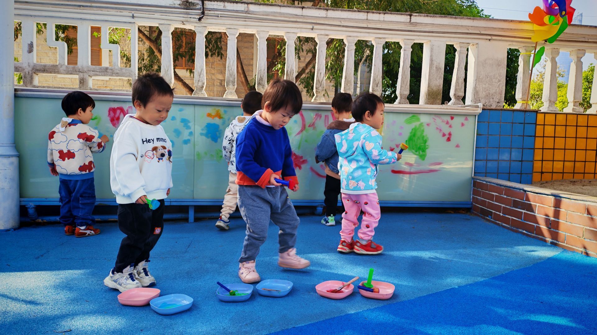 阳光洒在涂鸦墙的玻璃上,小朋友们的欢笑声飘满了小院子。蓝红的地面上摆着彩色颜料盘,穿蓝色外套的小家伙正弯腰蘸取颜料,其他小伙伴有的举着画笔在墙上涂抹,有的踮着脚构思图案。斑斓的色彩在墙上蔓延,每一抹都是孩子们无拘无束的快乐,这是专属于他们的创意乐园呀。