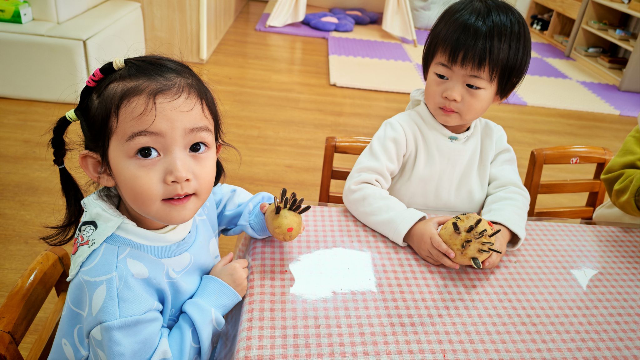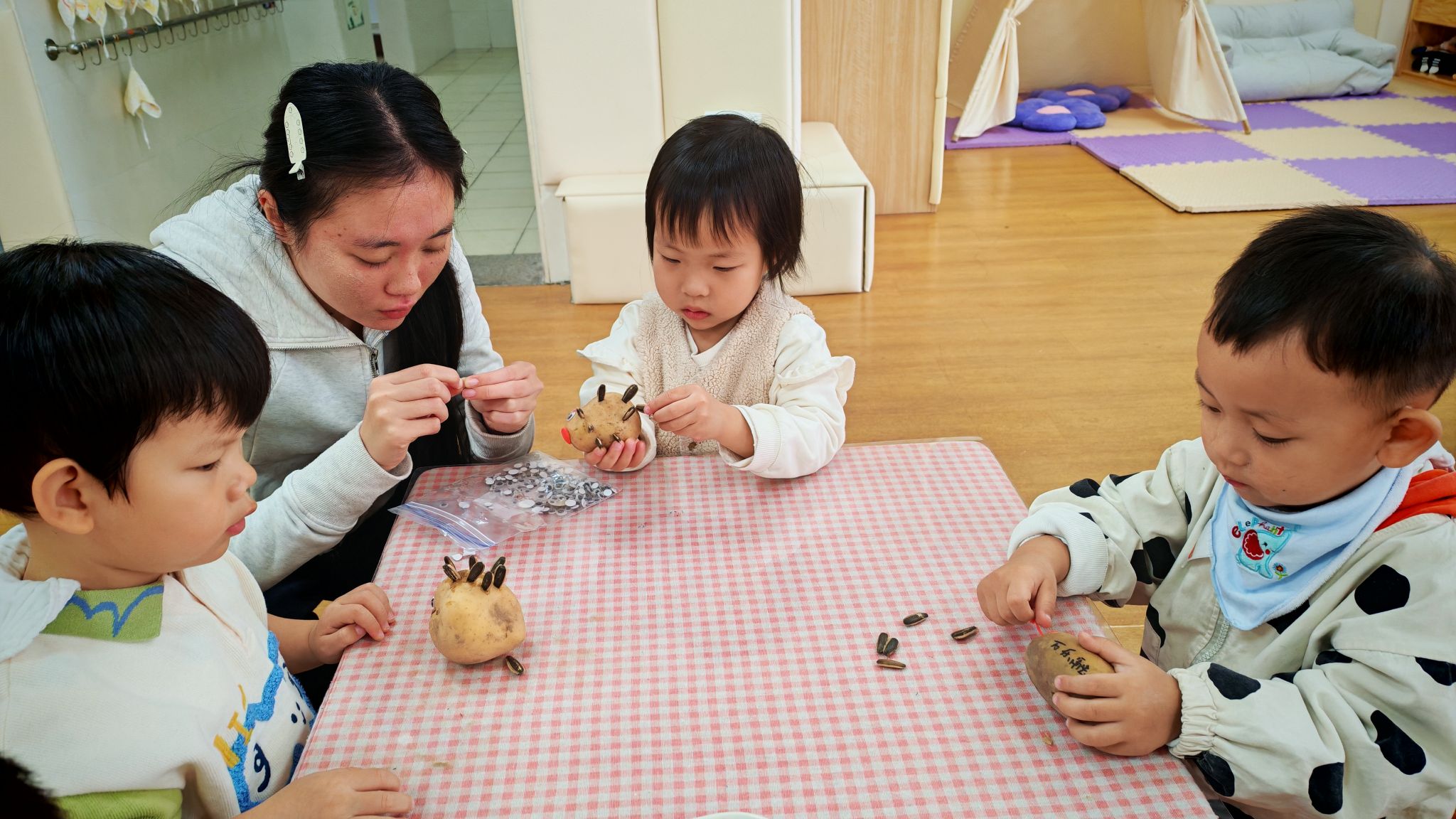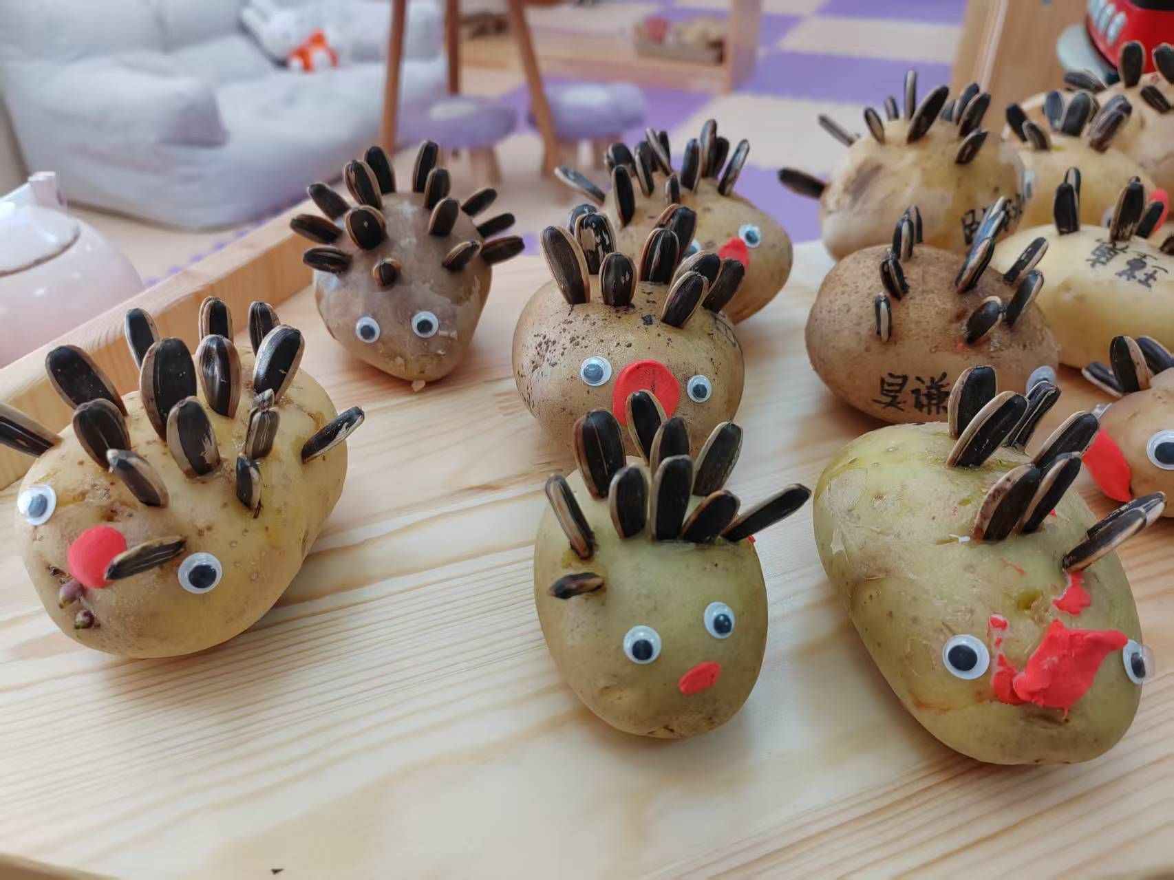 圆圆的土豆、黑黑的瓜子壳,在孩子们的小手里,摇身一变成了憨态可掬的小刺猬。一双双稚嫩的小手认真地粘贴瓜子壳当刺,给土豆贴上圆圆的眼睛、抹上红红的小嘴,专注的模样格外可爱。每一只小刺猬都带着独属于孩子的奇思妙想,有的“刺”歪歪扭扭,有的脸蛋红扑扑,看似简单的手工,却是孩子们想象力与动手能力的完美展现,也让普通的食材变成了充满童趣的艺术品。