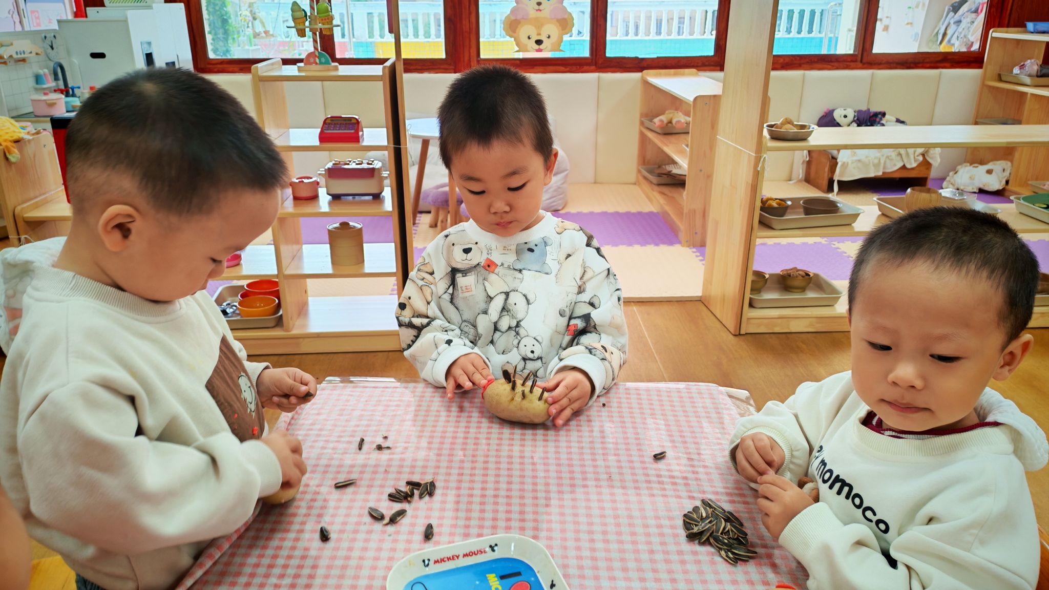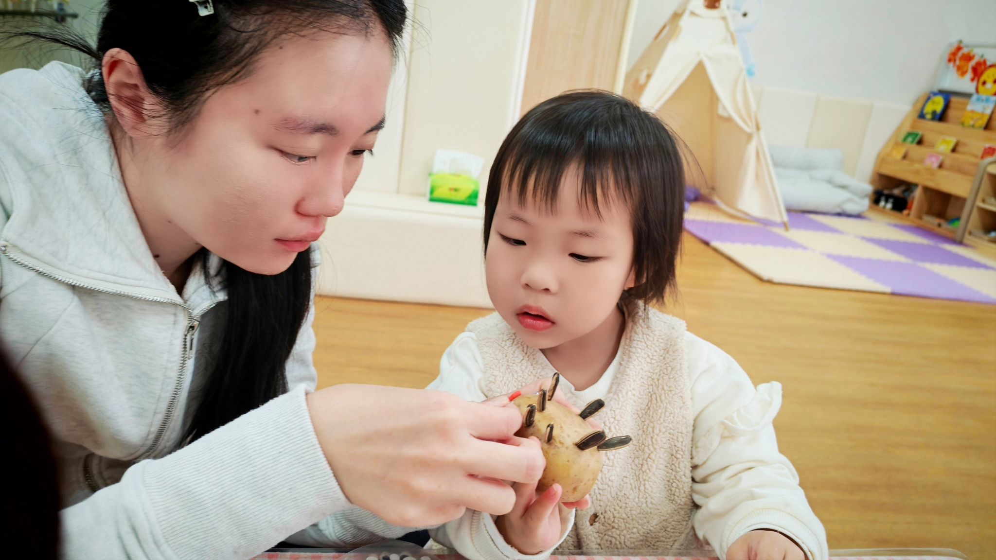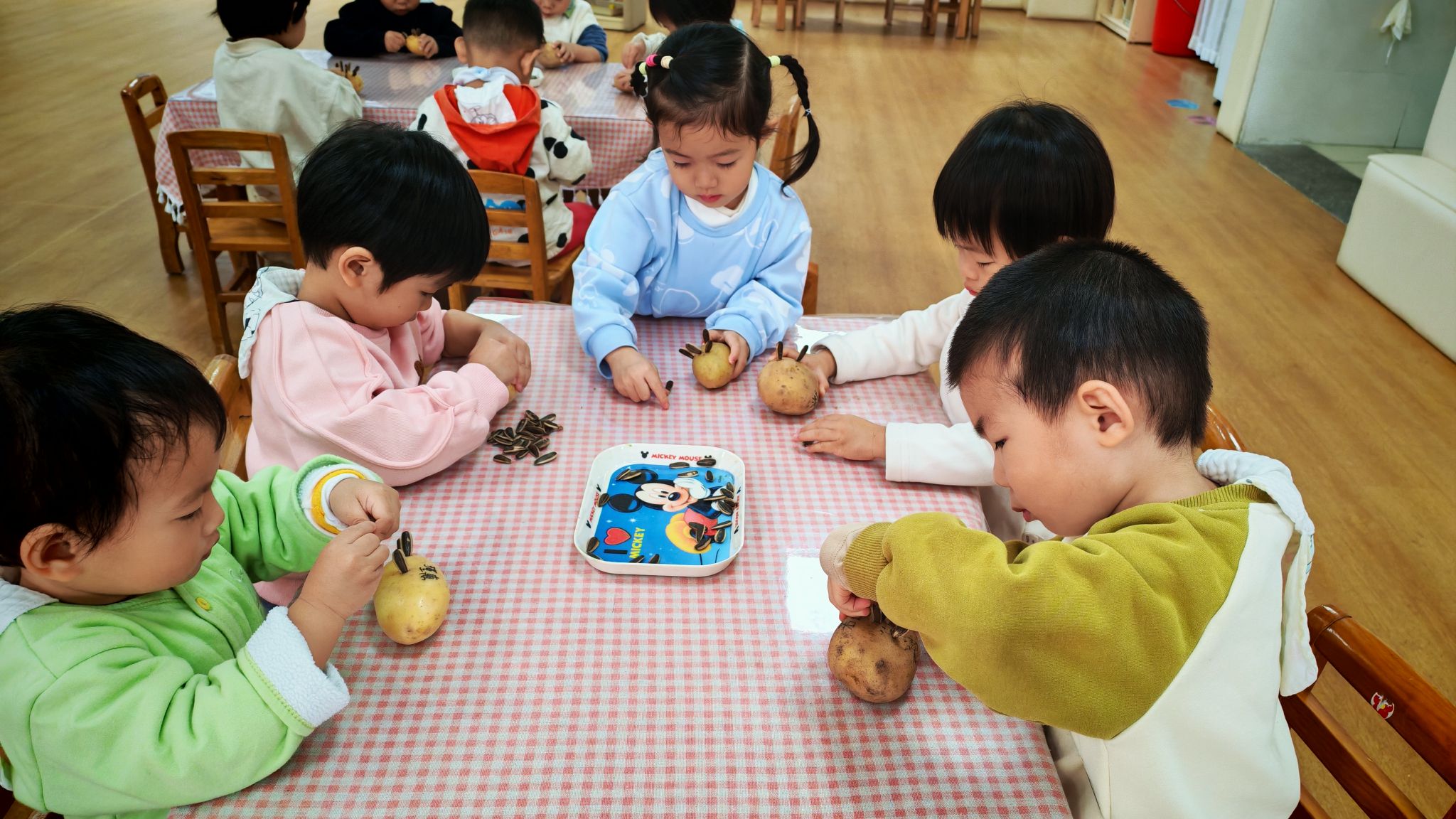 圆圆的土豆、黑黑的瓜子壳,在孩子们的小手里,摇身一变成了憨态可掬的小刺猬。一双双稚嫩的小手认真地粘贴瓜子壳当刺,给土豆贴上圆圆的眼睛、抹上红红的小嘴,专注的模样格外可爱。每一只小刺猬都带着独属于孩子的奇思妙想,有的“刺”歪歪扭扭,有的脸蛋红扑扑,看似简单的手工,却是孩子们想象力与动手能力的完美展现,也让普通的食材变成了充满童趣的艺术品。
