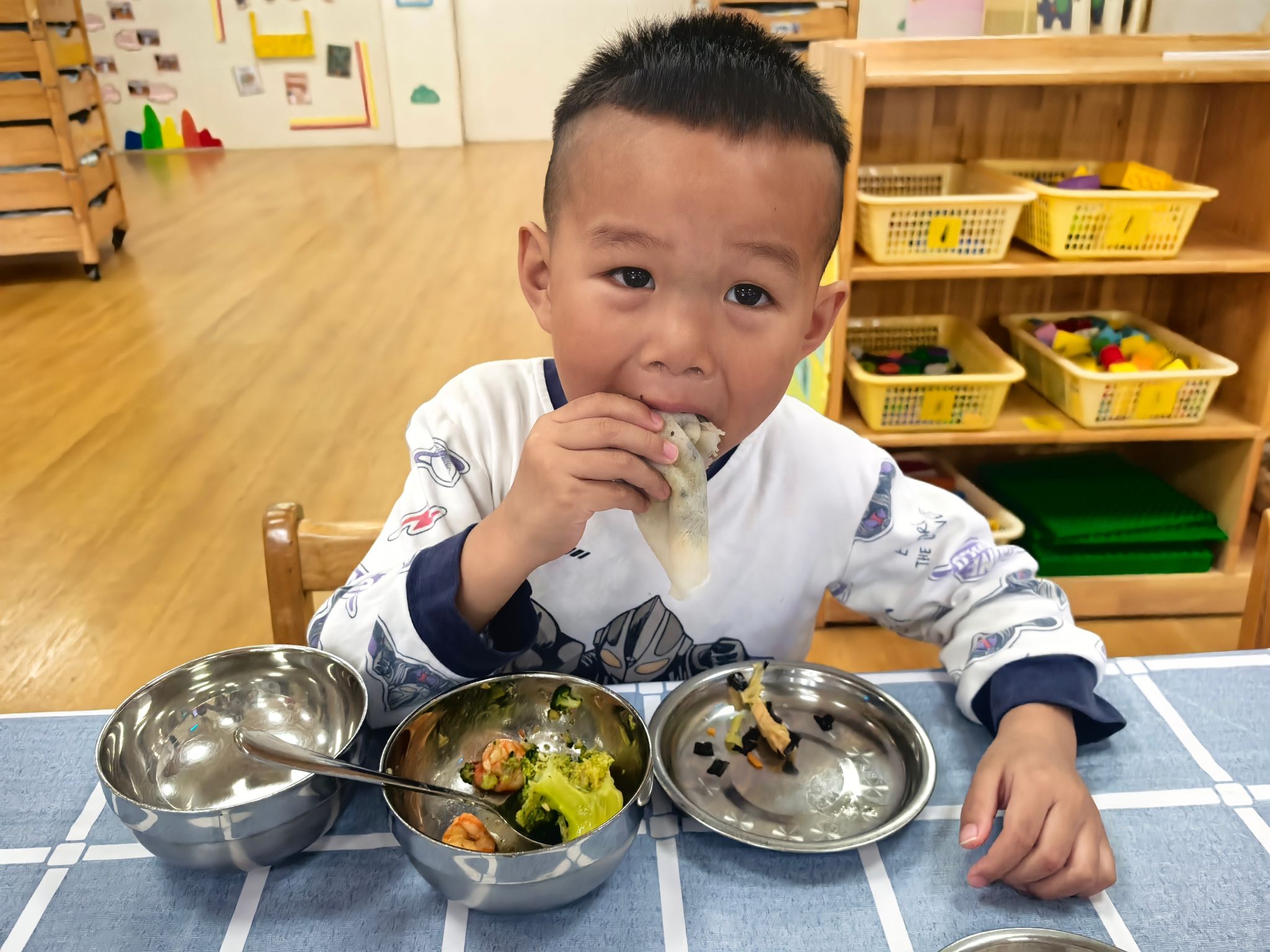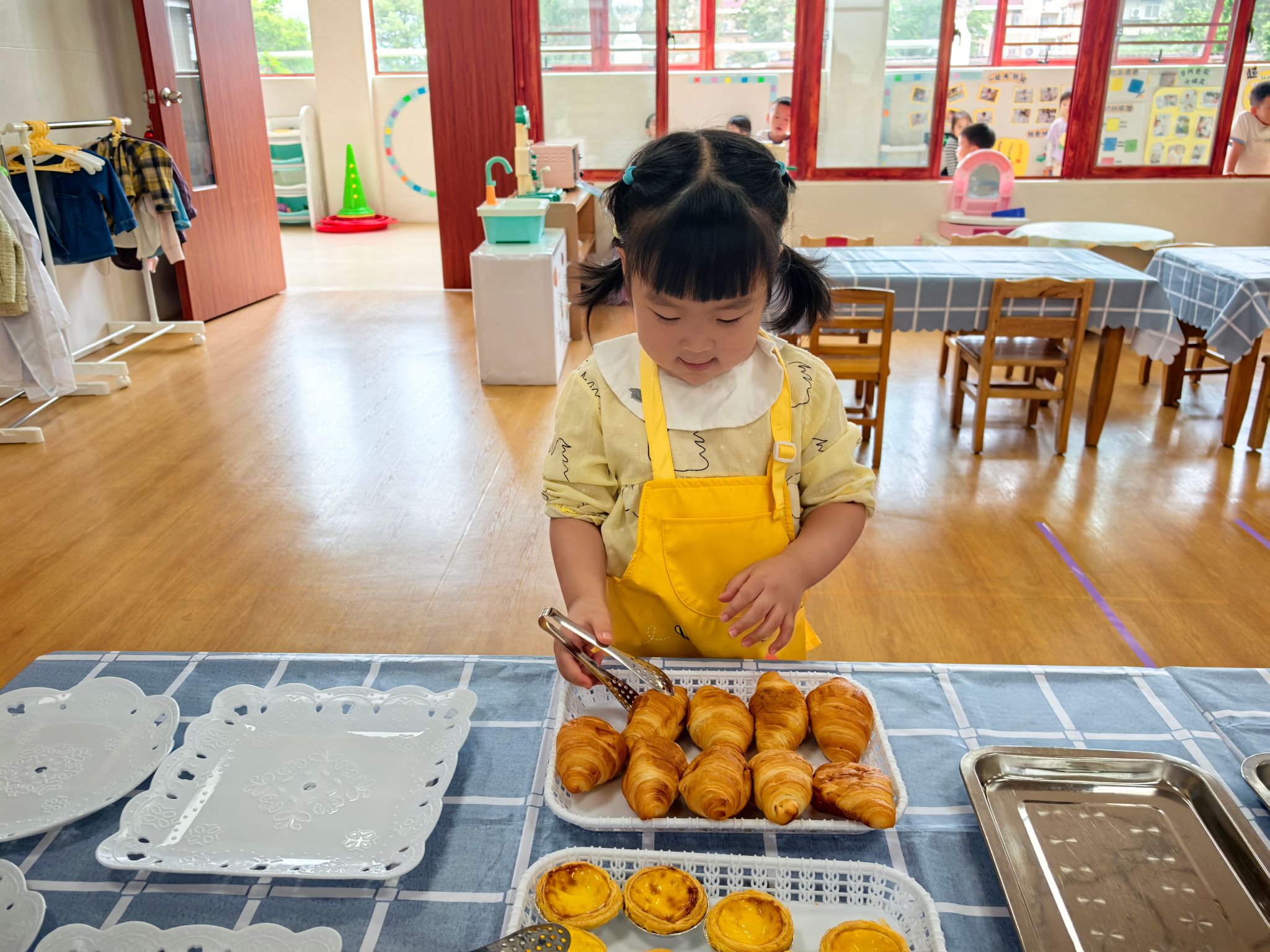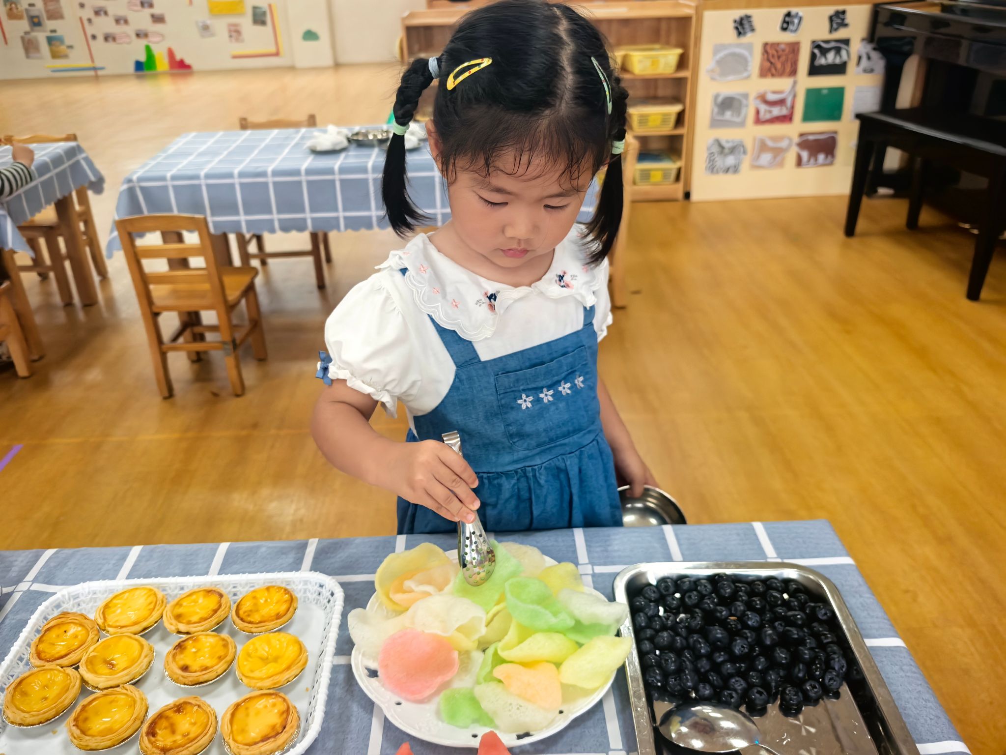 一口甜蜜,十分快乐。“我要把最大的蓝莓给旁边的楚楚!”取餐时,孩子们一手端着餐盘,一手比划着“按需拿取”,还会主动询问同伴“你想尝尝这个吗”。围坐在一起用餐时,有的孩子把自己最爱的蛋挞分享给同伴,有的边吃边感叹“自己摆的食物太香啦”,小脸上洋溢着“劳动成果被品尝”的满足感。