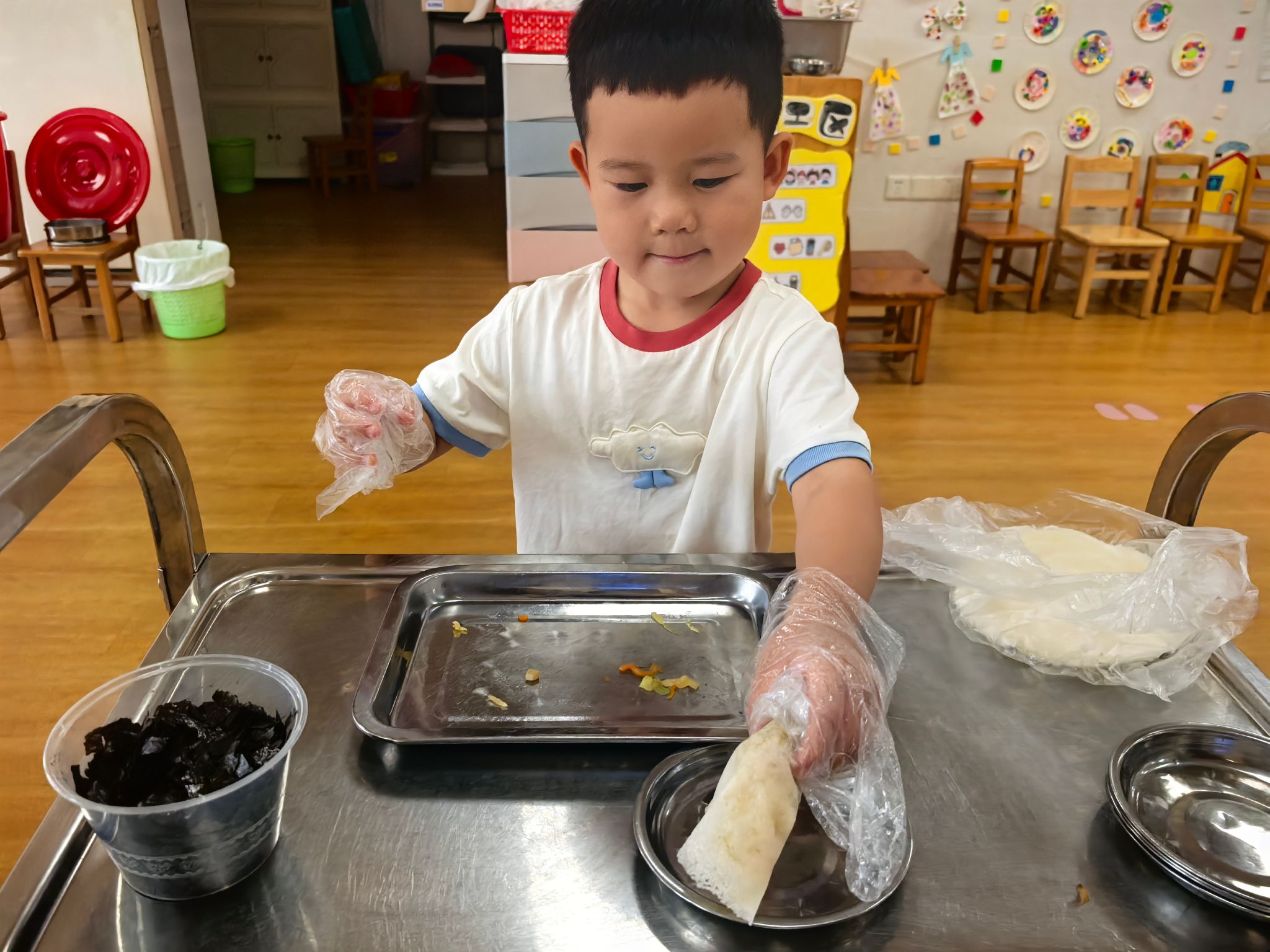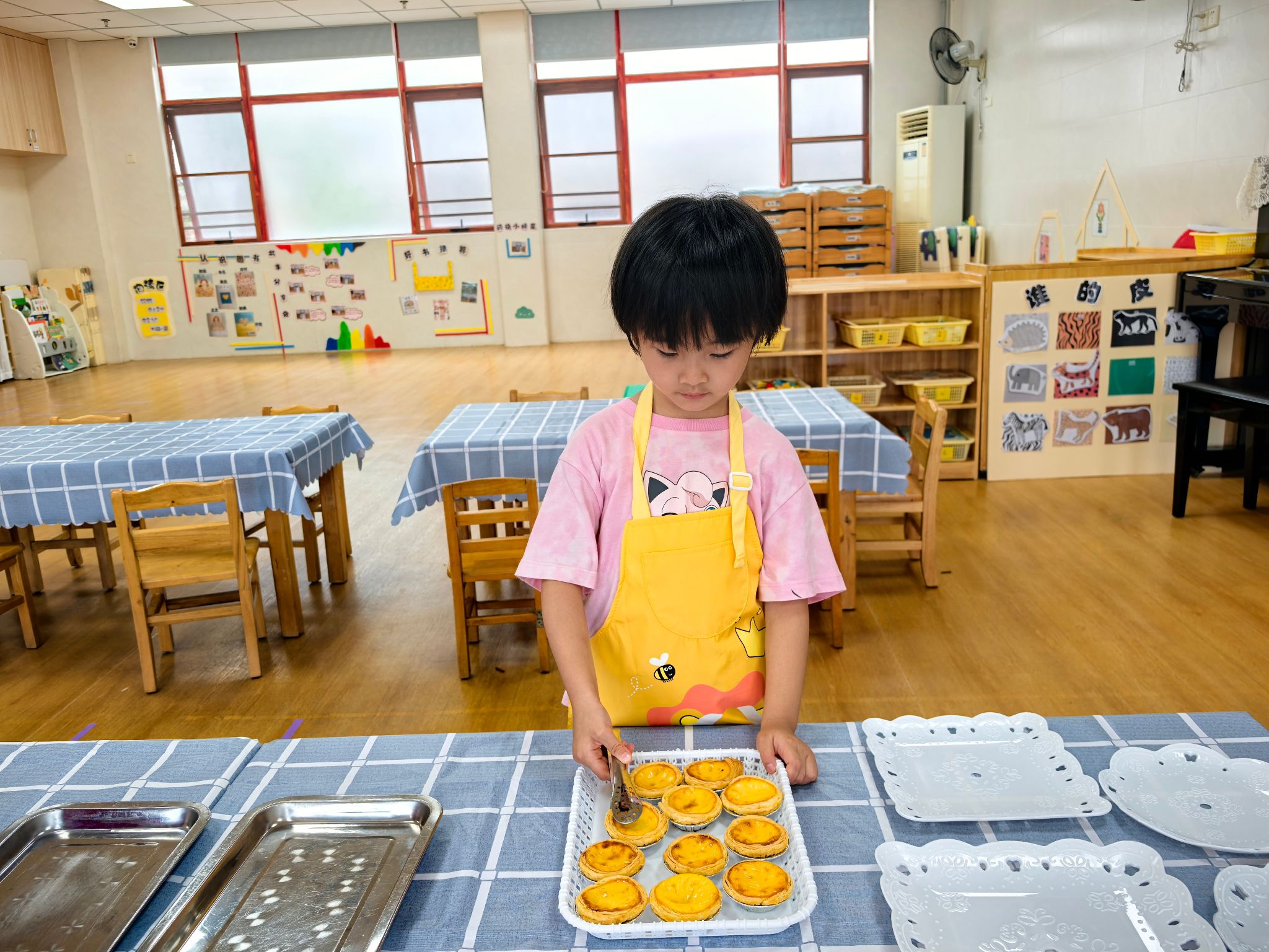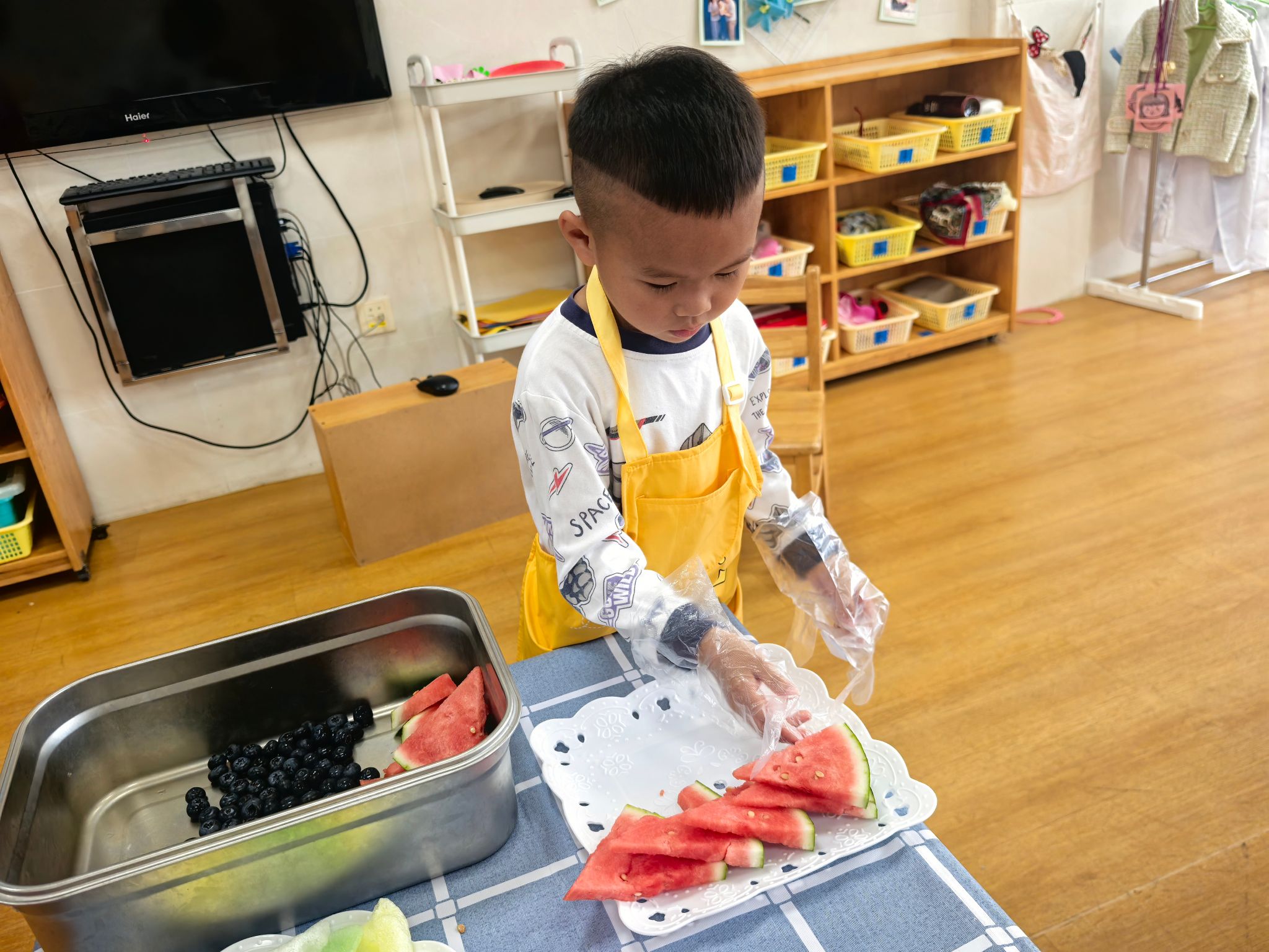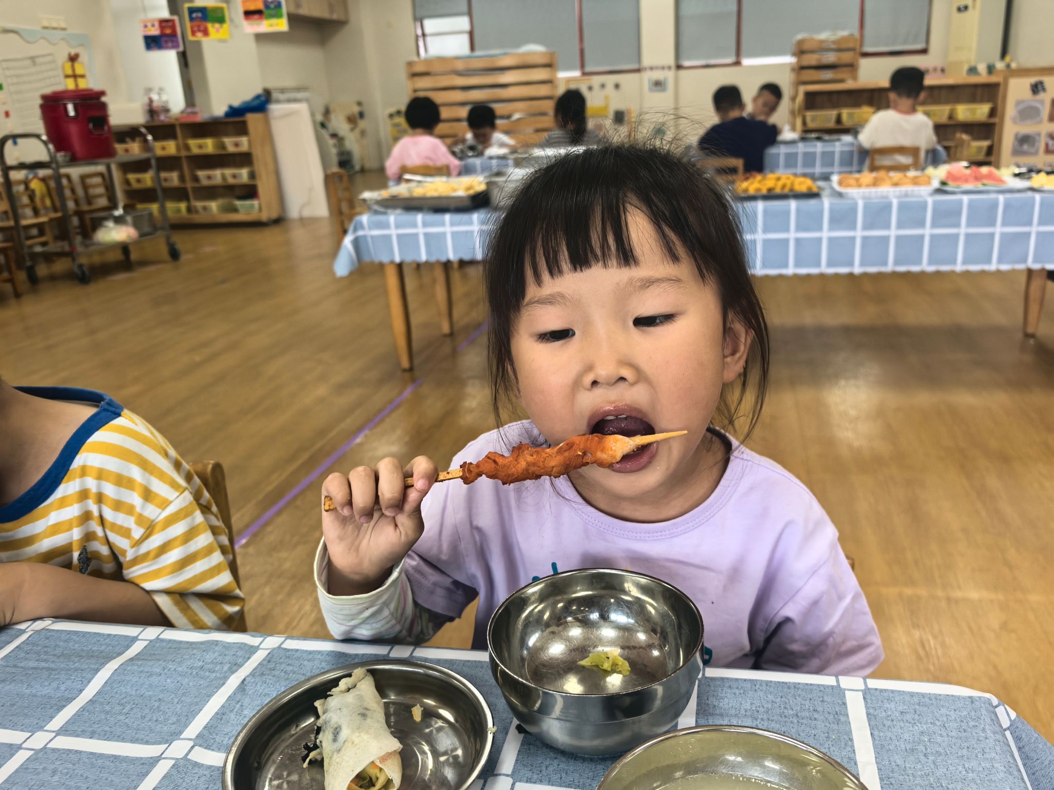 一口甜蜜,十分快乐。“我要把最大的蓝莓给旁边的楚楚!”取餐时,孩子们一手端着餐盘,一手比划着“按需拿取”,还会主动询问同伴“你想尝尝这个吗”。围坐在一起用餐时,有的孩子把自己最爱的蛋挞分享给同伴,有的边吃边感叹“自己摆的食物太香啦”,小脸上洋溢着“劳动成果被品尝”的满足感。