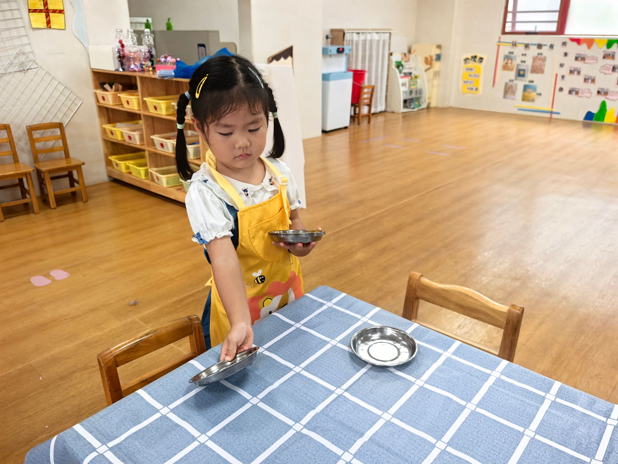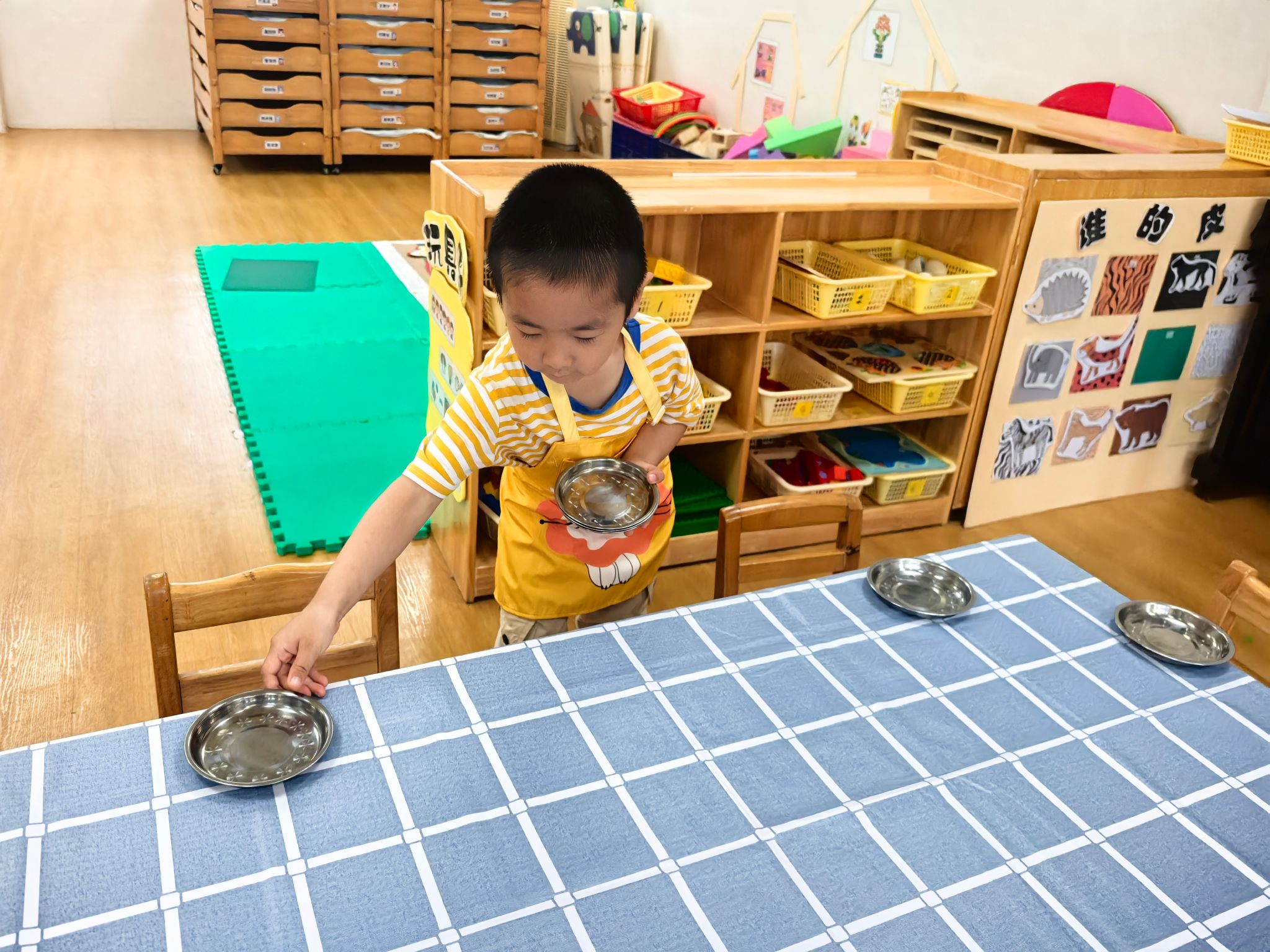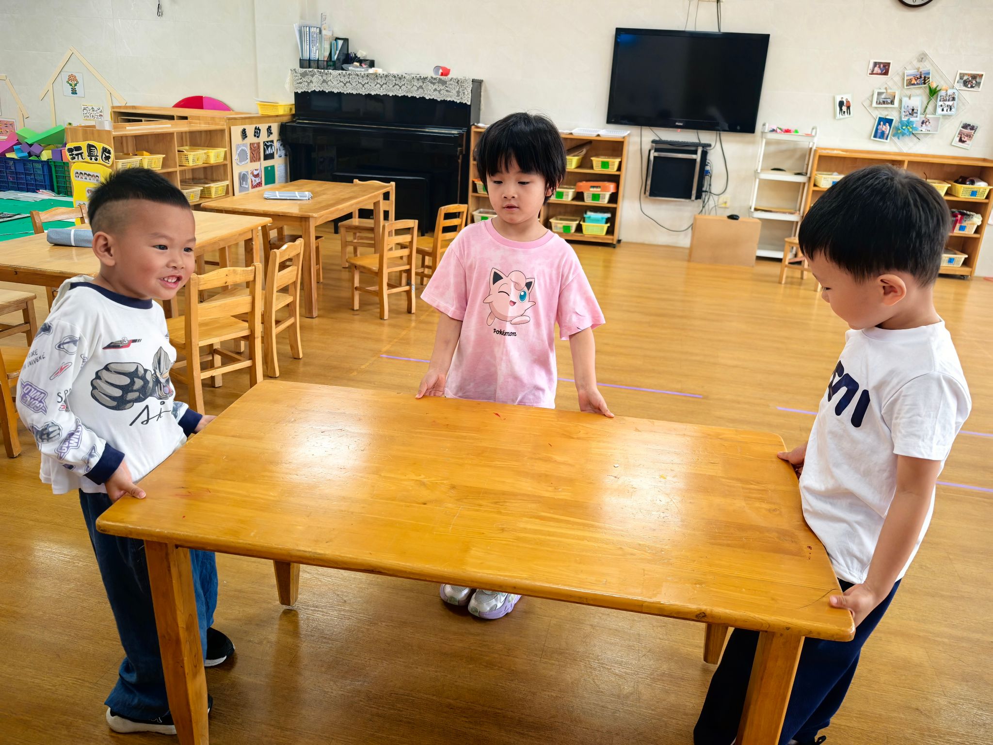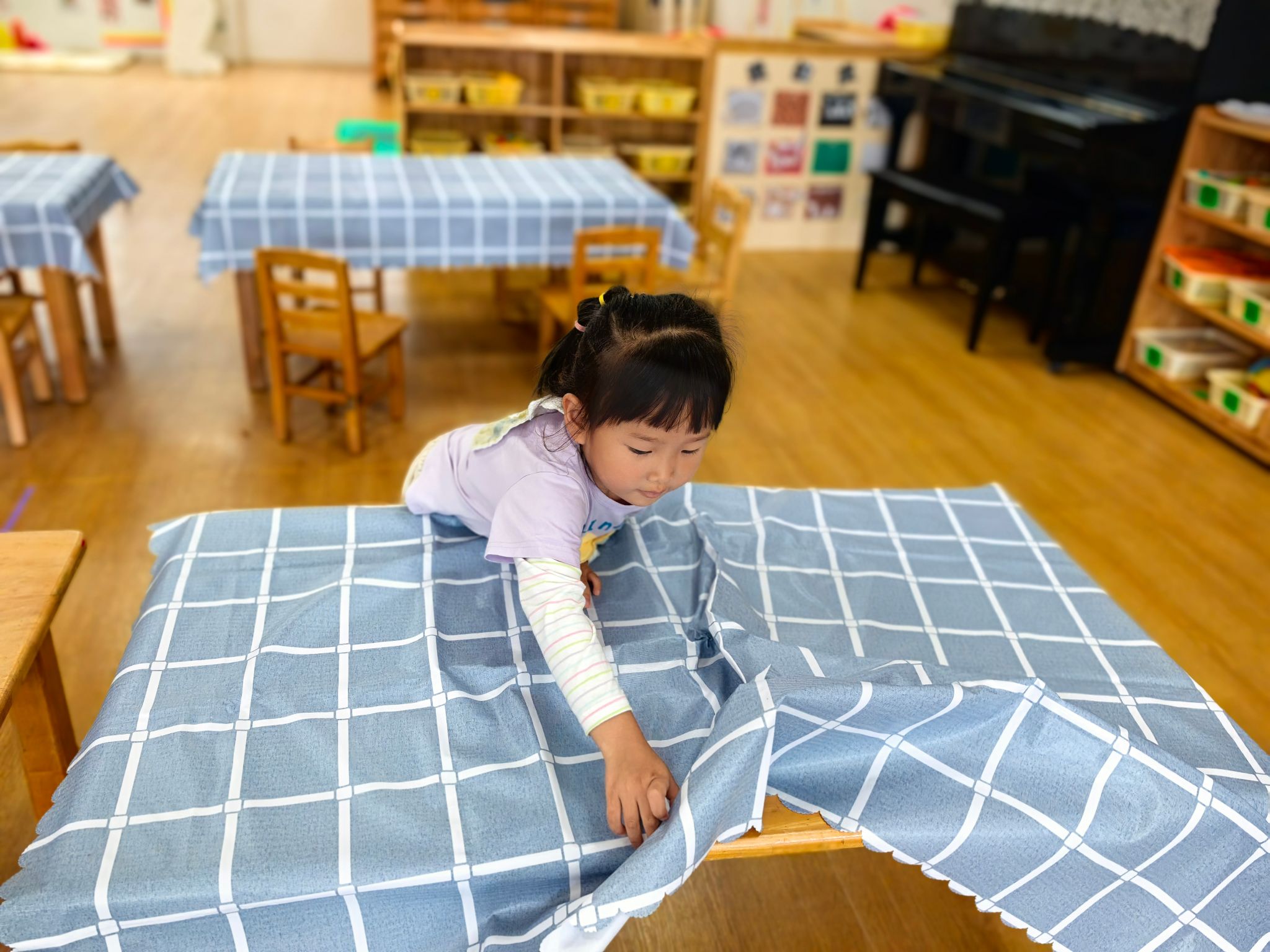 小身体藏着大能量。自助餐开始前,孩子们分组合作搬移小桌子、小椅子,学着按尺寸对齐桌椅边线;拎起花纹桌布时,尽管小手被布料“吞没”,仍歪着脑袋努力将桌布铺平整,时不时和同伴商量“这边要拉平哦”……活动室瞬间变身温馨的“自助餐厅”,孩子们拍着小手喊:“我们布置好啦!”