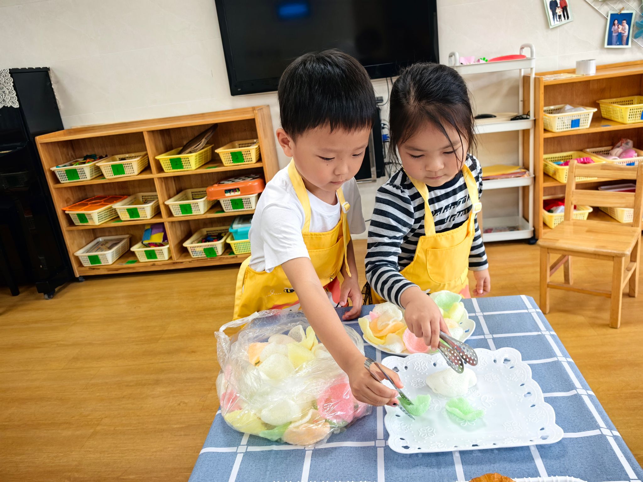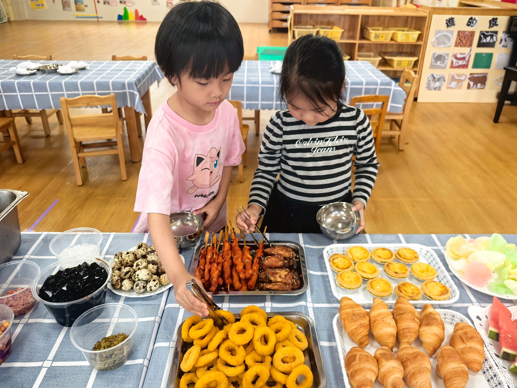 舌尖美味从动手开始。“勺子要朝着小朋友拿的方向哦!”在老师引导下,孩子们轻轻地把水果、小点心分类装盘:有的轻轻摆放牛角面包,有的小心翼翼堆叠蛋挞,还不忘提醒同伴“别压到虾饼啦”。洋葱圈、薯条、鸡翅......等食物在餐台上“排排坐”,空气中满是食物的香气和孩子们的欢笑声。