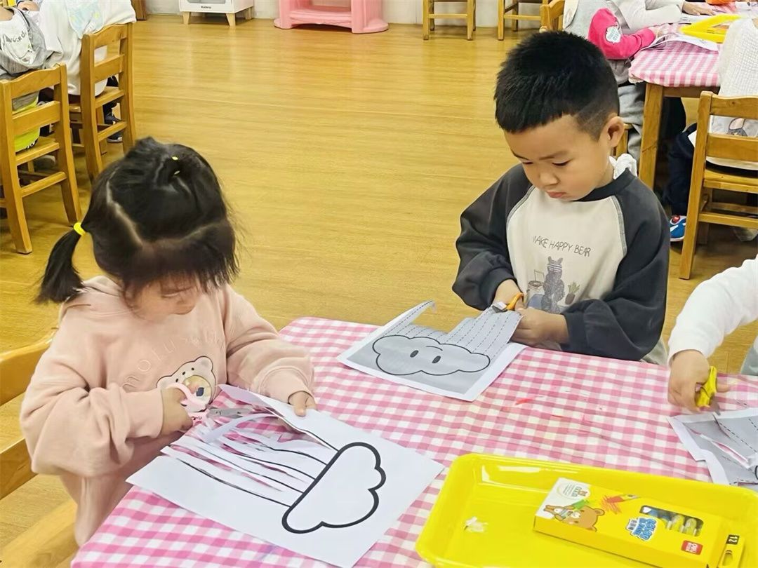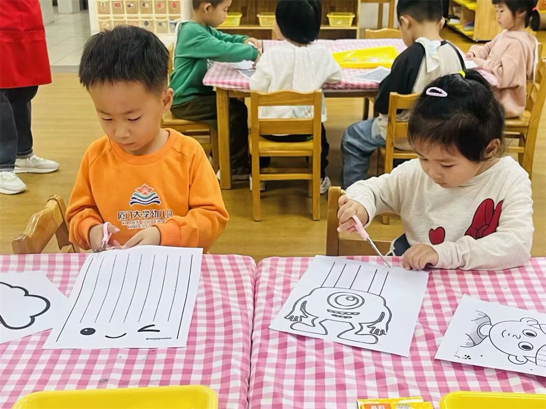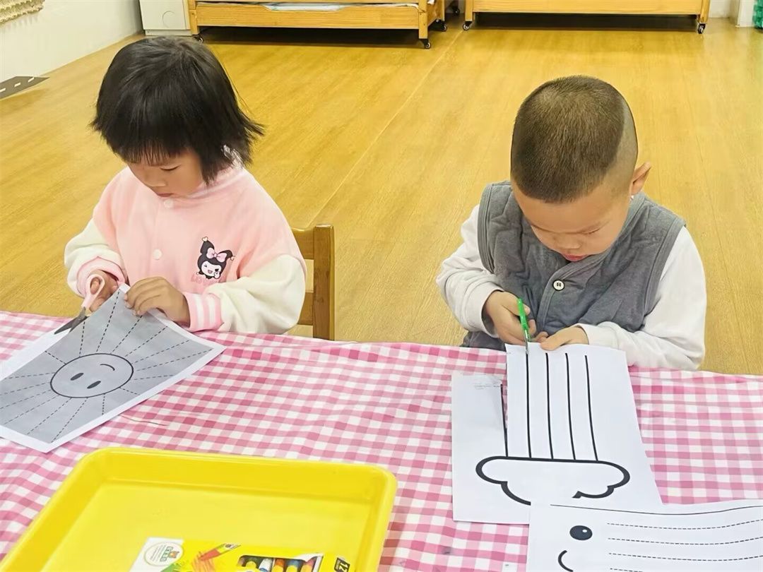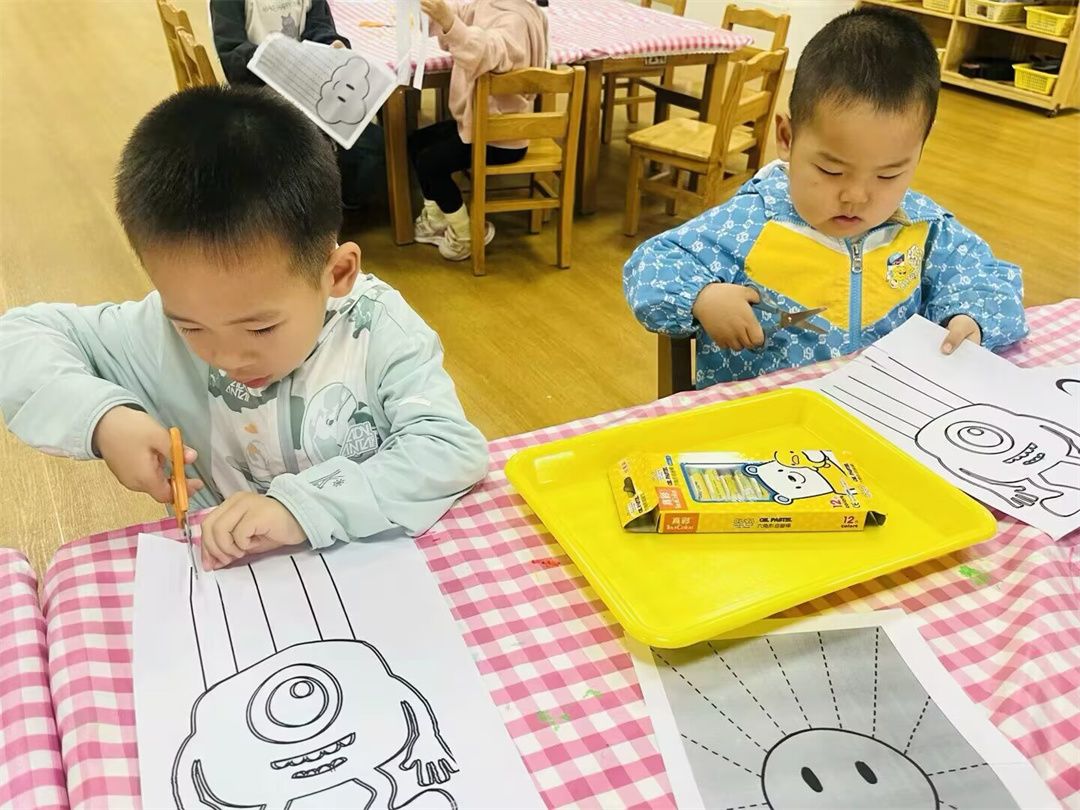咔嚓,咔嚓。小朋友们首次尝试使用剪刀创作,成果斐然。他们先沿着纸上的虚线剪出云朵、怪物、笑脸等图案,接着用油画棒为作品涂色,使其更加生动有趣。