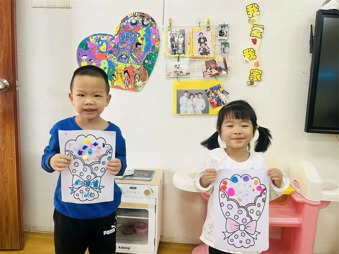 “妈妈,节日快乐!”小朋友包含着对妈妈的爱意进行了一场创意十足的手工活动。他们用小纸片揉成团,作为花束的基础。接着,利用多色盘里的颜料,进行手指点画,为花束增添了五彩斑斓的点缀。每个小球都色彩鲜艳,形状各异,让花束更加生动有趣。
