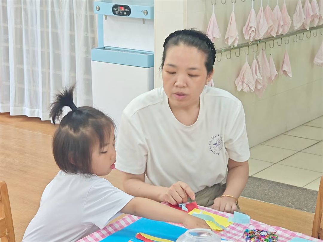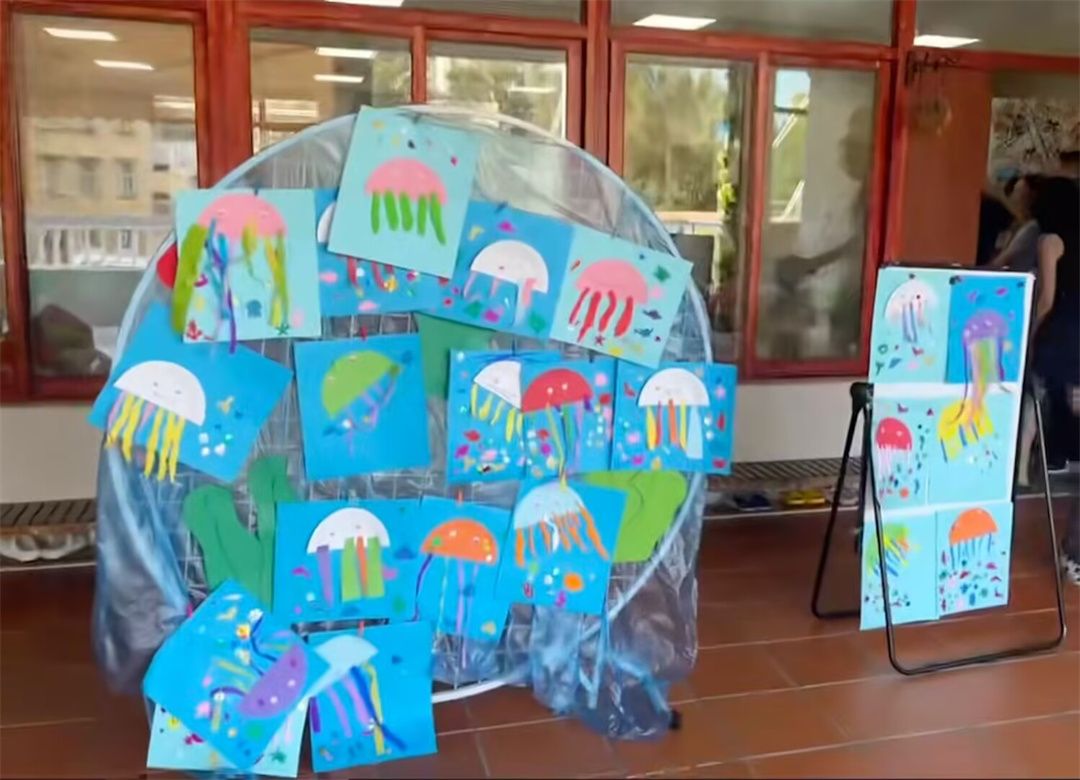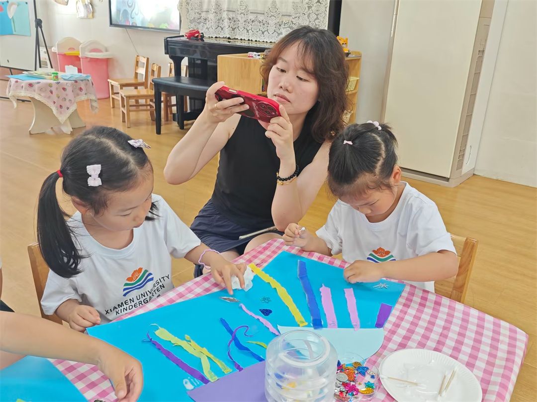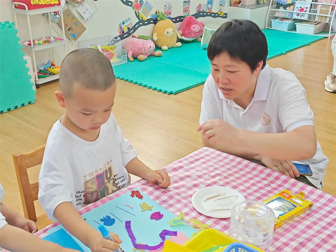家长开放日当天,小朋友在父母的陪伴下,利用各种材料制作独属于自己的水母宝宝。“妈妈,你看我用粘土搓成长长的,作为水母的触手。”“爸爸,我除了水母,还贴了闪闪的贝壳哦!”