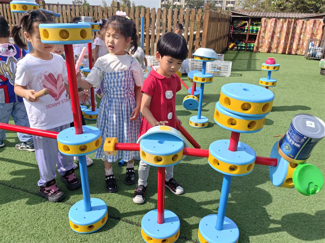 突然,“咚咚咚”的声音吸引了大家的注意。原来是双胞胎姐妹蹲在搭好的双层圆饼旁,正开心地用小物件敲打,玩得不亦乐乎。立柔好奇地凑过去,惊喜地喊道:“哇!这好像小鼓呀!”说着,她也拿起一根管子加入其中。清脆的敲击声此起彼伏,瞬间点燃了其他小朋友的热情纷纷加入。