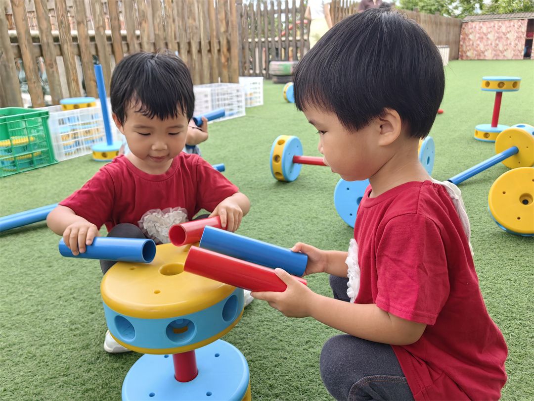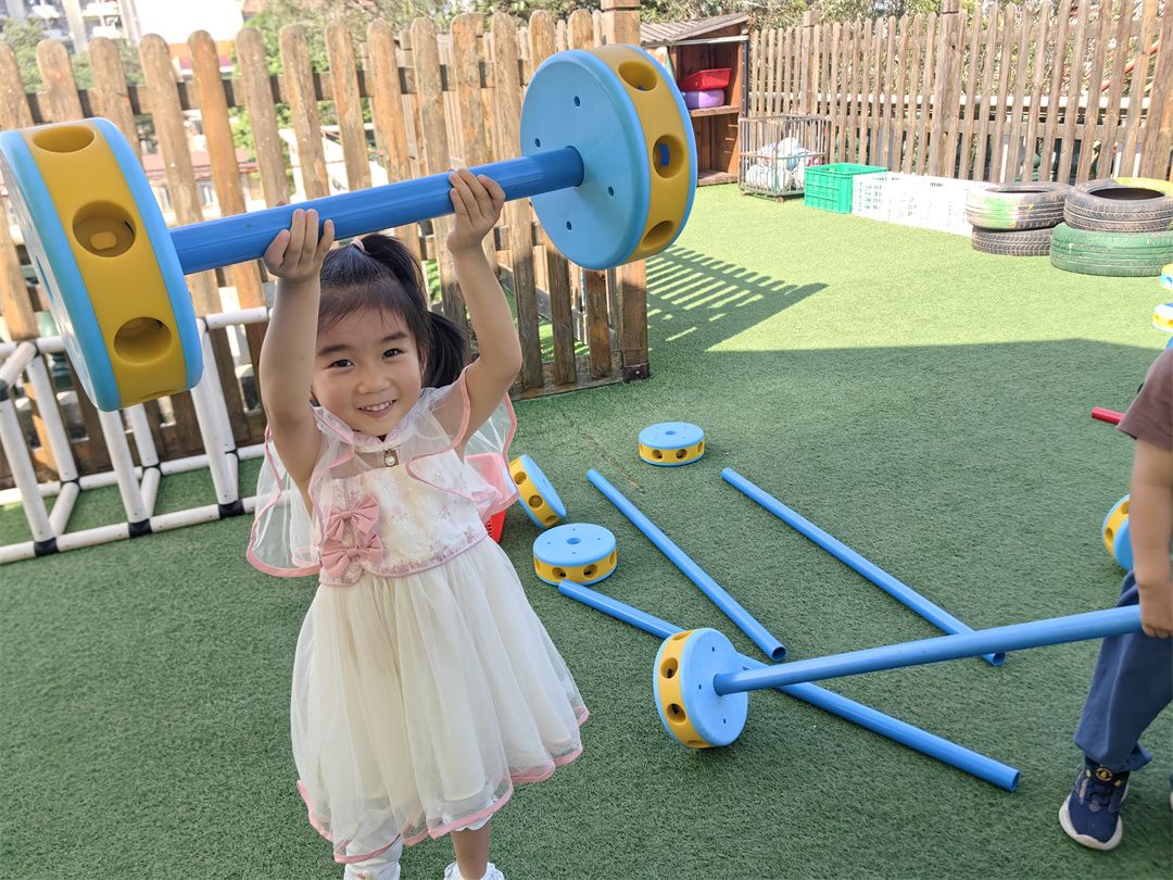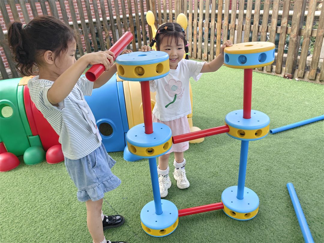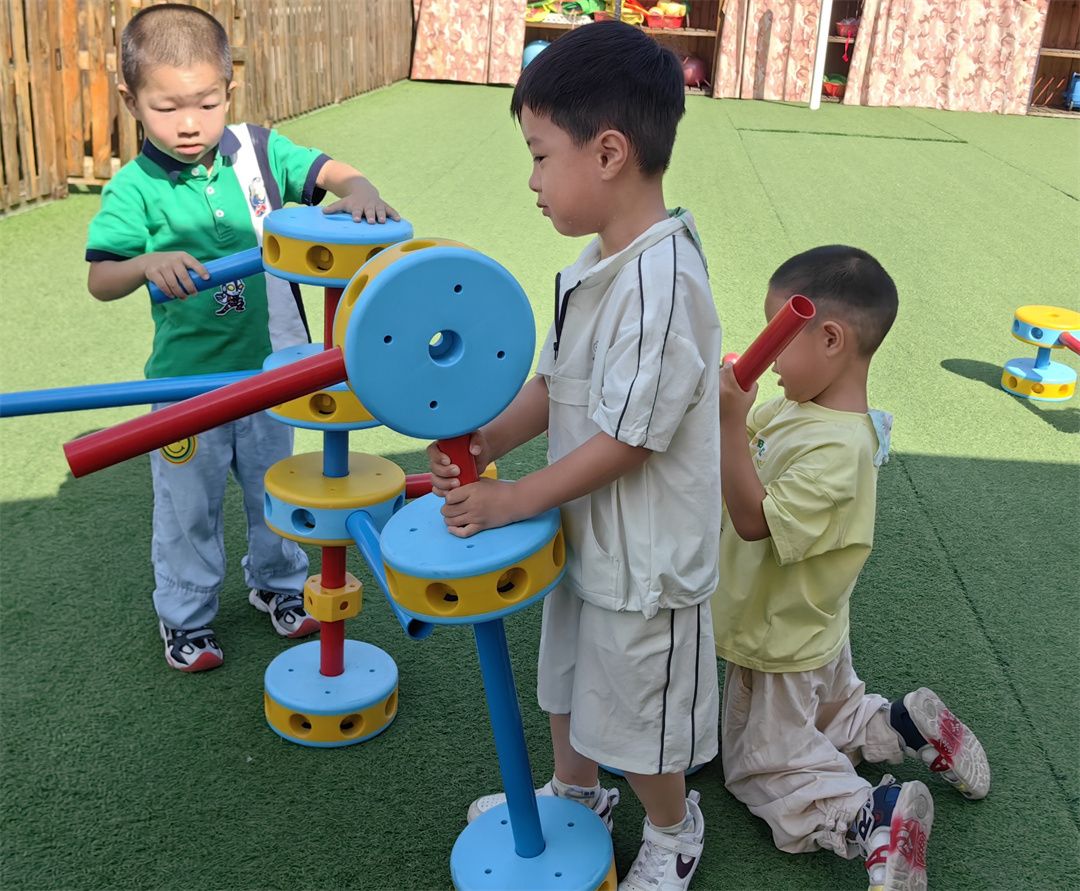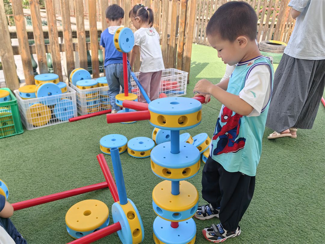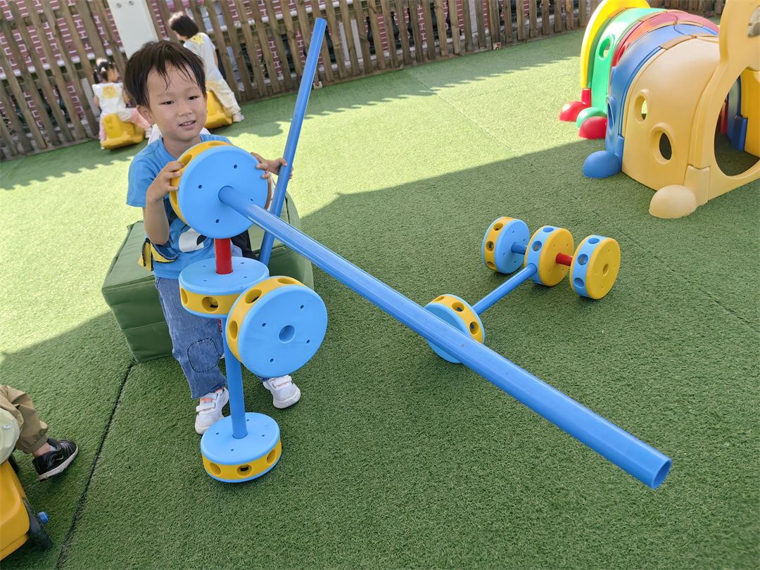 晨间户外活动,宝贝们迫不及待地投入到万能工匠的世界中。花花小手灵活摆弄,做出了一根“棒棒糖”脸上洋溢着灿烂的笑容;谢陶姝拼搭出“杠铃”像模像样地举重;以然在底座插上长管,化身“小小神枪手”,对着远处开枪射击“piupiupiu……” 。在孩子们稚嫩的小手操作中万能工匠不断变幻出充满童真的作品。