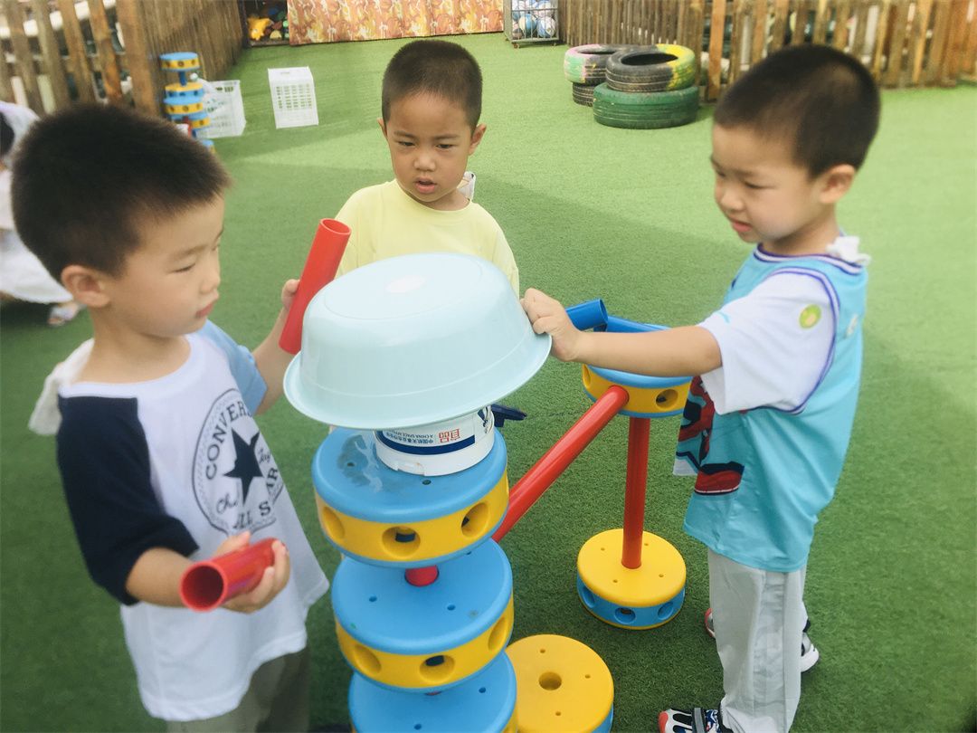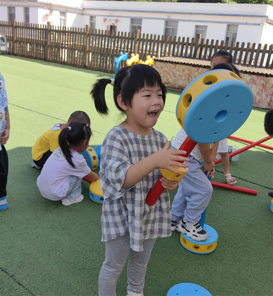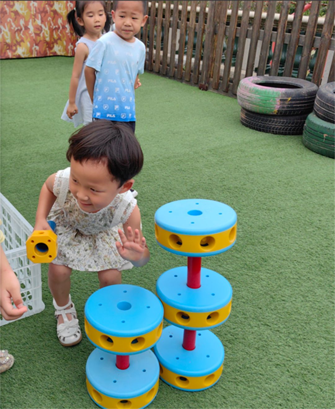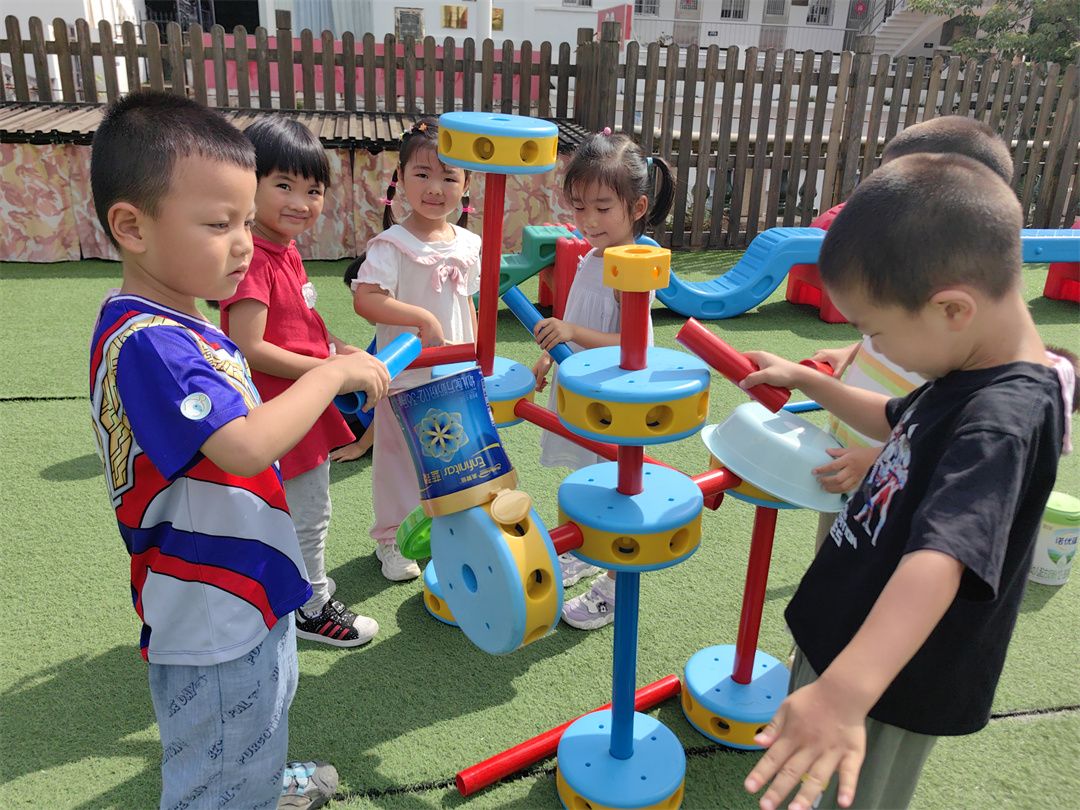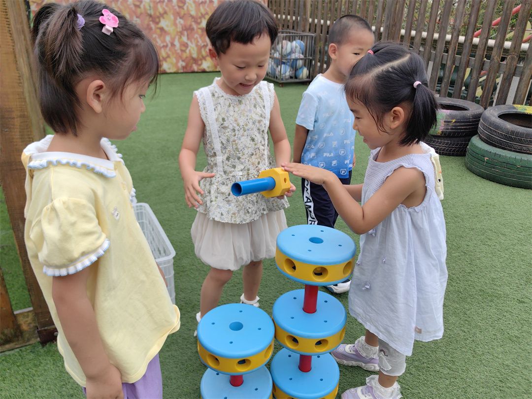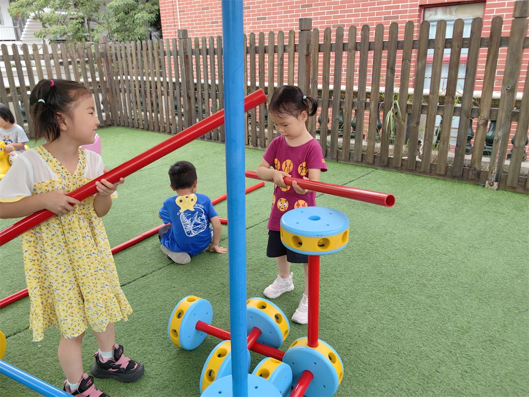 晨间户外活动,宝贝们迫不及待地投入到万能工匠的世界中。花花小手灵活摆弄,做出了一根“棒棒糖”脸上洋溢着灿烂的笑容;谢陶姝拼搭出“杠铃”像模像样地举重;以然在底座插上长管,化身“小小神枪手”,对着远处开枪射击“piupiupiu……” 。在孩子们稚嫩的小手操作中万能工匠不断变幻出充满童真的作品。
