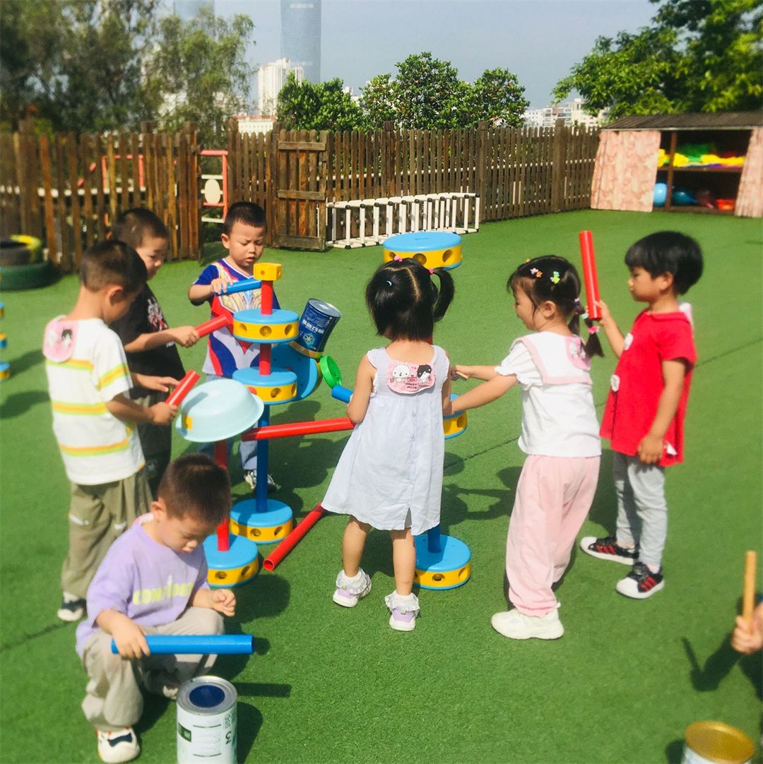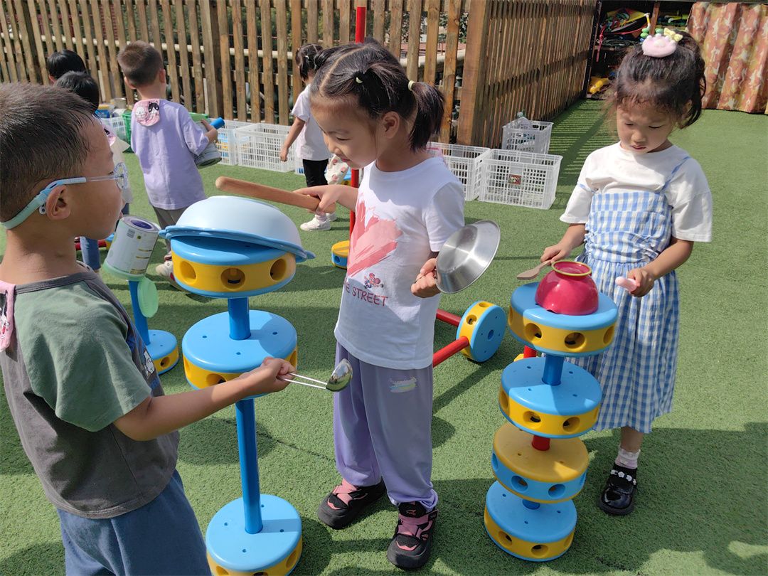 这边的“架子鼓”更是创意十足,小锅、小盆、奶粉罐,大家拿着各种“鼓槌”叮叮咚咚、乒乒嘭嘭……,整个户外场地俨然变成一片欢乐的“打击乐”现场。