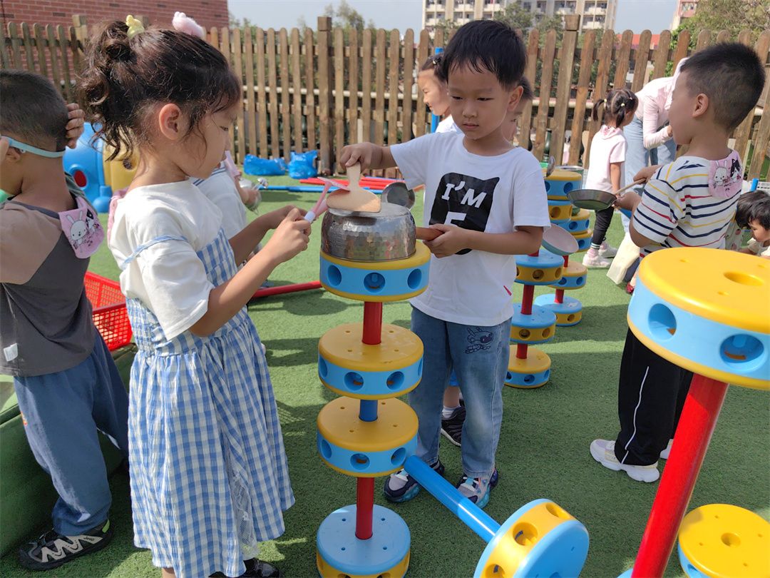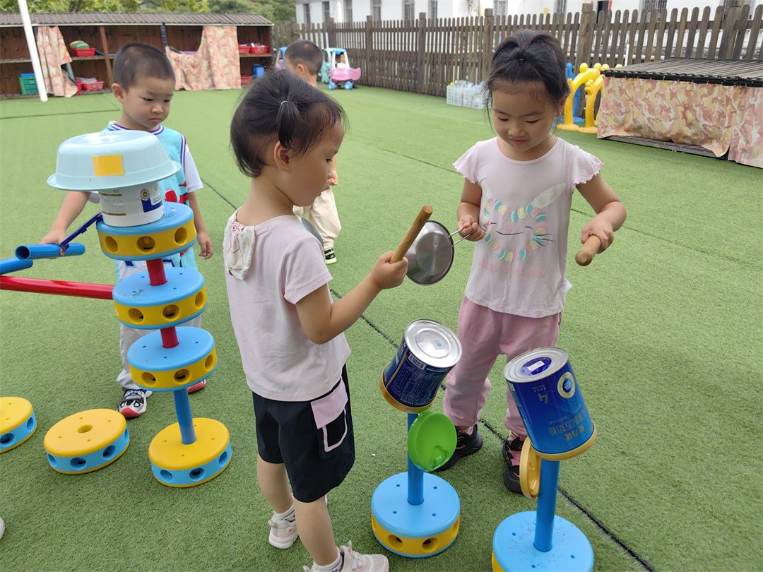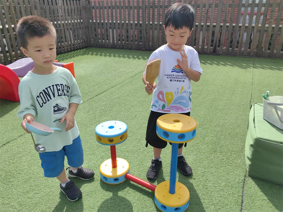 说干就干,孩子们找到了很多“宝贝”创意拼搭。彦熙把小脸盆倒扣在圆饼底座上,用力一敲“邦邦邦”;梓昱拿着铲子,在小铁锅和“鼓面”之间来回敲击“叮叮当,咚咚咚”;唐昱则是和小伙伴把不锈钢盆架在小鼓的最高处轮流敲打惊喜地发现:“我们力气不一样,敲出的声音也不一样。”