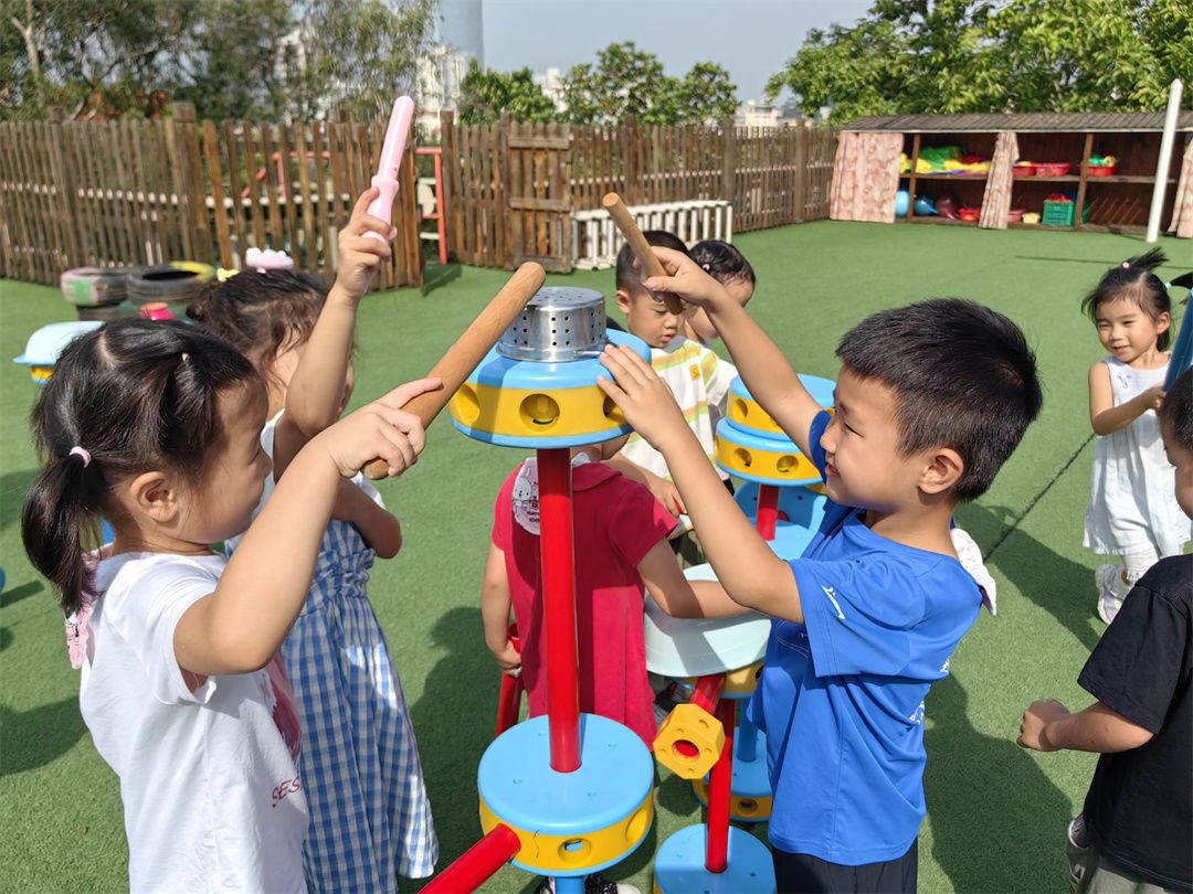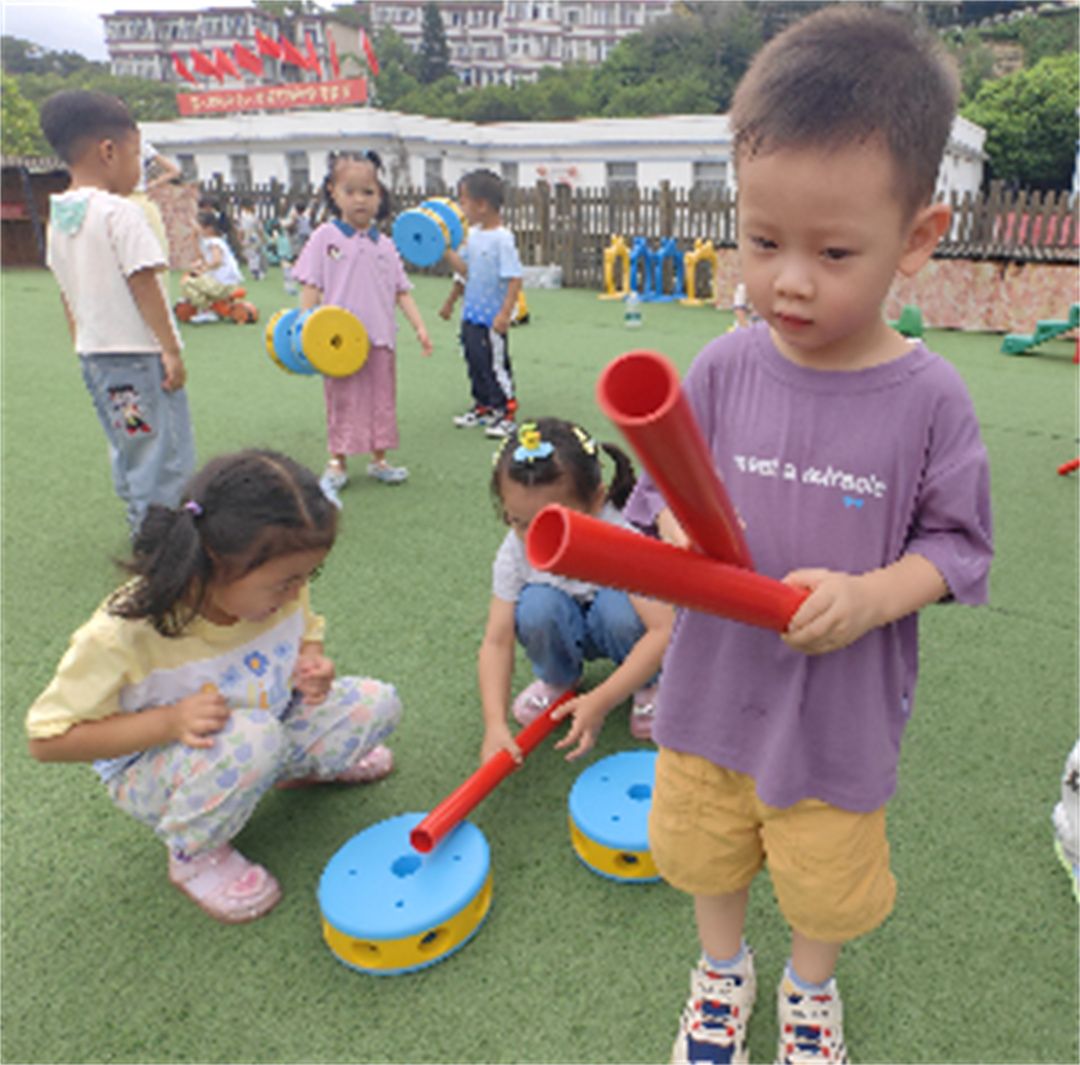 在户外游戏中,小二班的孩子们从偶然的敲打,到寻找生活材料与“万能工匠”创意组合制作“乐器”进行敲敲打打,突破了“万能工匠仅用于拼搭”的传统认知,开启了万能工匠的声音密码,他们在感知声音、合作互动、动手操作等方面都获得了宝贵的经验。