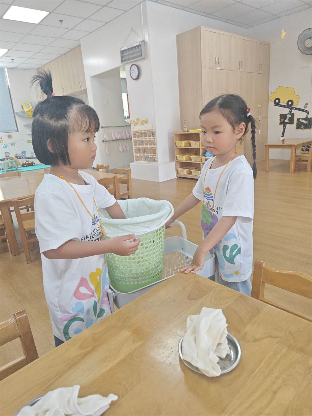 小朋友们的自理能力越来越棒啦!洗手时会边念儿歌边搓泡泡,小毛巾也挂得整整齐齐。喝水时间,都能记得”双手扶杯慢慢喝”的约定。最让人惊喜的是,当起小值日生来也有模有样:分发餐具时认真数数,整理玩具时一丝不苟,那份