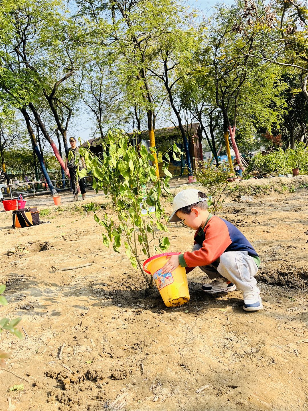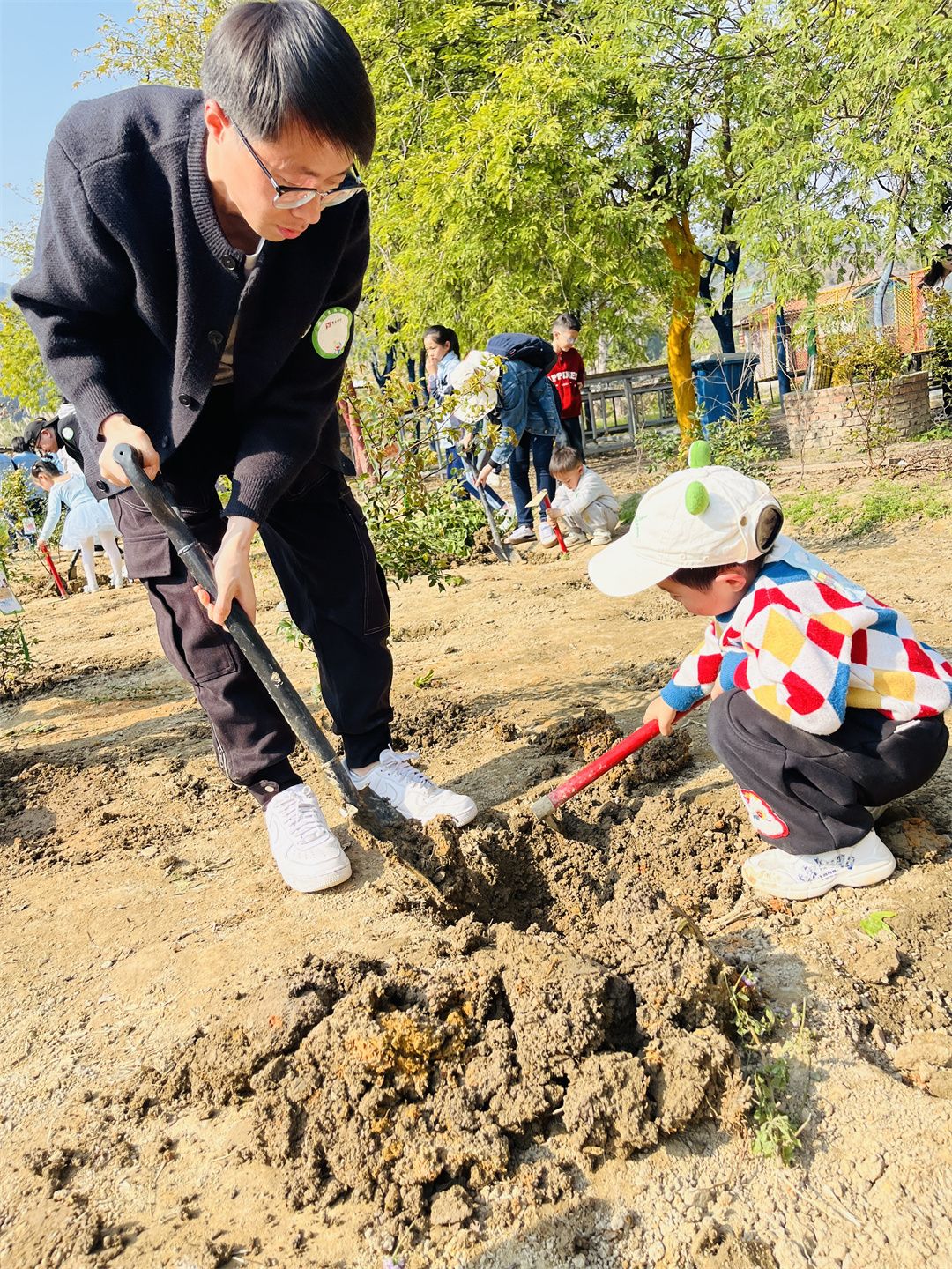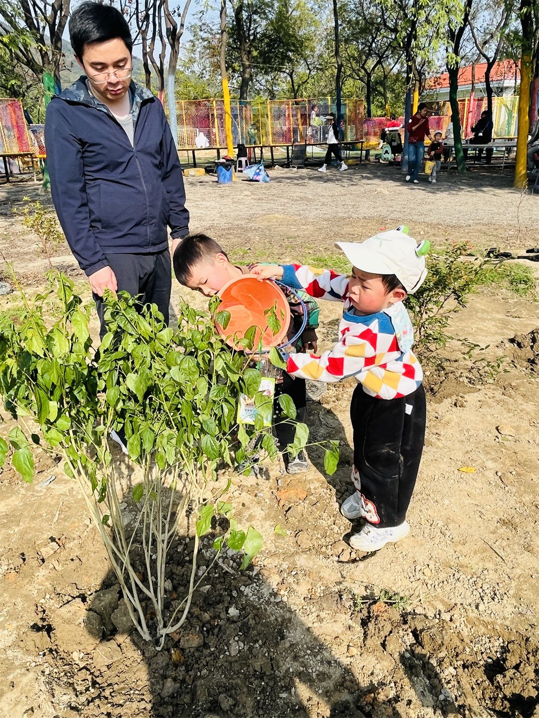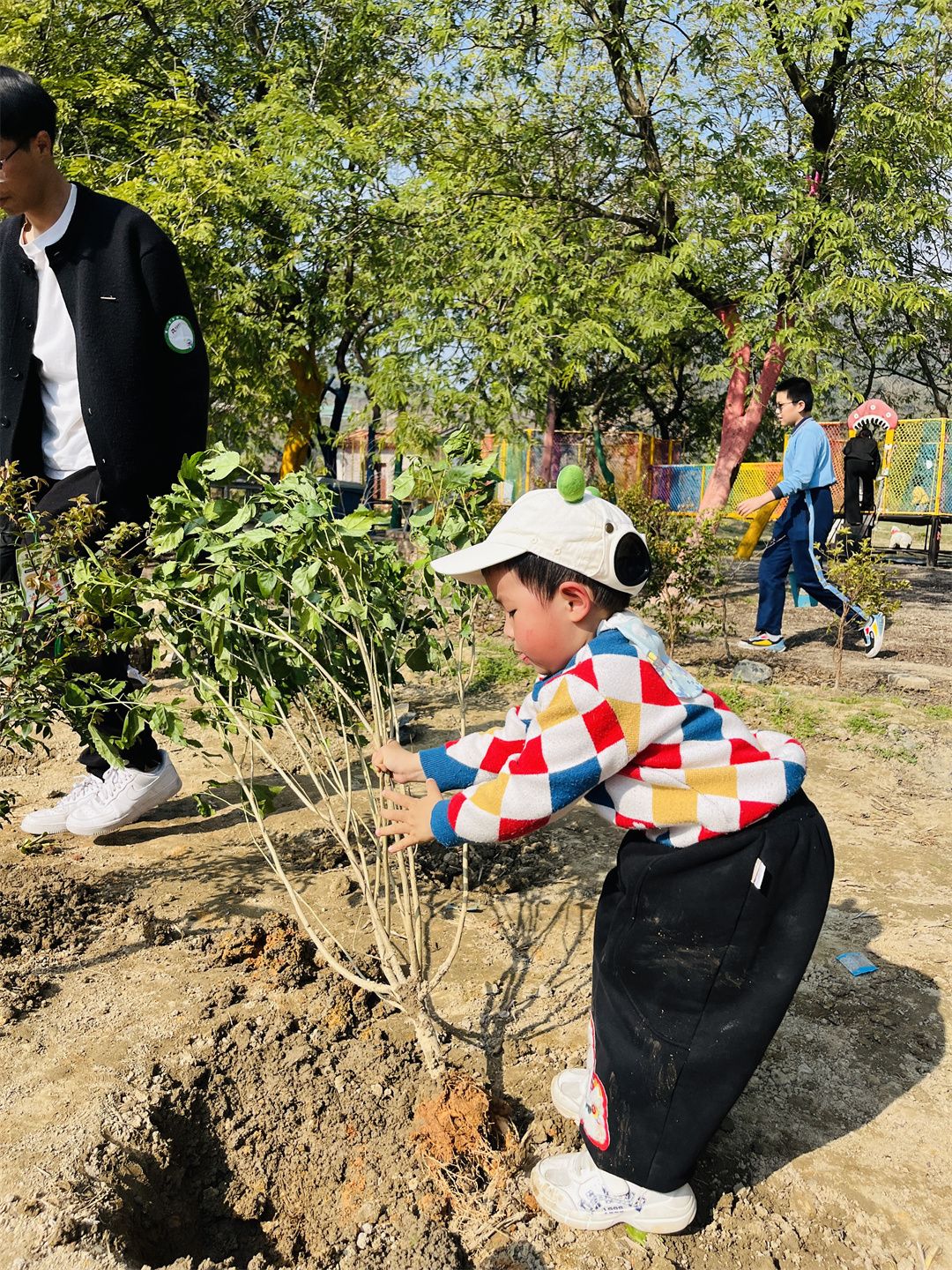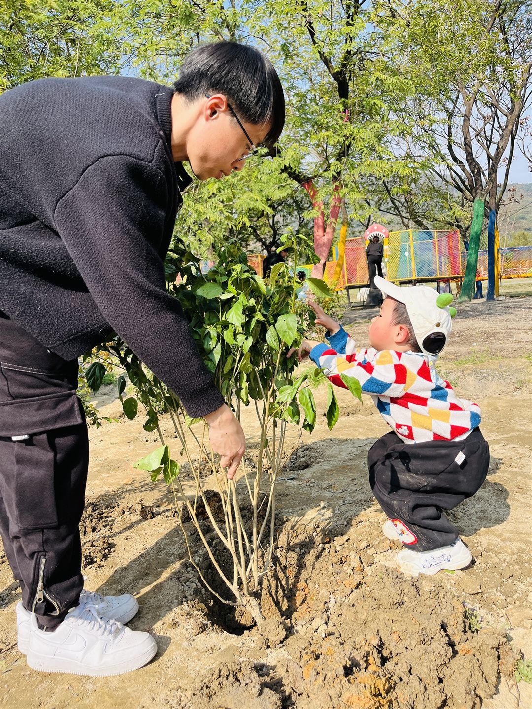 阳春三月,风和日暖,万物生长。春天带着绿色与蓬勃的气息向我们走来。在绿意盎然的土地上,小一班的家长和孩子们携手合作。劲头十足地挖土坑,一起填土、浇水。每一颗种下的树苗,就像孩子们一样,向下扎根汲取力量,向上努力茁壮成长。