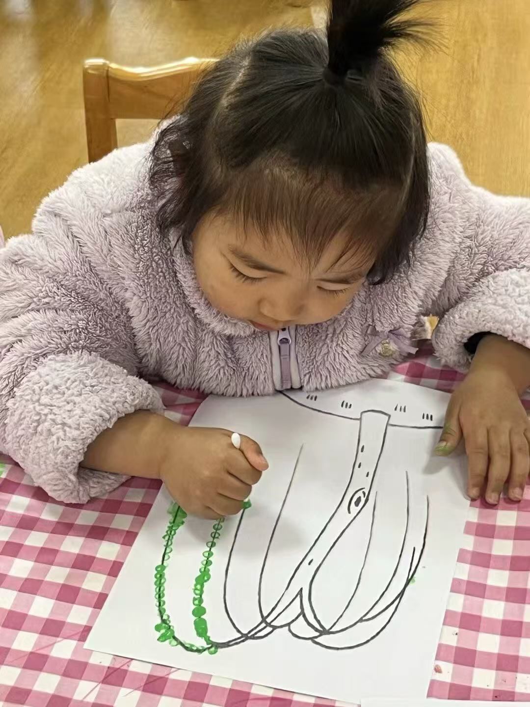 伴随着温柔的春风,小七班宝贝正在棉签点画,他们兴奋地拿起棉签,蘸上绿色,小心翼翼地点缀在柳树枝干上。一瞬间,一棵棵柳树跃然纸上,生机勃勃,仿佛真的迎来了春风。小朋友们脸上洋溢着笑容,享受着创作的乐趣,也感受到了春天的美好。