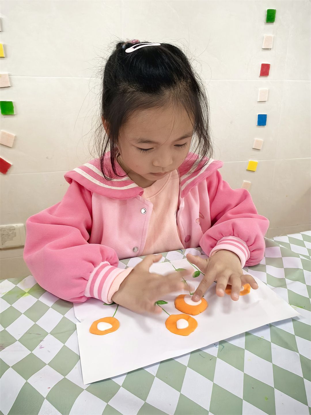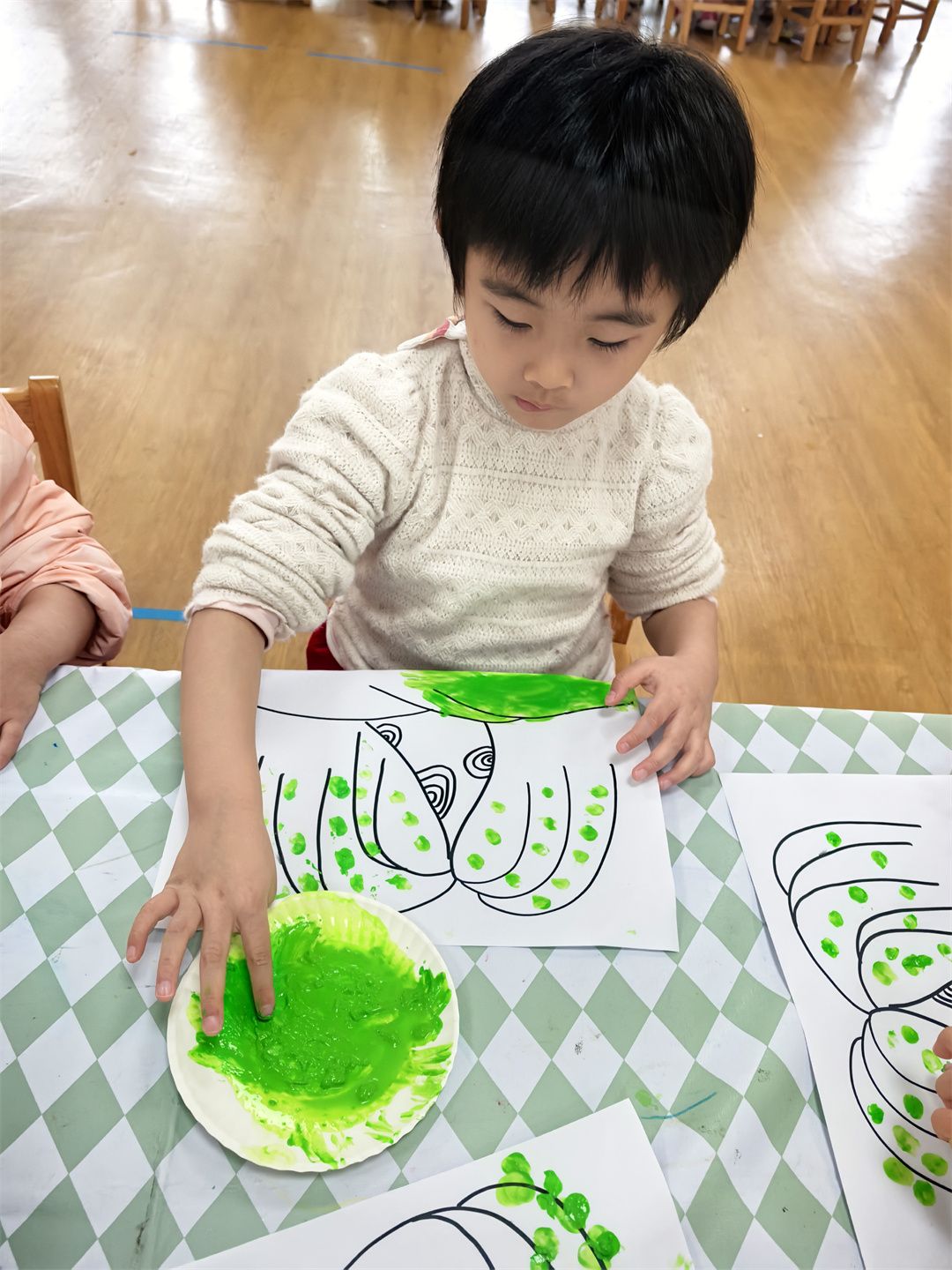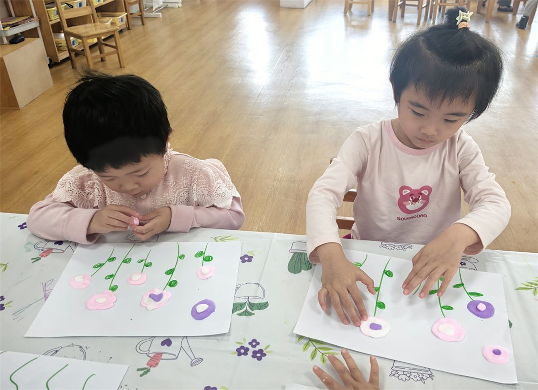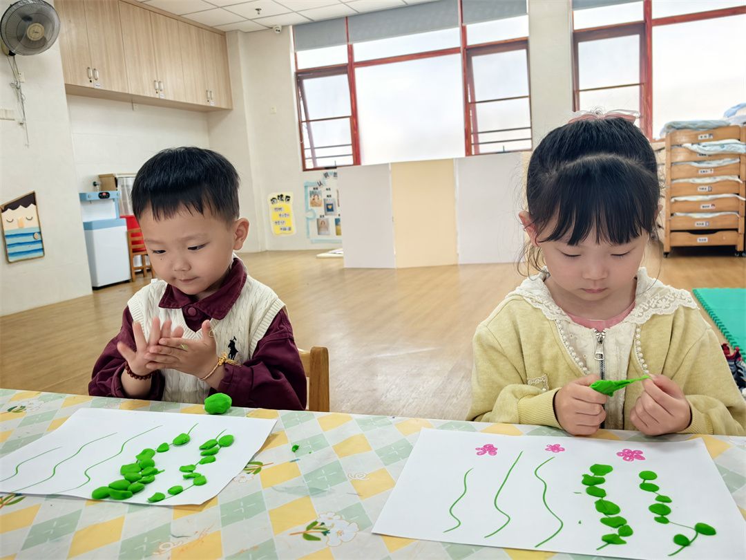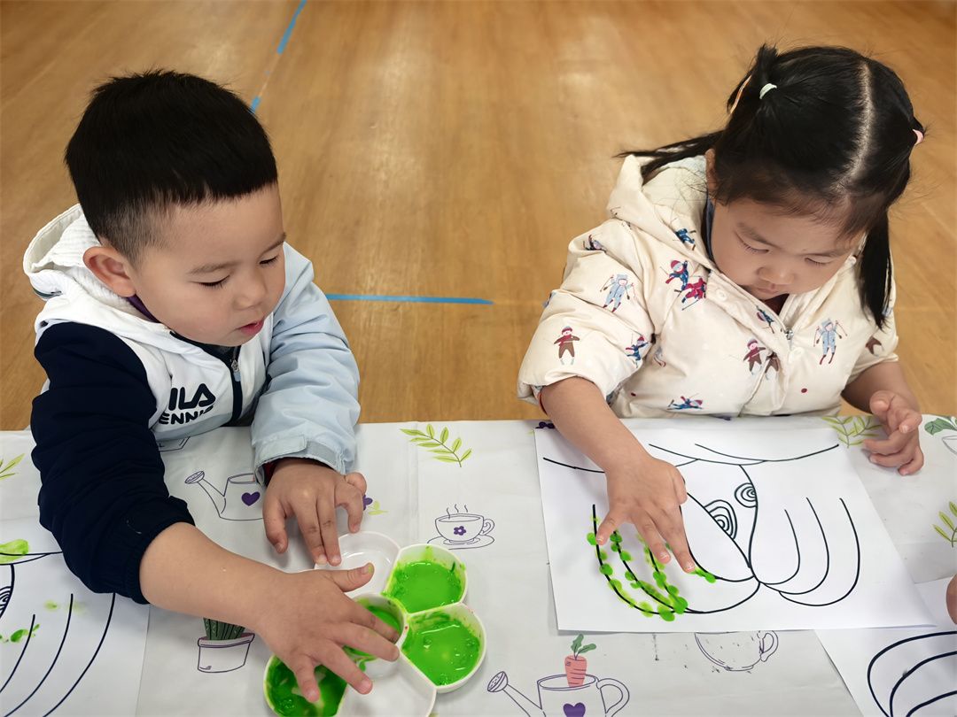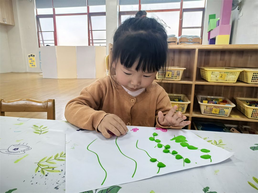 小朋友们最爱的美术活动,为这场春日探索画上了绚丽的句号。孩子们以春天为灵感,用画笔、颜料和黏土尽情创作。有的孩子用黏土捏出自然角里的植物,有的则用小小手指点画出了绘本里春天的美景。