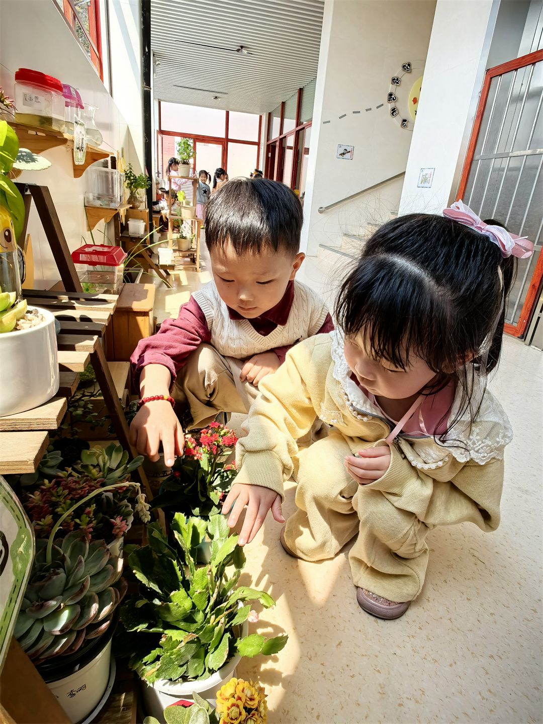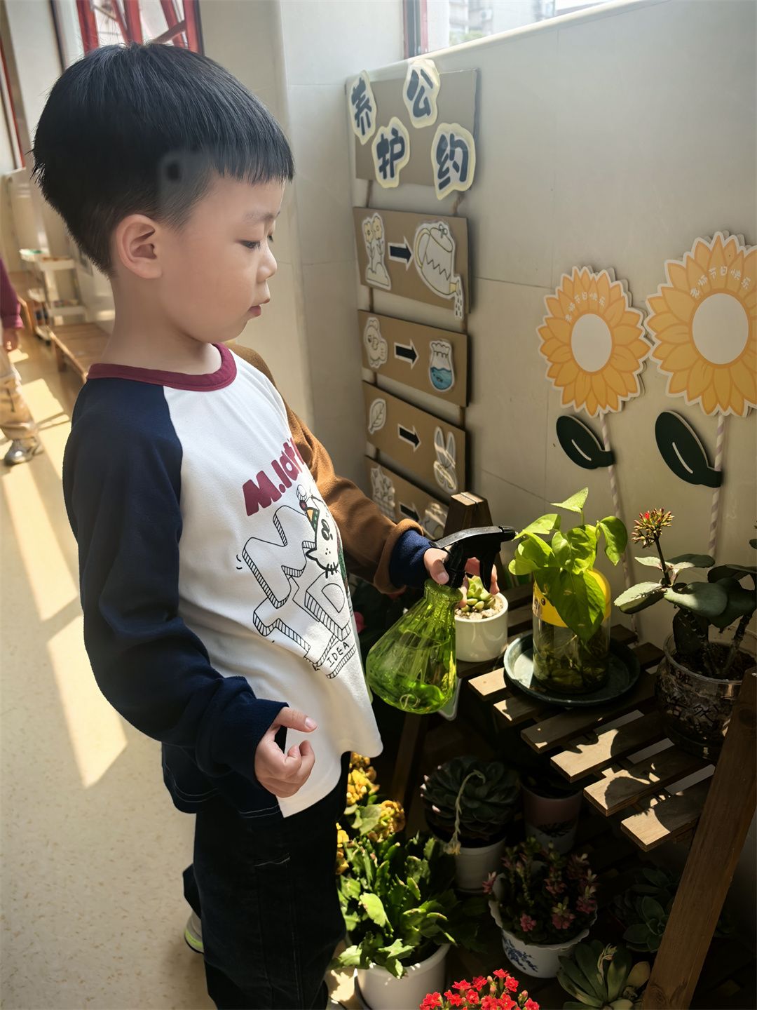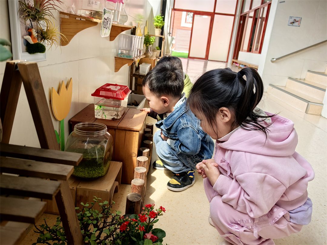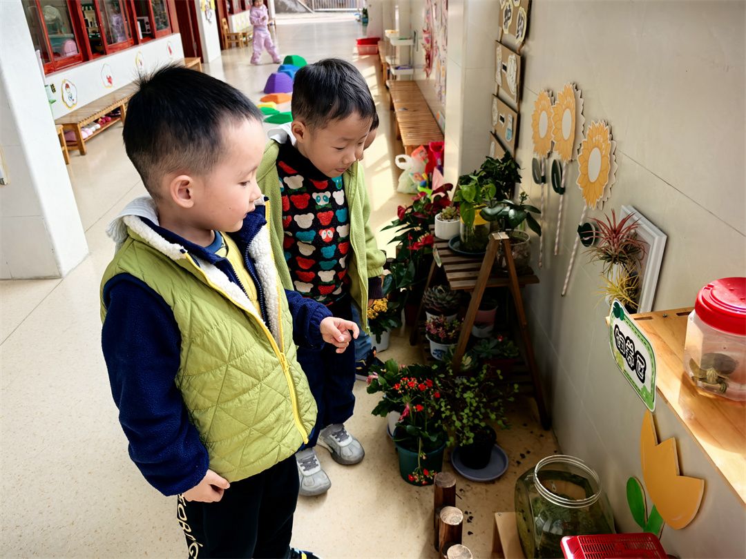 回到室内,自然角成了孩子们的探索乐园。这里摆放着各种植物,小朋友们围在周围,仔细观察着植物的变化。“看,小叶子又长大了!” 元柏小朋友兴奋地叫着。他们一边观察,一边和小伙伴分享自己的发现,感受着春天赋予生命的神奇力量。