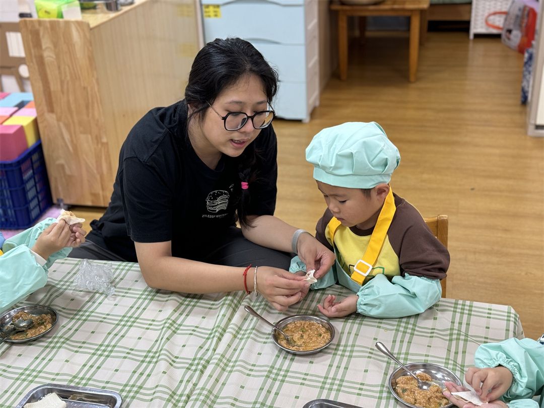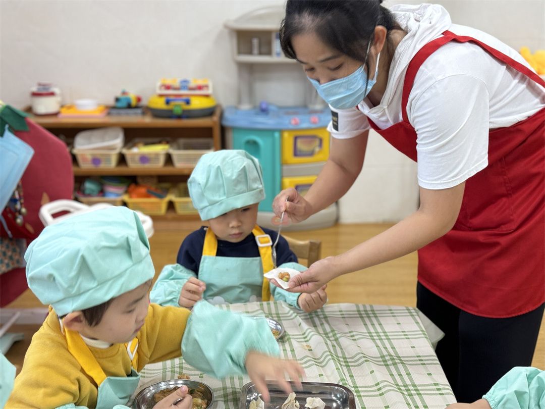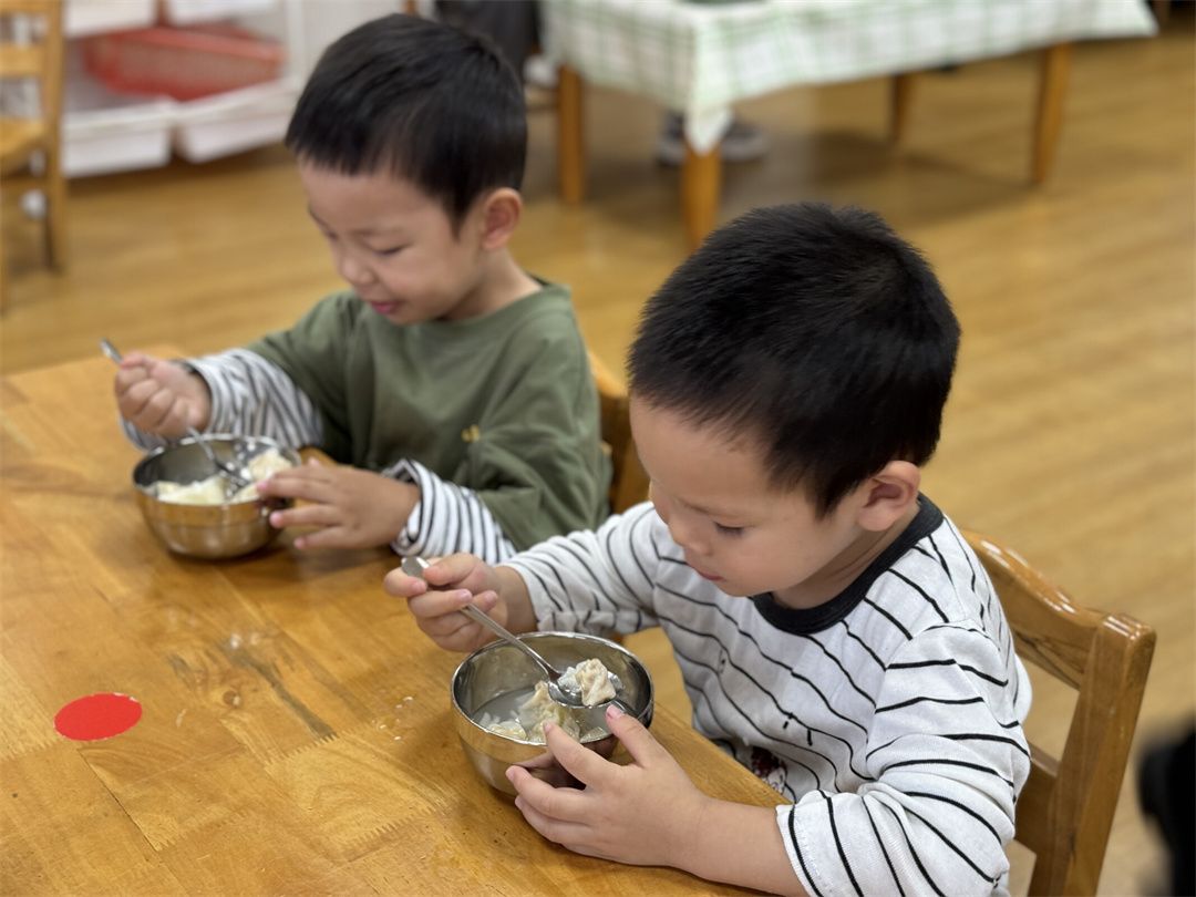 瞧,孩子们迫不及待地拿皮、放馅、捏紧。一双双小手像是在跳舞、变魔术,包好一个又一个。