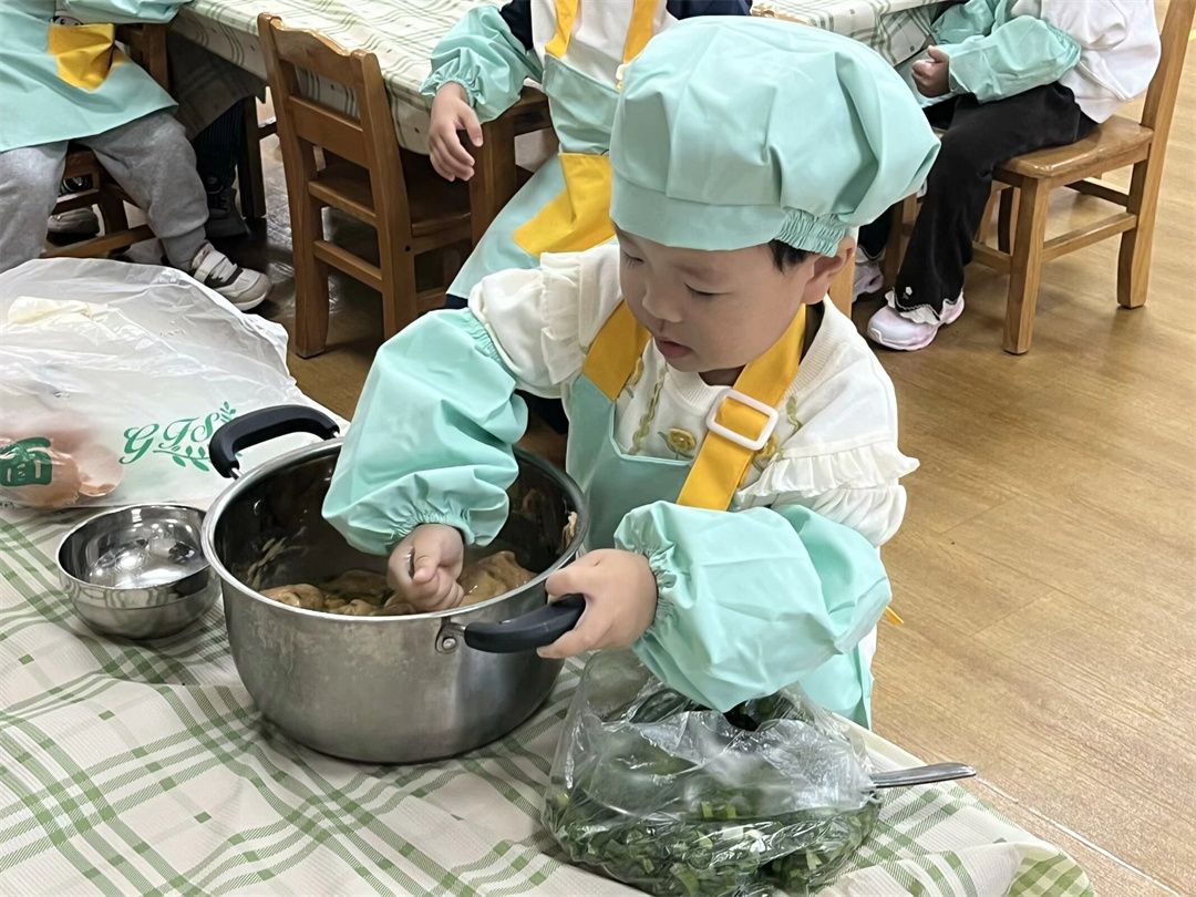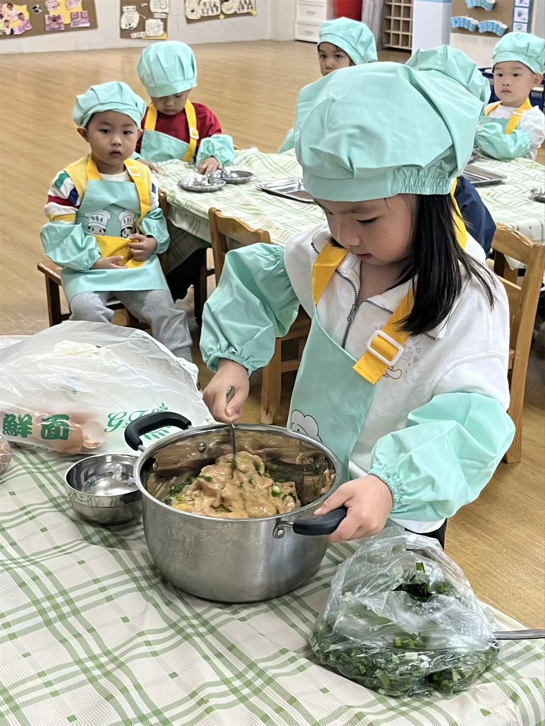 孩子们兴奋的穿上了小厨师服装,看到已经准备好的肉和扁食皮,孩子们按耐不住心中的喜悦,开始跃跃欲试啦。
