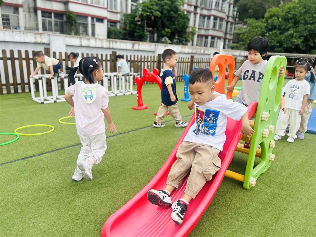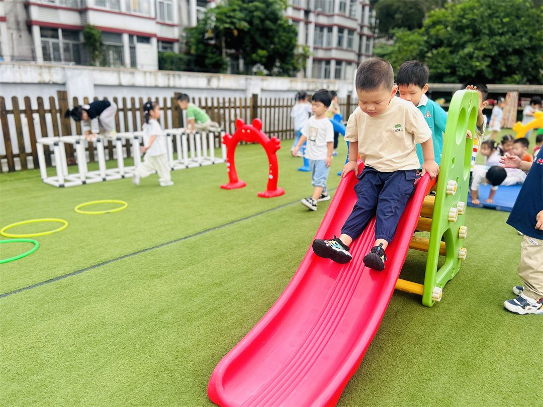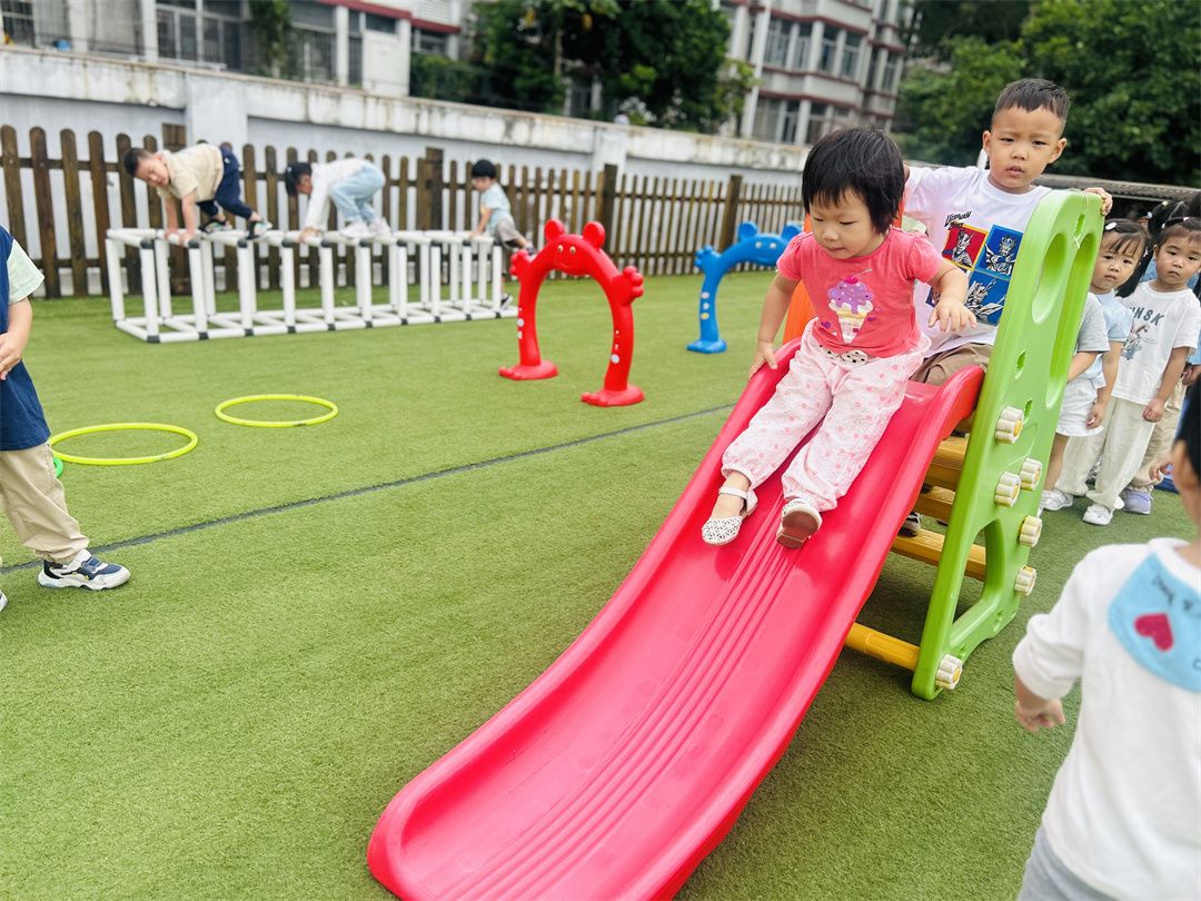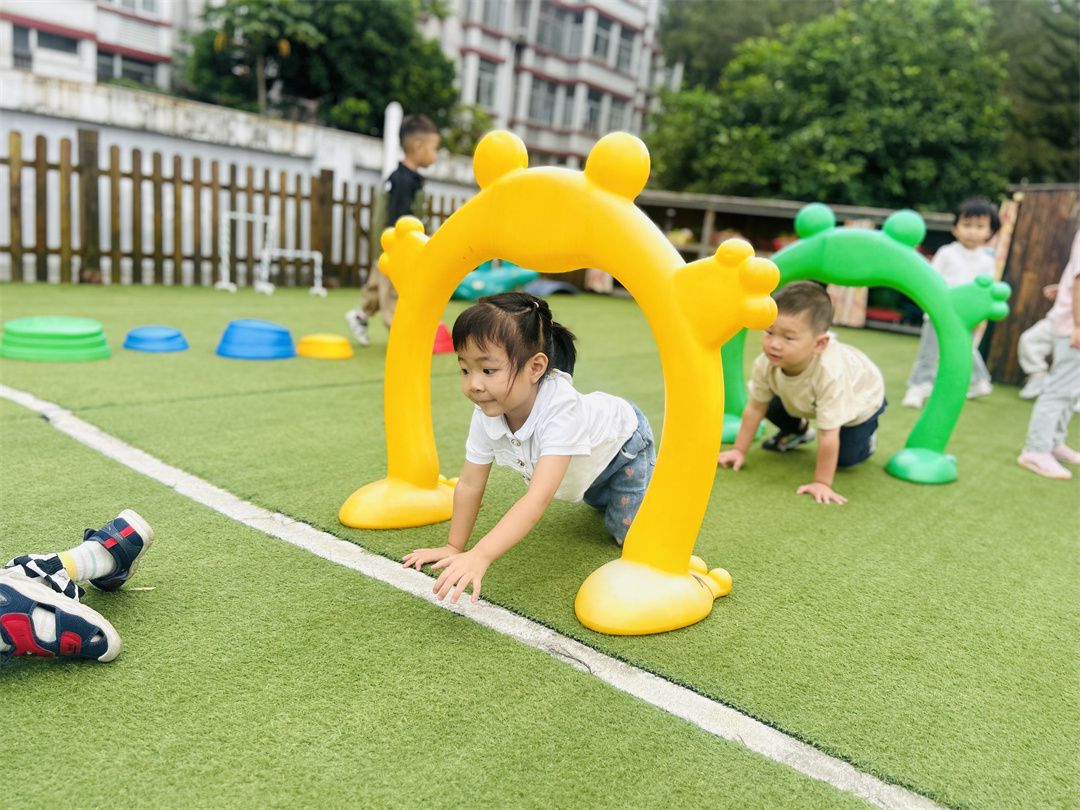 宝贝们接连穿过小熊拱门,越过一个个小“石坑”,穿过“河流”,来到了滑梯,“咻——”一下与快乐撞个满怀。