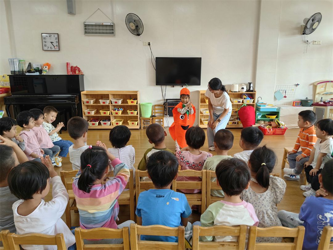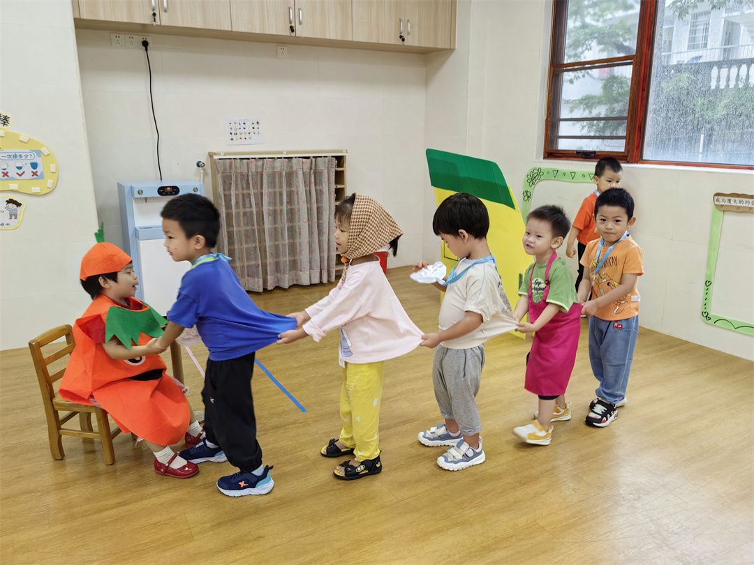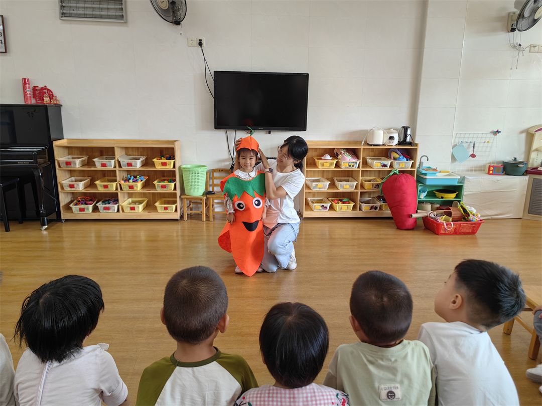 瞧,高老师带来了超大的萝卜引起了孩子们极大的兴趣,漂亮的萝卜衣服吸引着孩子们跃跃欲试“瞧,我穿上漂亮的萝卜衣服,像不像老公公的大萝卜?”