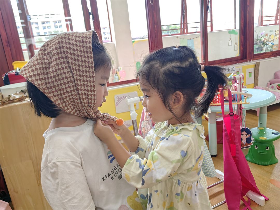 “娃娃家有一条头巾,我绑在头上像不像老奶奶?”