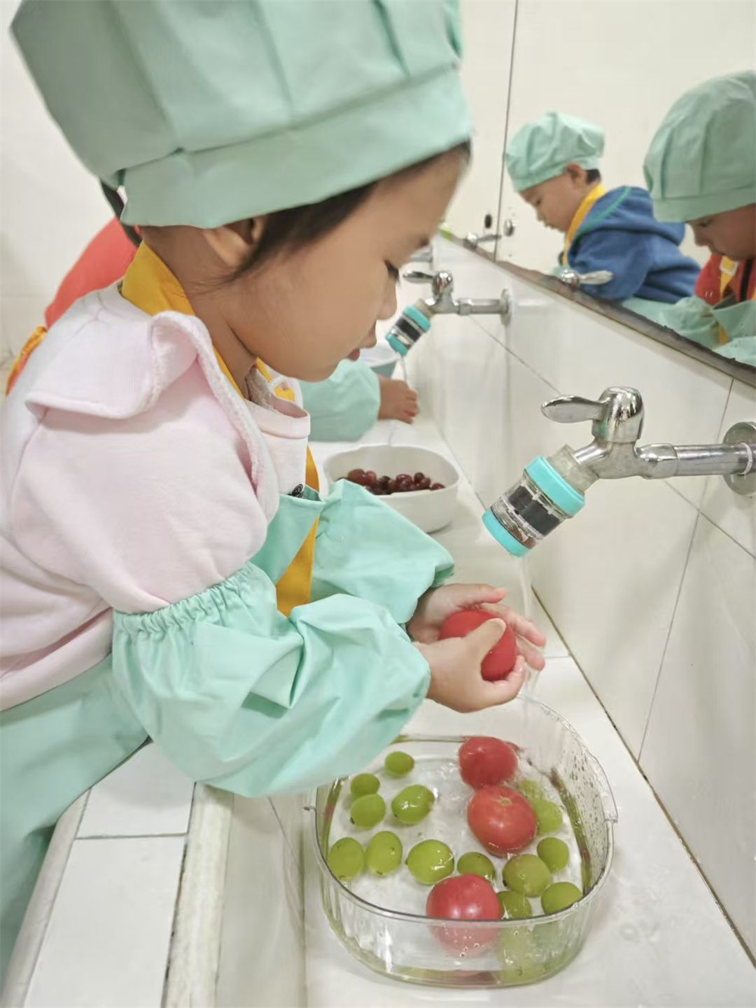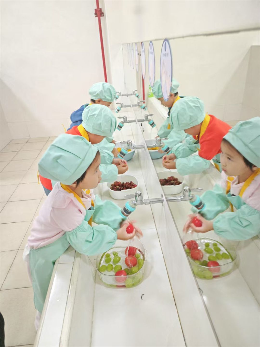 先来把水果“洗个澡”,小朋友们小心翼翼地捧着水果,用流动的水轻轻冲洗,还不时地用小手揉搓,把水果洗的干干净净。