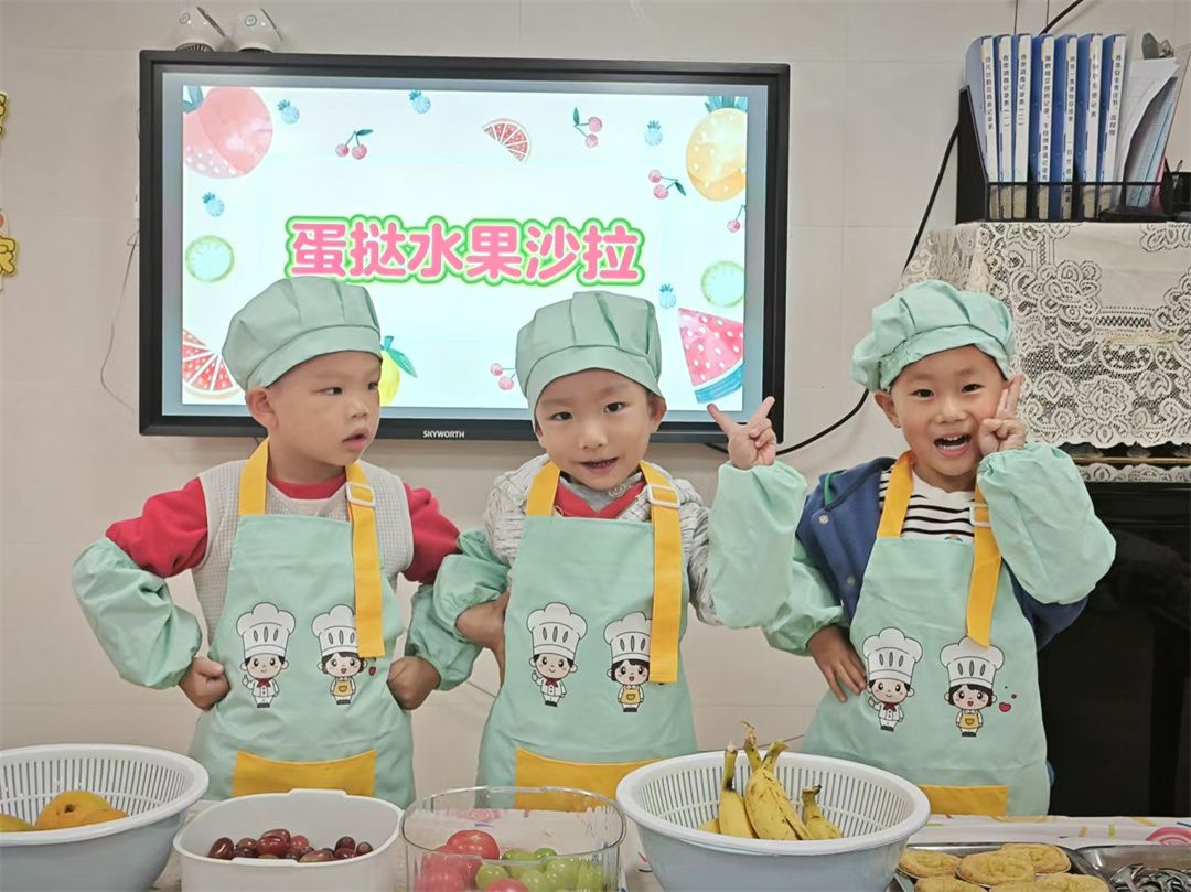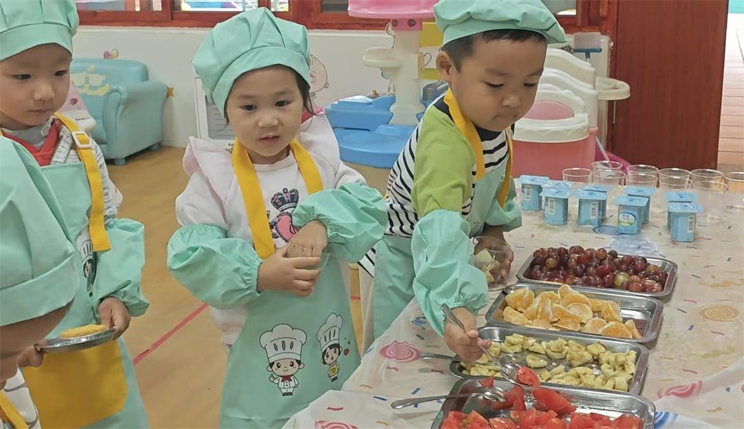 你瞧!他们早就精心准备还了各种新鲜水果:香蕉、红提、圣女果、橘子、葡萄等,这些色彩鲜艳、形状各异的水果瞬间吸引了小朋友们的目光。只见小朋友们穿着可爱的小围裙,戴上帽子,一个个跃跃欲试,准备开始他们的“小小厨师”之旅。
