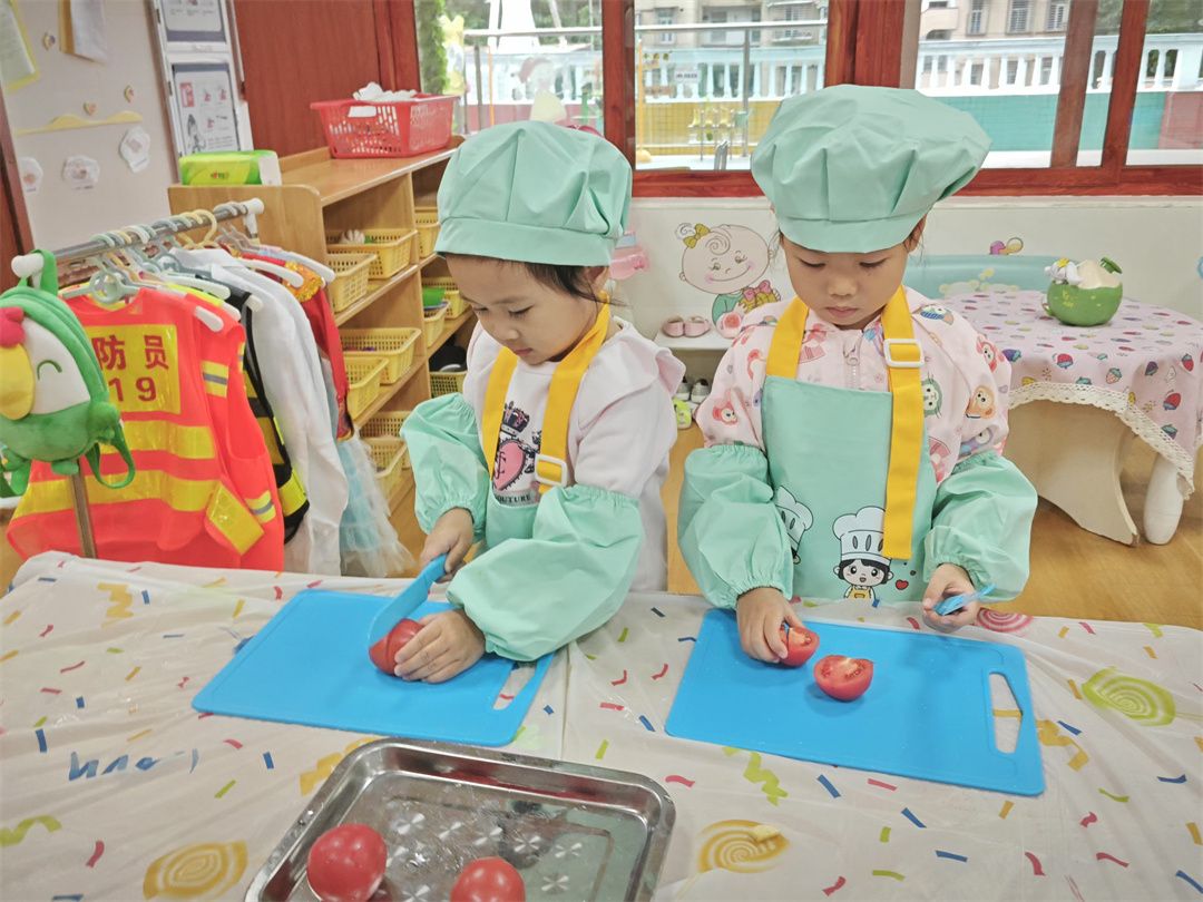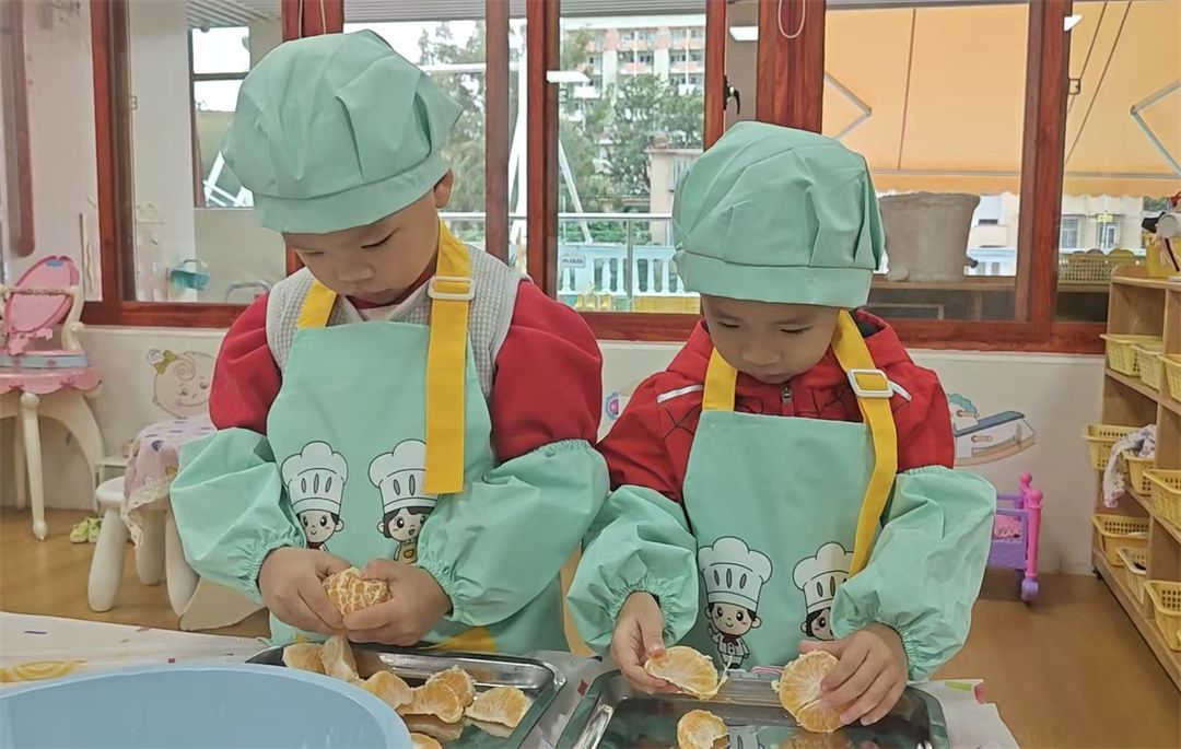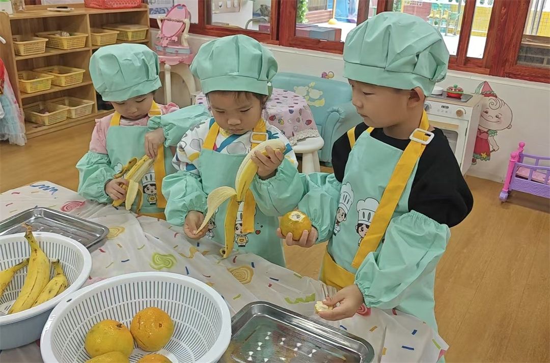 接下来小朋友们来当小厨师“切水果”。别看他们年纪还小,切起水果还有模有样呢。只见以沫、宁煦拿起了安全刀具,将水果切成适合入口的小块形状。有的小朋友负责剥香蕉皮,有的负责切香蕉,还有的负责将橘子掰成小瓣。大家分工合作,忙得不亦乐乎,小七班的活动室里充满了欢声笑语。