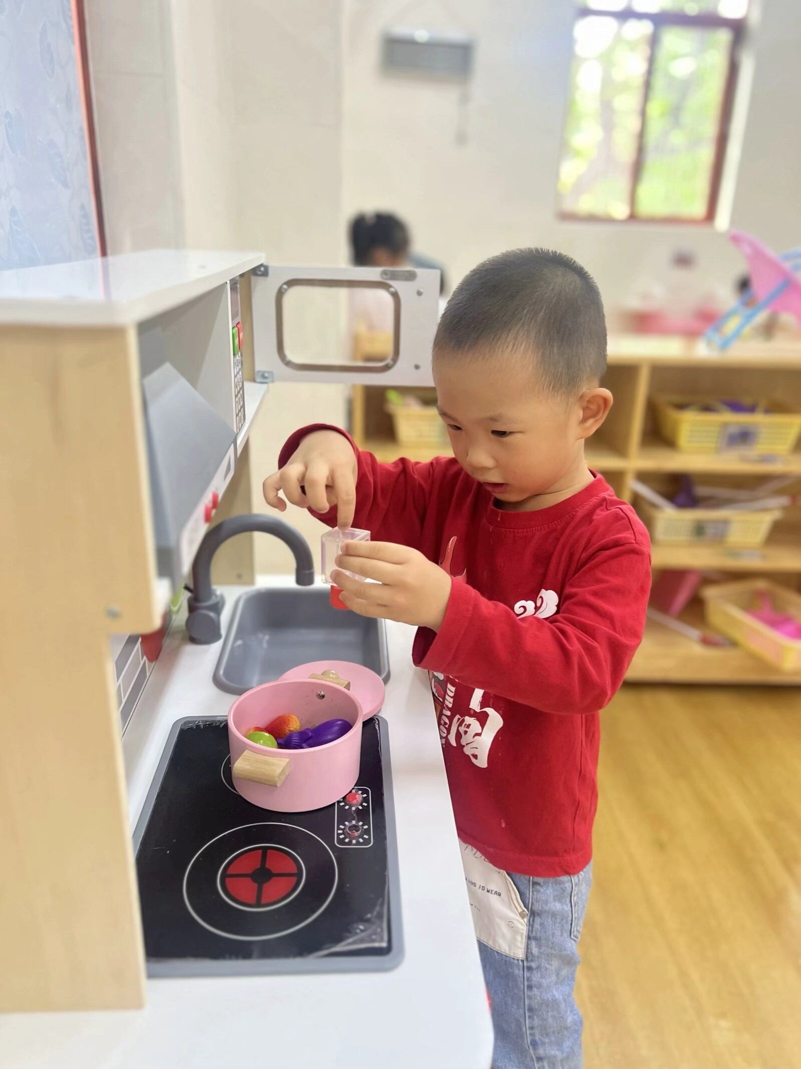 娃娃家里大家都在忙碌着。有的正专心致志地在烹制的着可口的饭菜,有的在给宝宝喂饭,还有的在为宝宝精心打扮着……