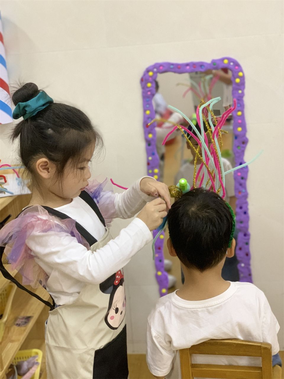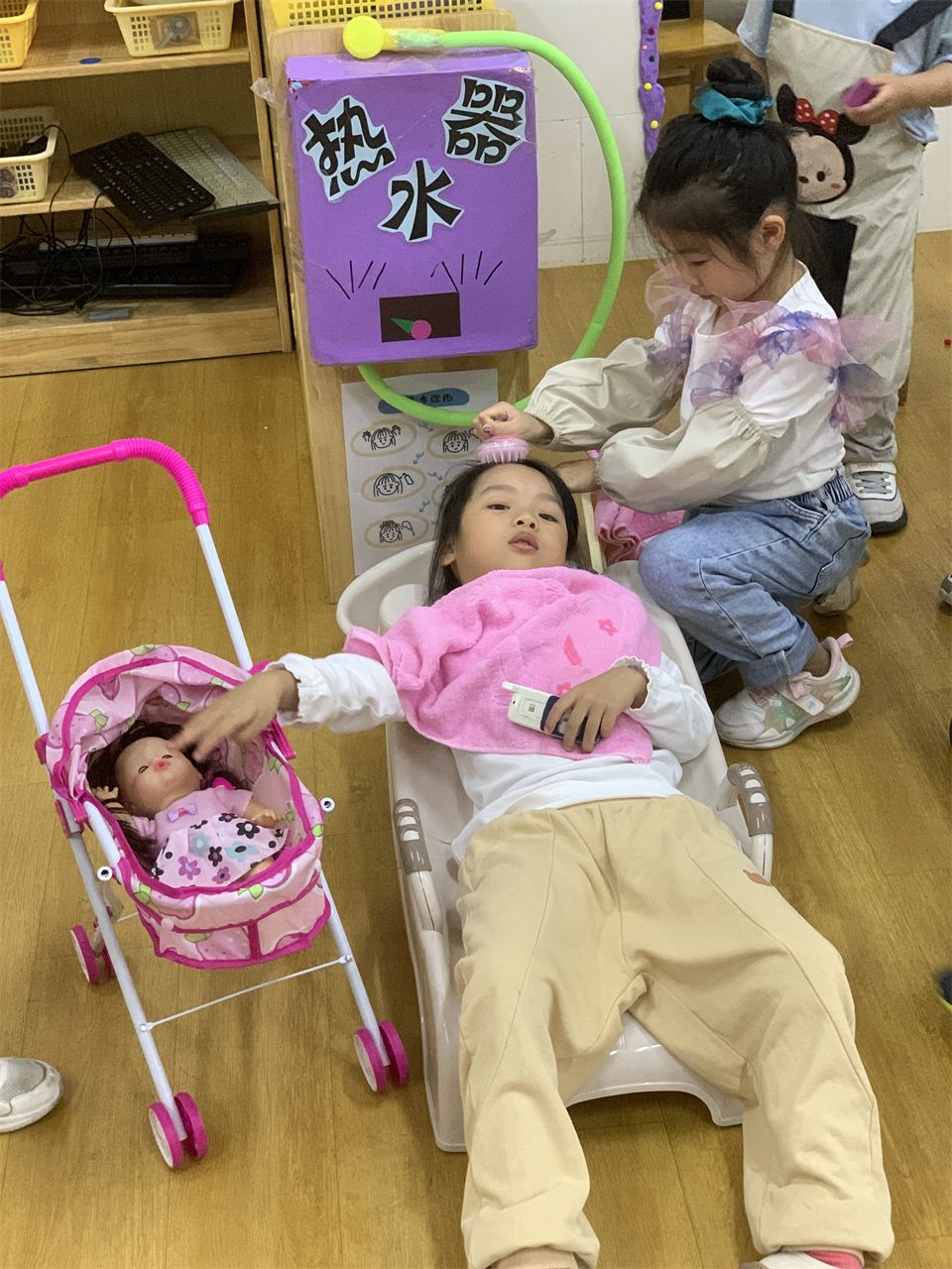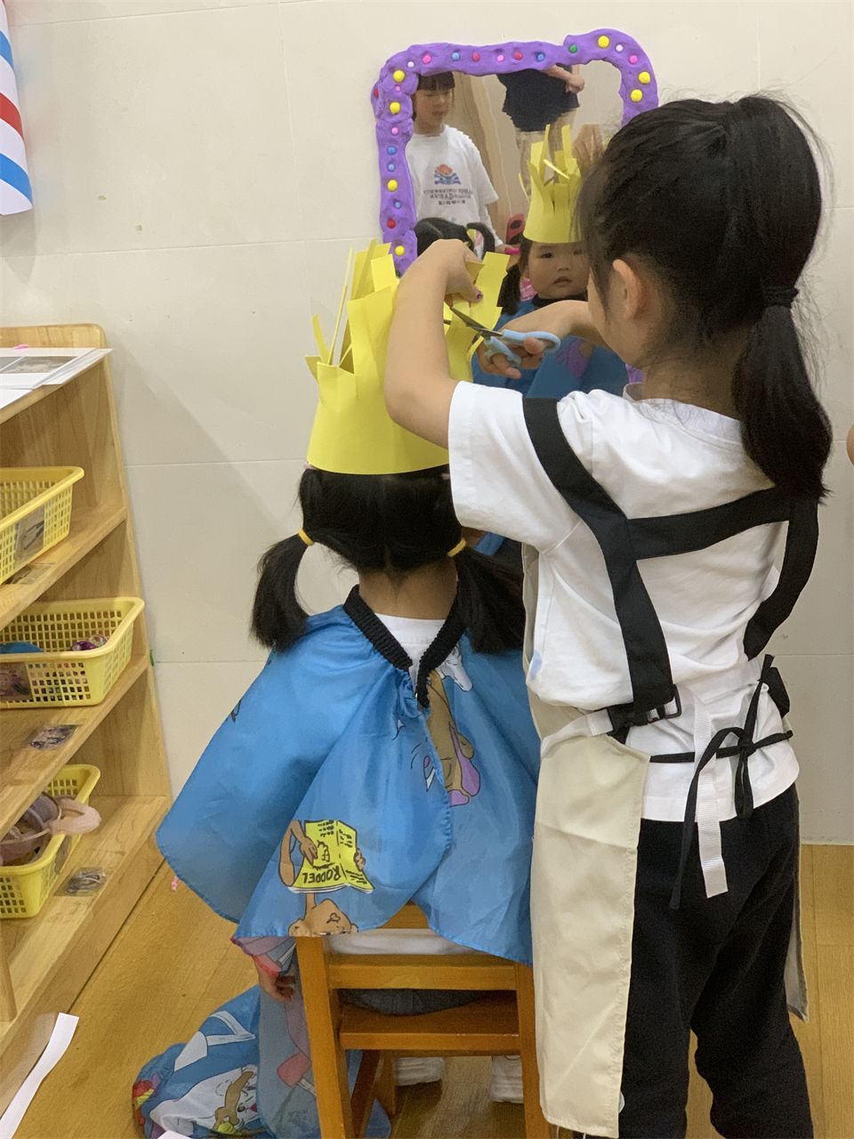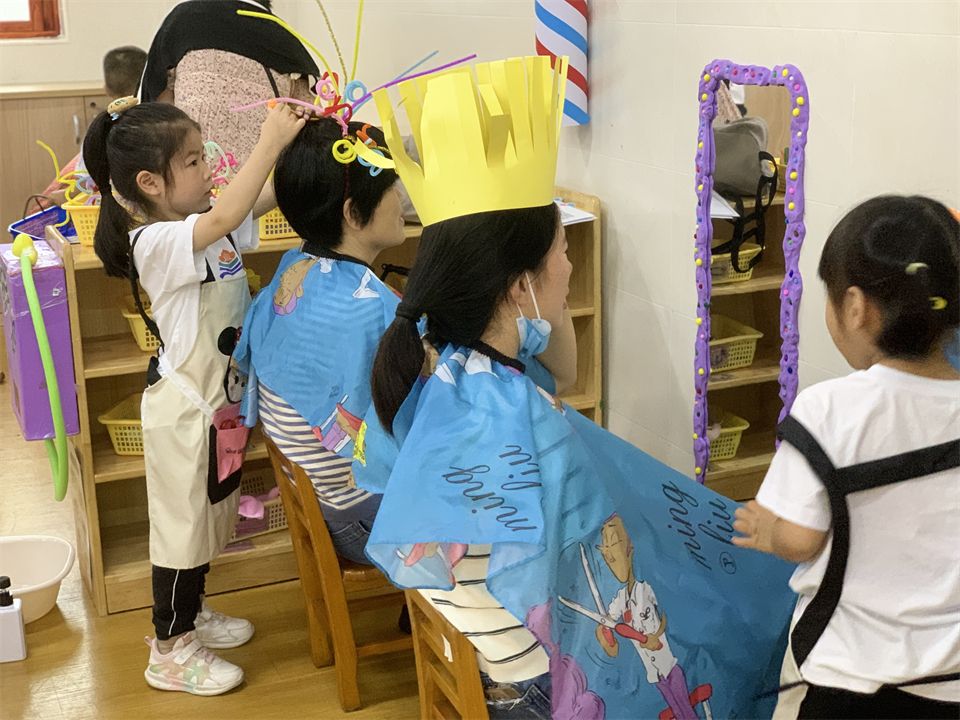 理发店终于营业了,宝贝们迫不及待地进入角色,客人纷沓而至,理发店里好不热闹。