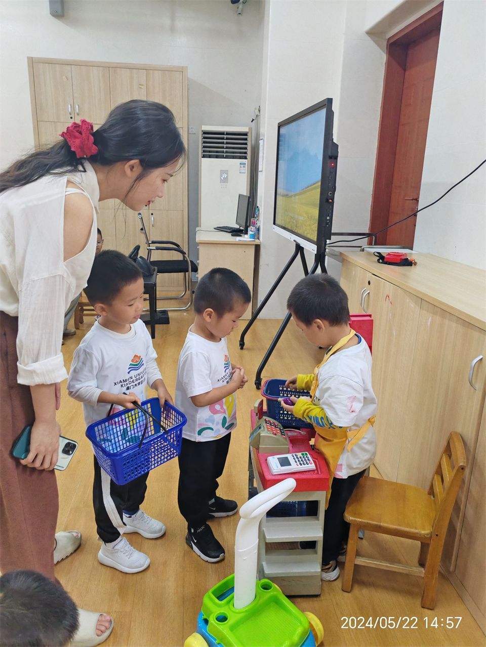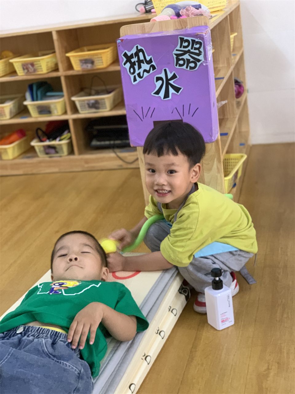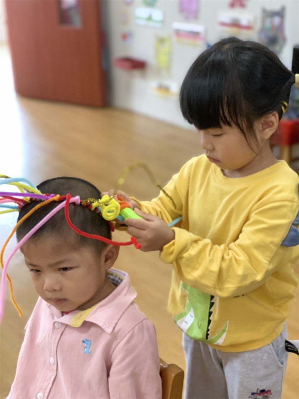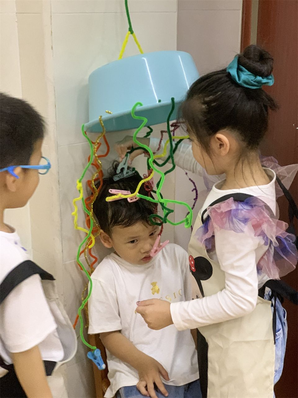 理发店终于营业了,宝贝们迫不及待地进入角色,客人纷沓而至,理发店里好不热闹。
