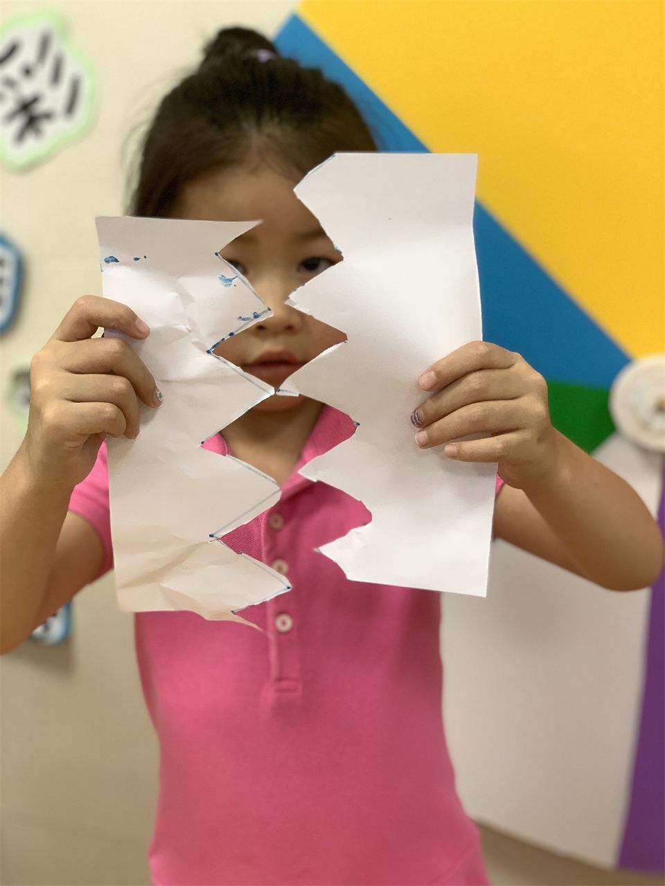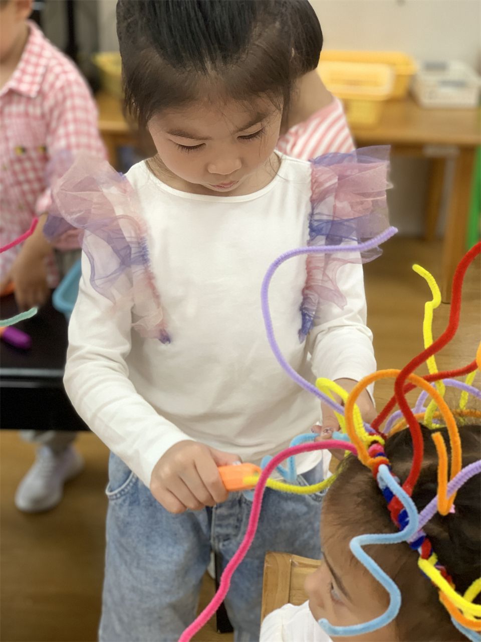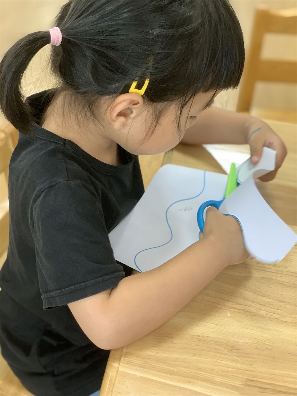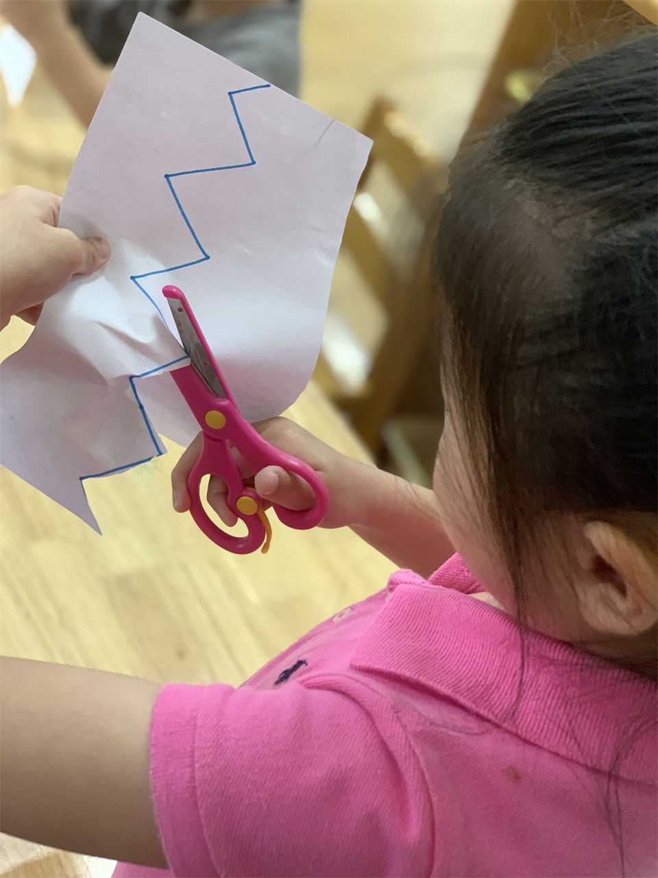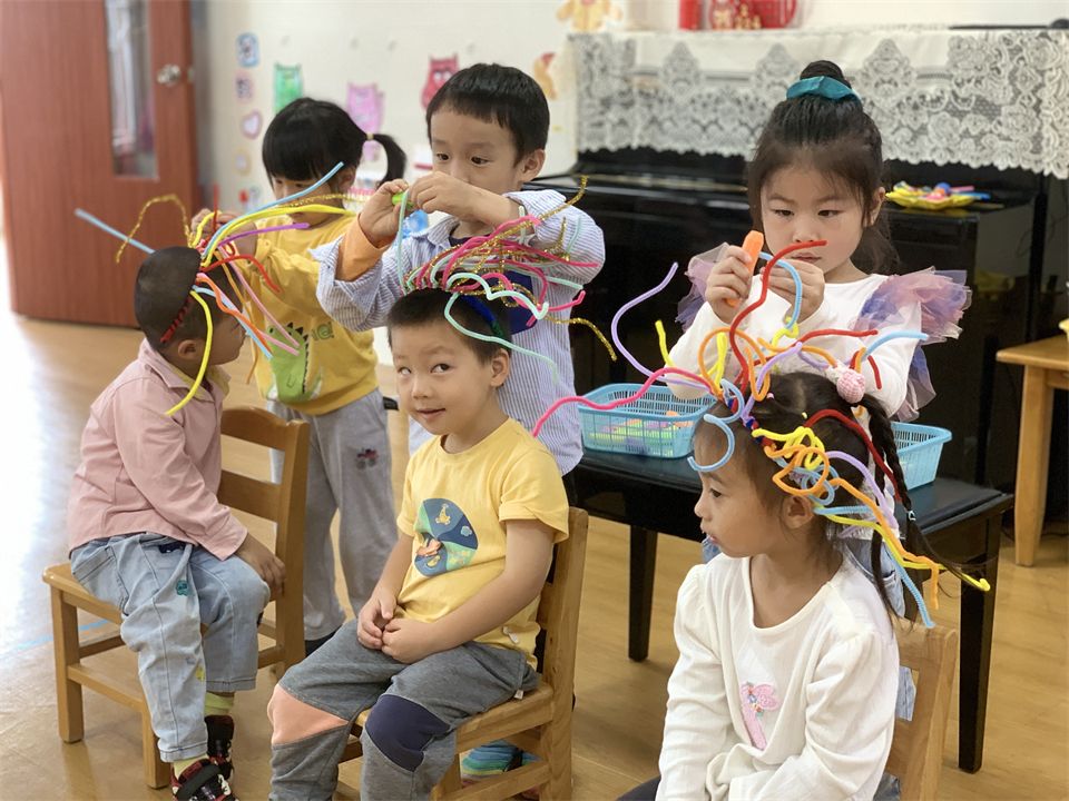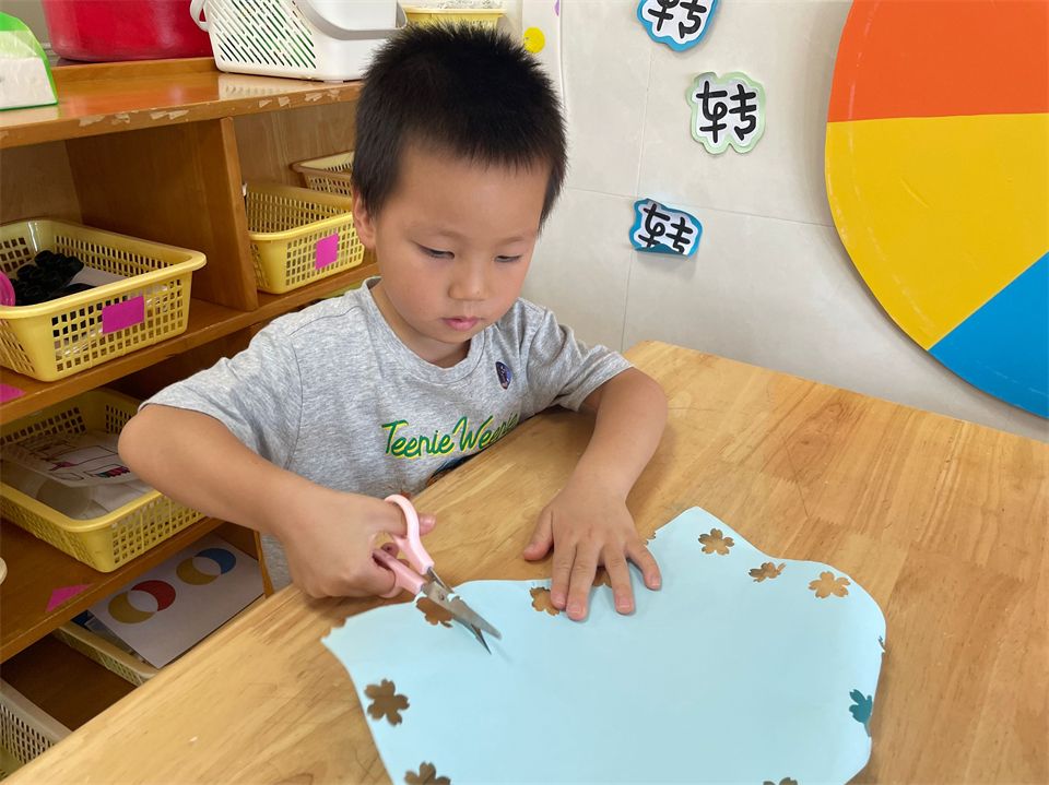 宝贝们在美工区中学习正确使用剪刀,沿直线、折线等练习剪纸,促进精细动作和小肌肉的发展,为成为一名理发师积累经验。