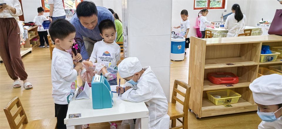 家长开放日的那天,宝贝们还自行地邀请爸爸妈妈也参与其中。游戏中,孩子们真实的笑容,投入的状态,自信的展现,自由自主开放的游戏,深深地感染着在场的每位家长,他们时而驻足聆听,时而加入游戏,一起感受游戏的魅力。