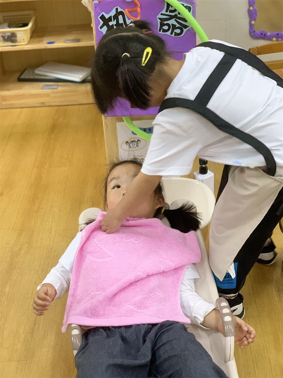 “客人躺着洗头发,有好多泡泡,洗头发的时候要用毛巾垫好。”