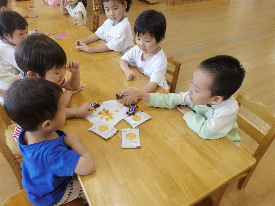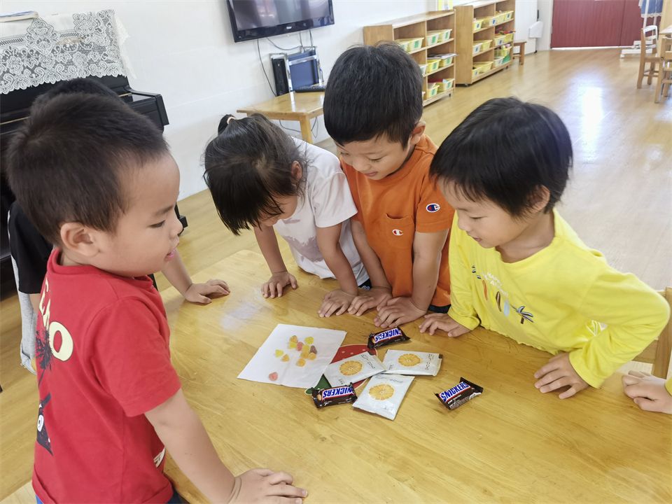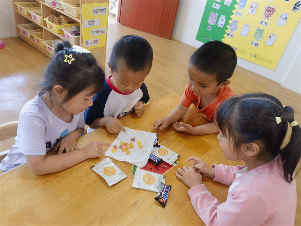为了进一步了解糖果,小朋友们还把糖果带到班级,和小伙伴们一起摸一摸,闻一闻,尝一尝不同的糖果。